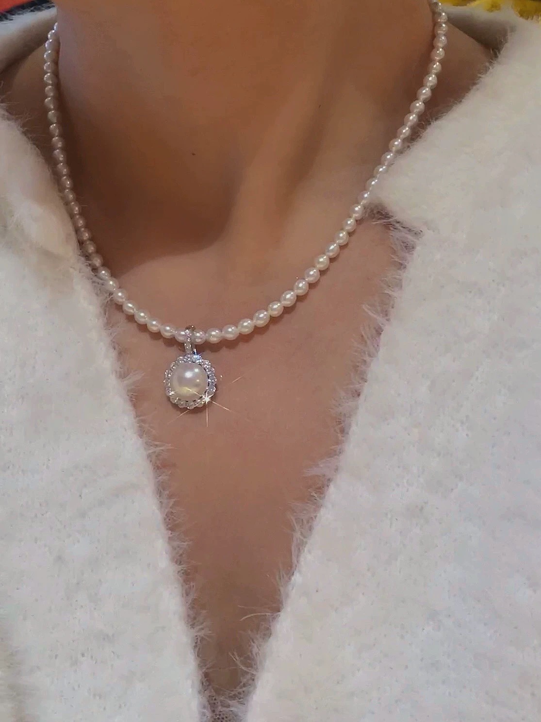 4-4.5mm白亮米珠➕极光纯银锆石太阳花吊坠,