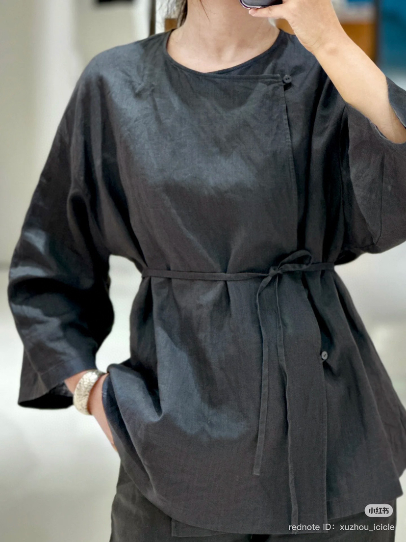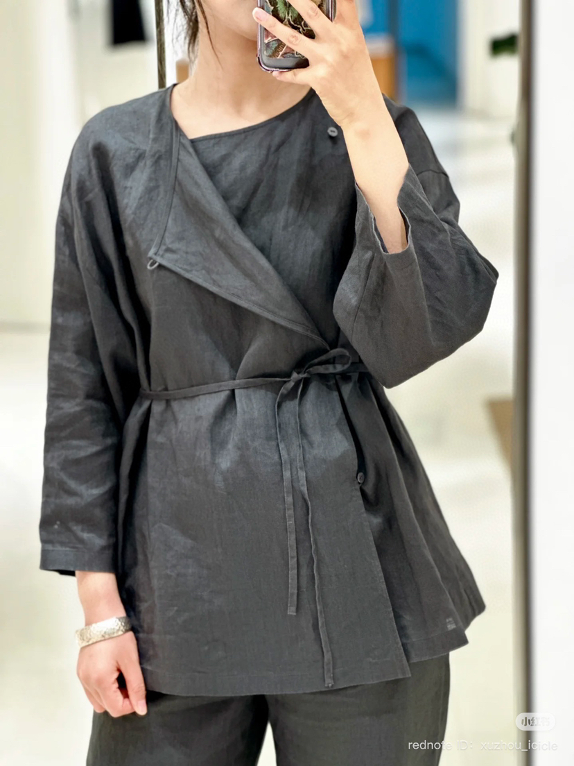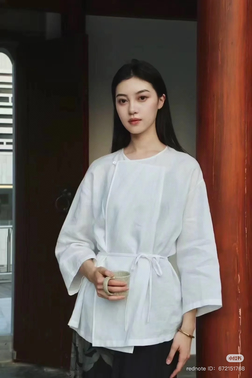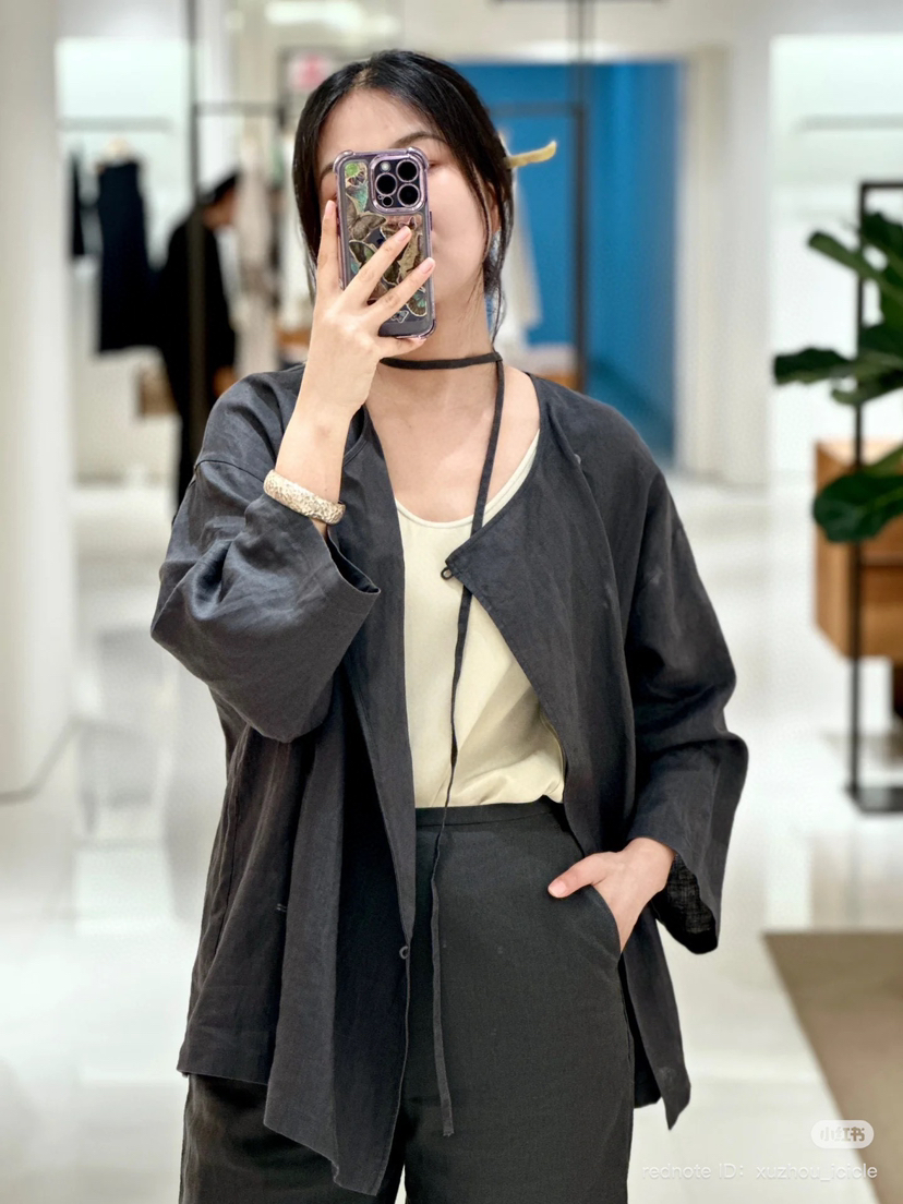 一本正经全部扣上有点像女总,但是敞开穿则是完全不一样的感觉,松弛感拉满。很素雅,很有意境, 一根纤细腰带,可收腰,也可以就这么飘着