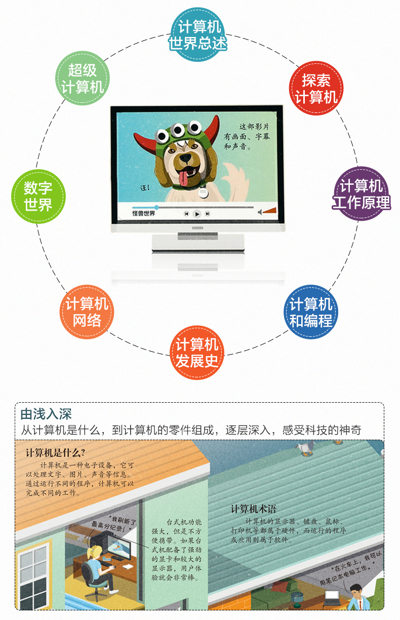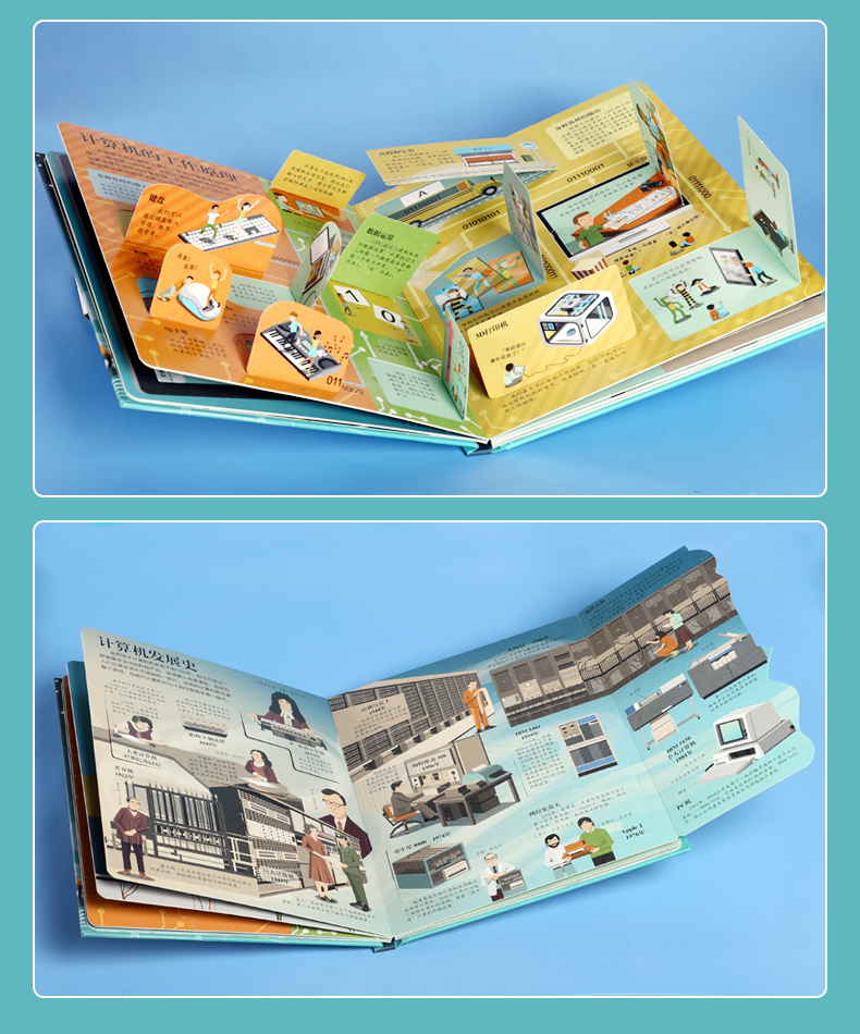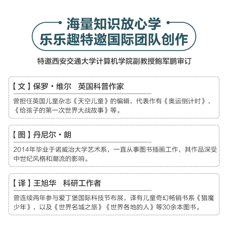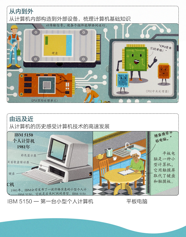 主题清晰,通过8个方面介绍计算机基础知识及计算机科学在社会各领域的延伸发展 内容丰富,从计算机科学在日常生活中的运用到未来计算机的发展,从计算机外观变化到内部电子元件的制作等,循序渐进地带孩子揭开计算机世界的神秘面纱 浓郁的复古画风,巧妙的翻页设计,让孩子手脑互动,轻松认知各种计算机知识 89张趣味翻页+2个大折页,互动阅读,帮助孩子更好地了解计算机的发展历程及其对世界文明进步的重大影响 权威专家审订,确保知识点准确性 大开本精装设计,绿色环保印刷,带给读者舒适安全的阅读体验