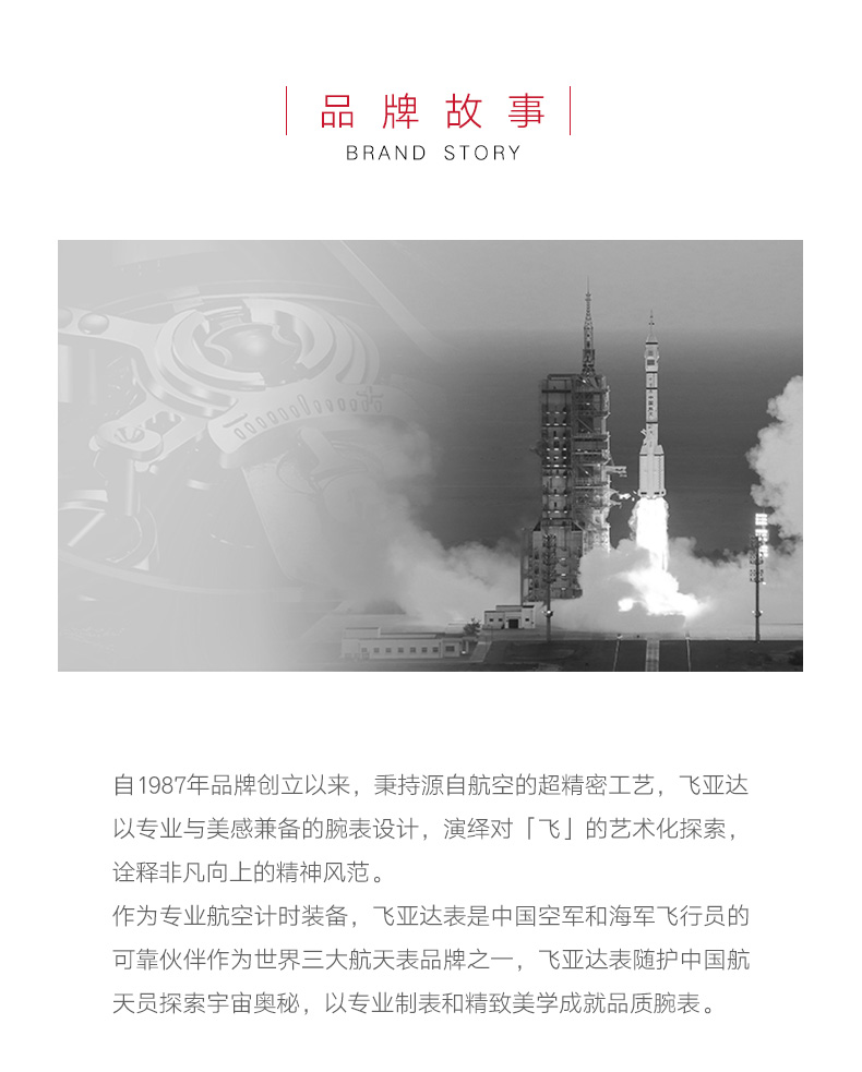 飞亚达表秉持源自航空的超精密工艺,飞亚达以专业与美感兼具的腕表设计,演绎对“飞”的艺术化探索,诠释非凡向上的品牌风范,讲述“一旦拥有,别无所求”的故事。