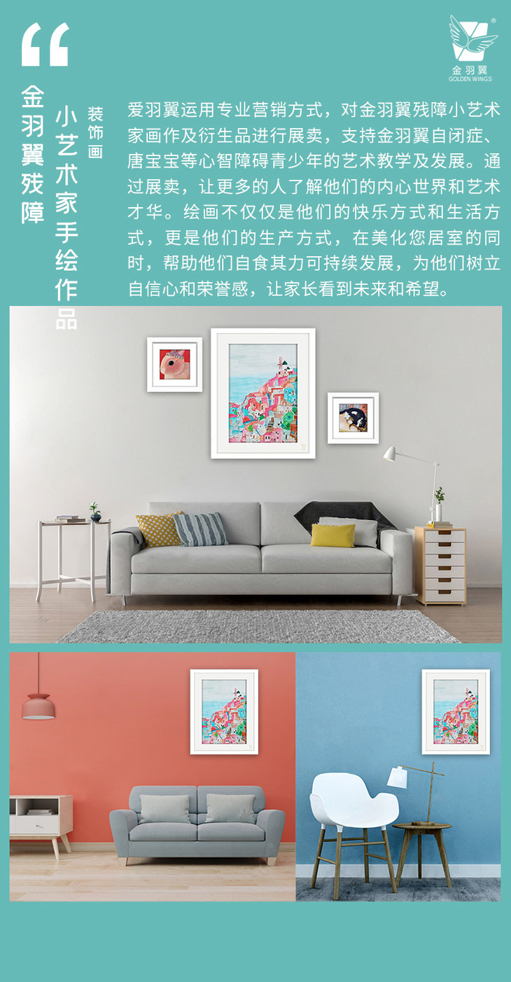 - 金羽翼将艺术与心理治疗相结合,用艺术教育的形式帮助残障青少年体现自身价值、提高生活质量、实现艺术梦想,并将绘画作品开发成衍生品销售,收入扣除成本后,20%返还给学员家庭,80%用于金羽翼艺术康复教学。