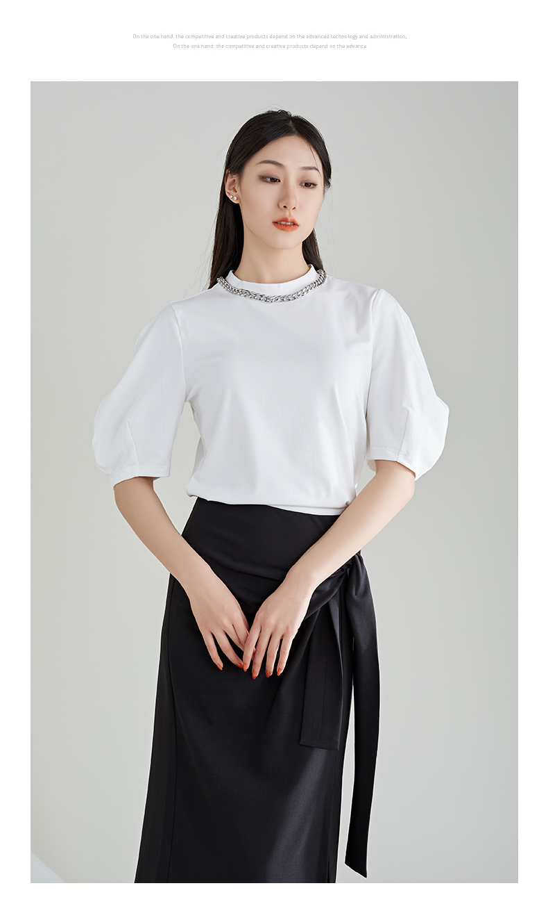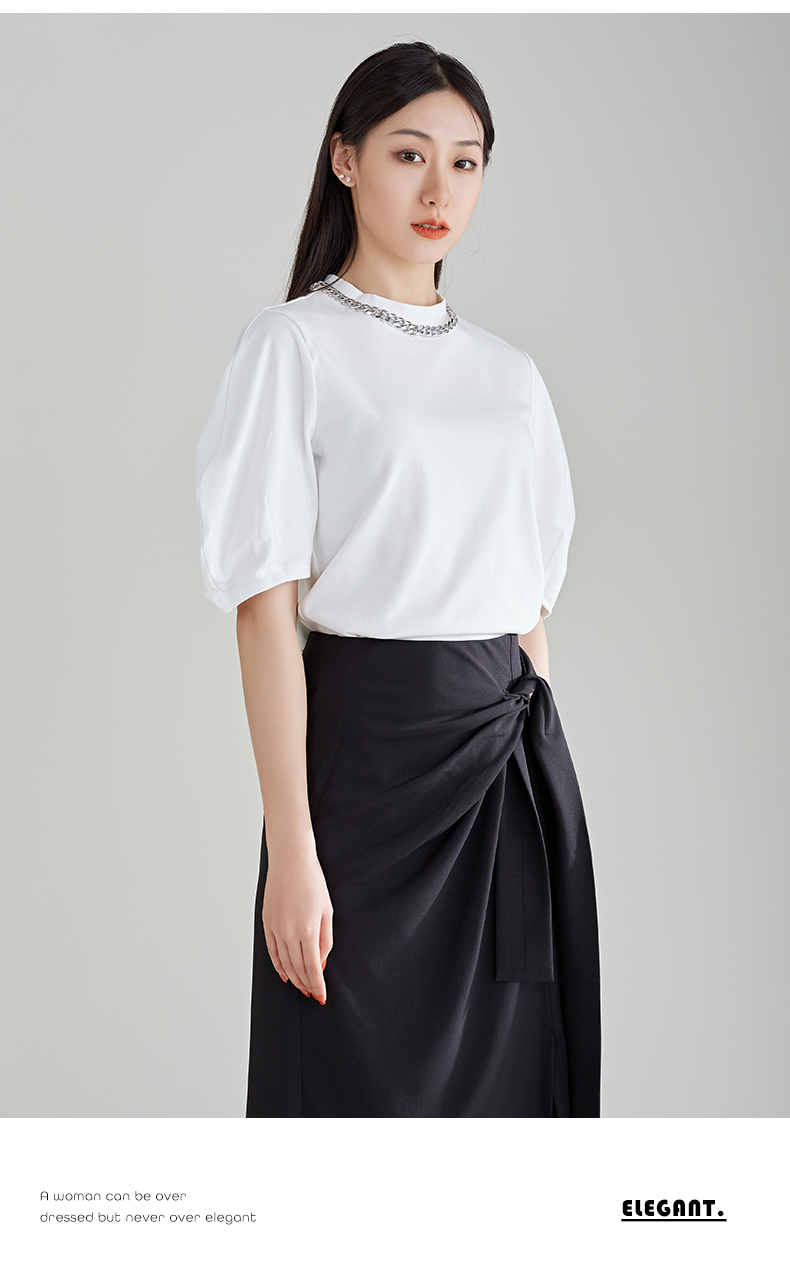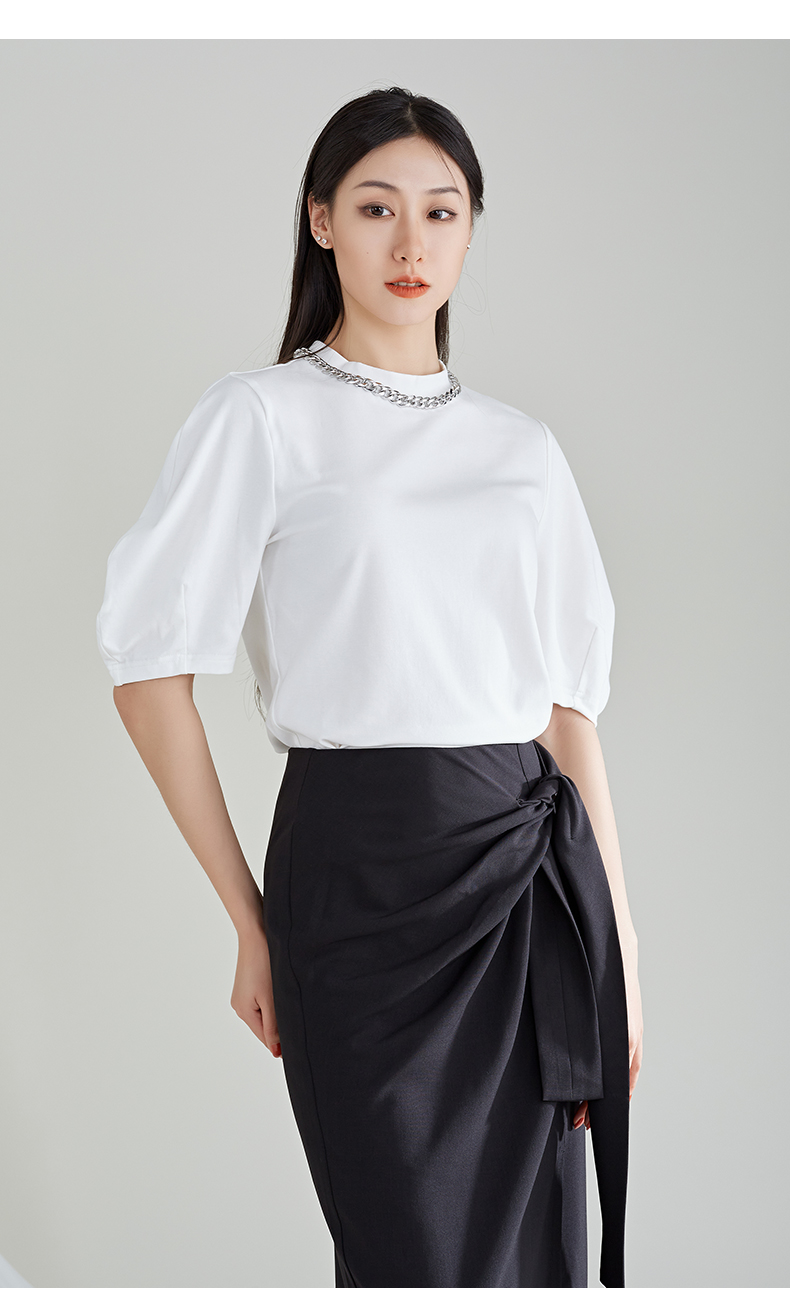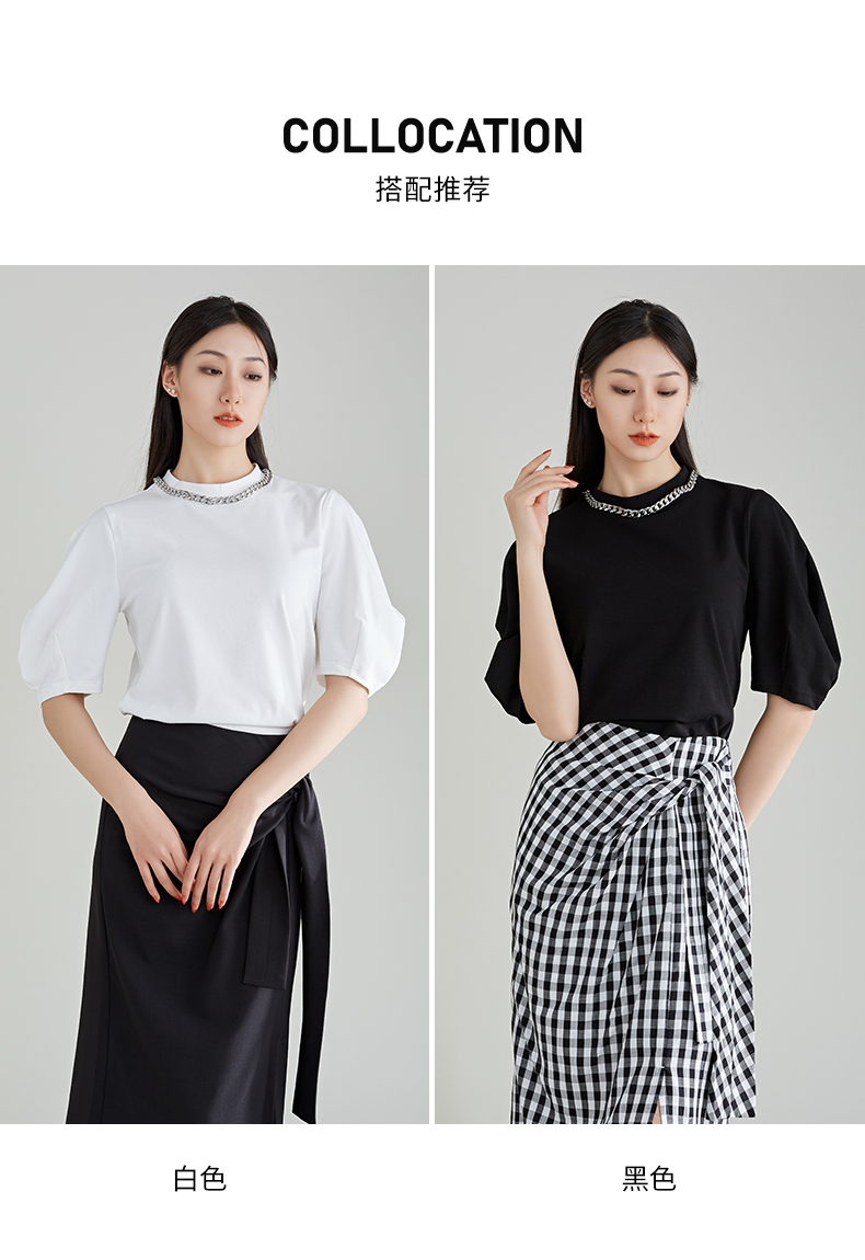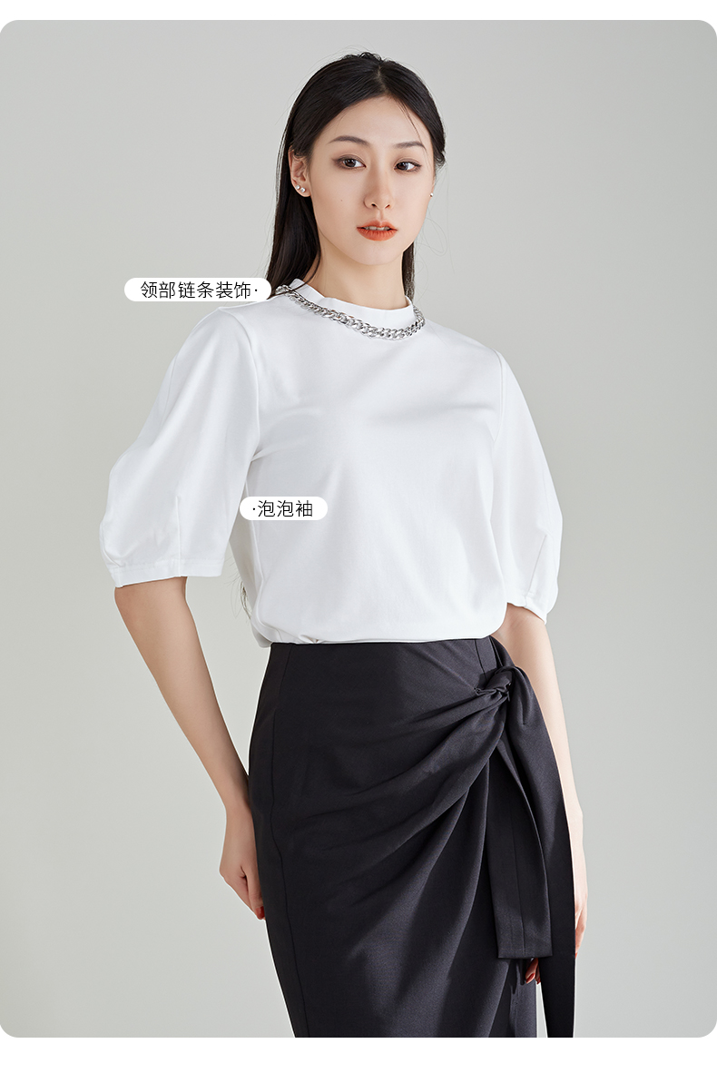 【特价不退换】阿菁娜春夏别致设计泡泡袖链条棉弹短款T恤F27C202020