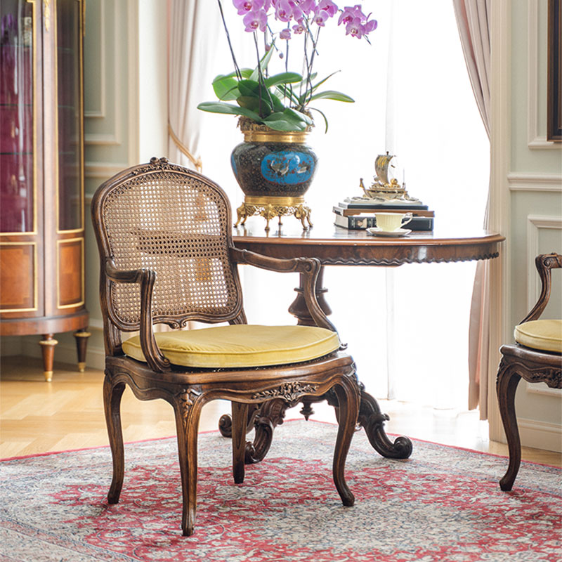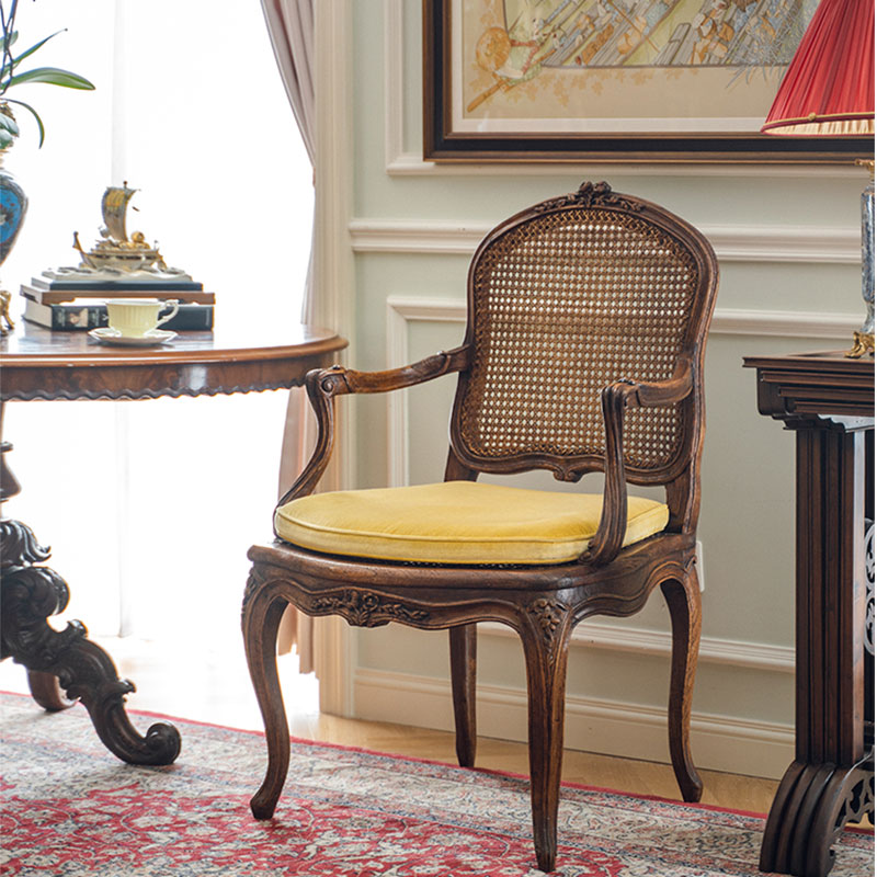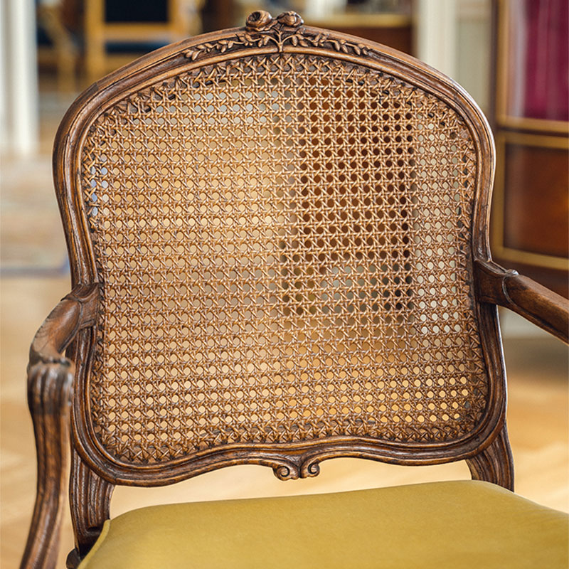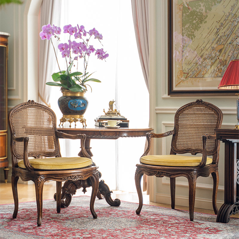 19世纪末法国出品路易十六风格胡桃木雕花藤椅一对
