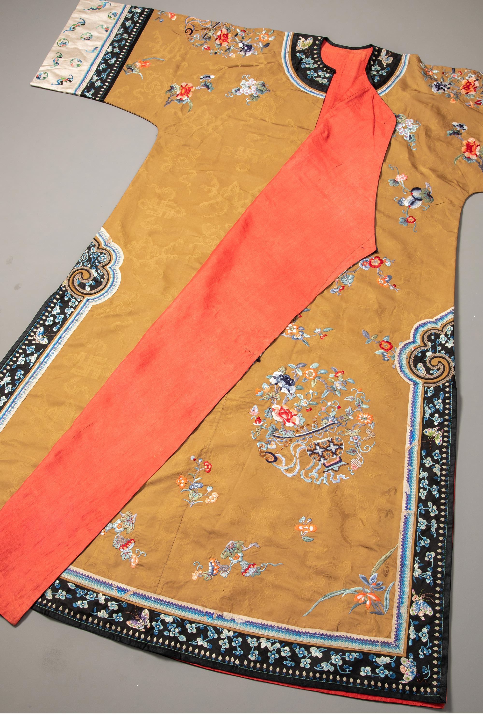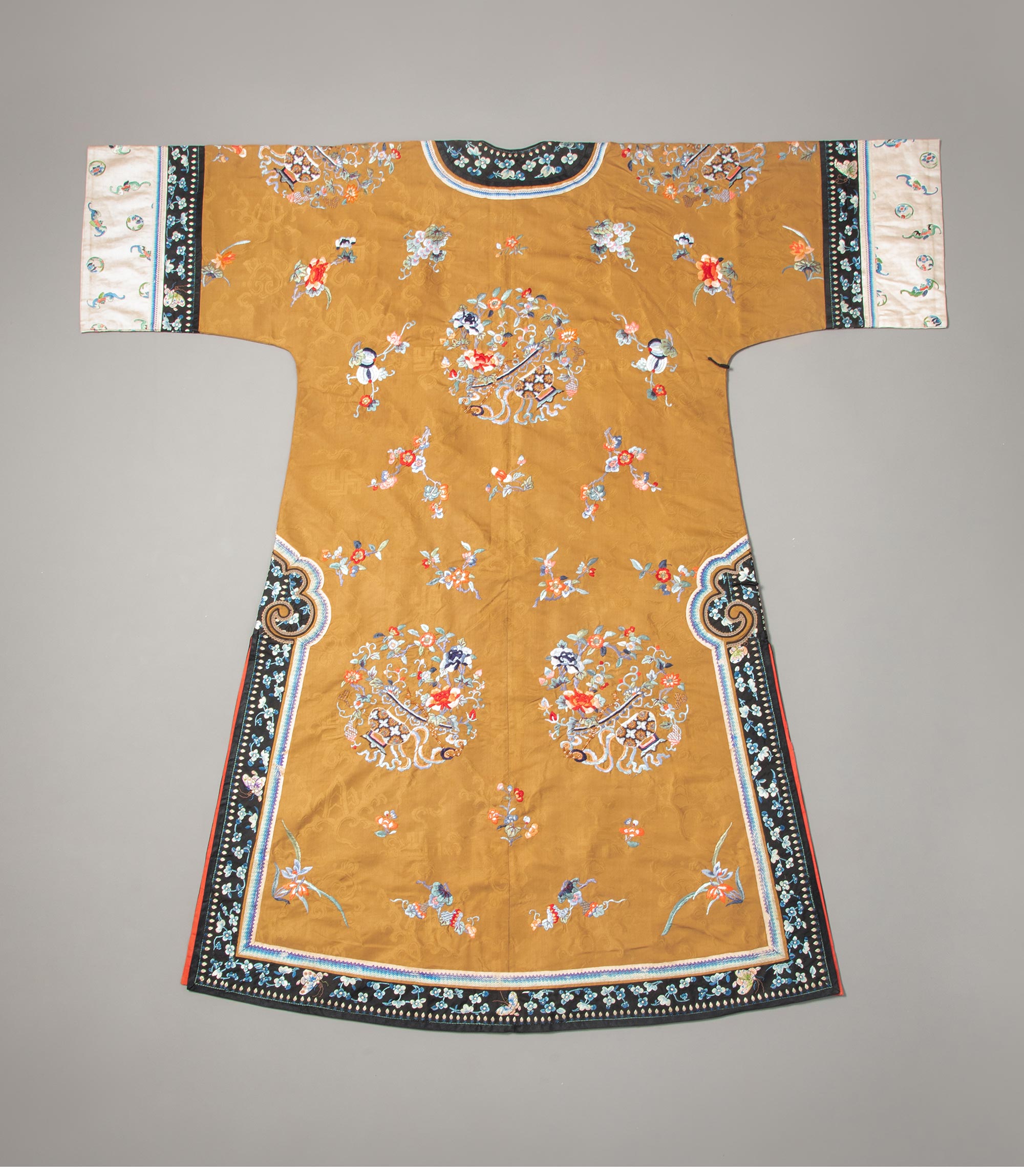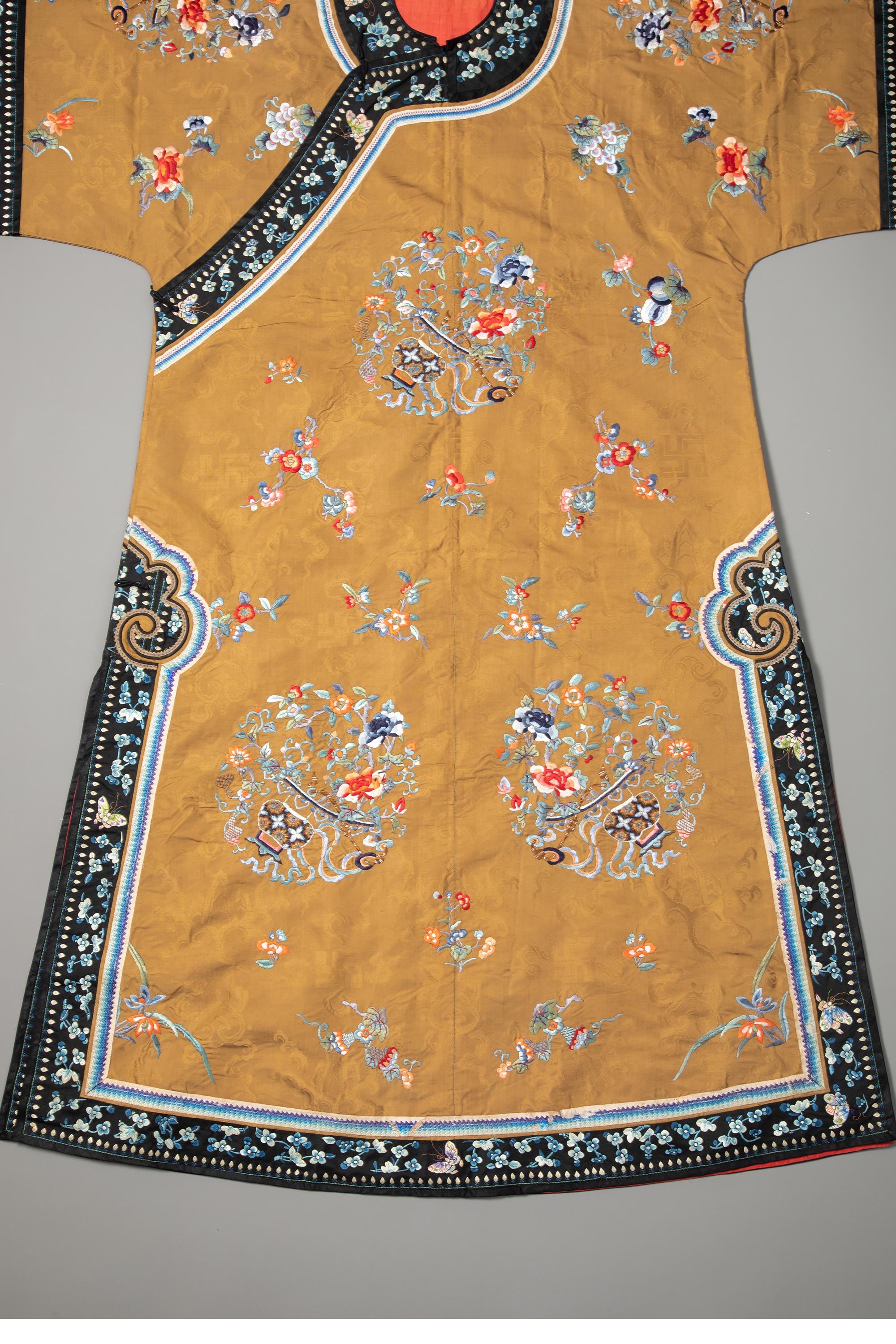 19世纪末中国晚清时期出品香色缎绣富贵花果及祥瑞彩蝶纹氅衣
