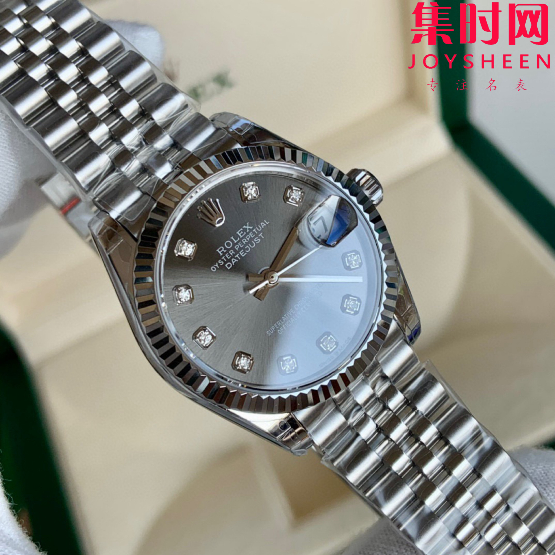 劳力士GS日志型系列 女款31mm 日志31系列 灰盘钻面 女士腕表 搭载改Cal.2236全自动机械机芯 日志型的蚝式表壳是坚固优雅的典范。采用904L不锈钢来锻造表壳表带,具备高抗腐蚀性。搭载改Cal.2236自动机械机芯 性能稳定,其抗震力、几何结构使机芯在任何位置都可保持规律运行。三角坑纹底盖以专用工具的旋紧,使表壳完全密封,上链表冠采用双扣锁双重防水系统,牢固旋紧于表壳,使得更加防水。镜面则以抗刮损蓝水晶制造,3点钟位置装有小窗凸透镜,方便读取日期。女装日志型的防水蚝式表壳给予高精准机芯防护。