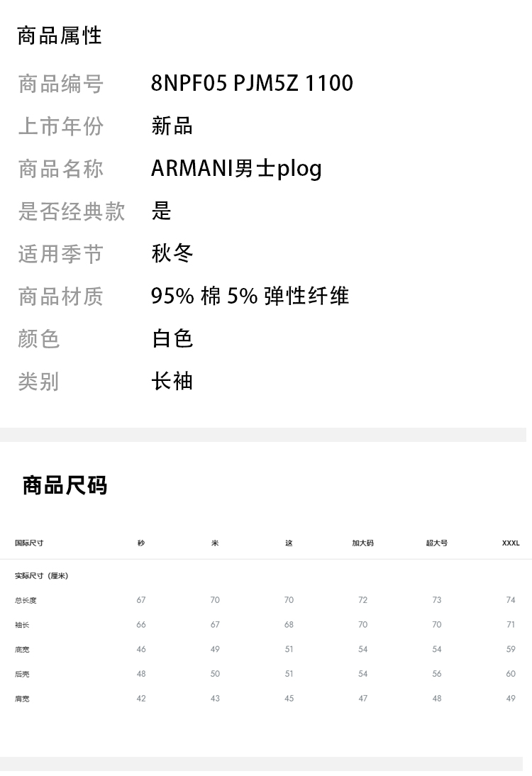 EMPORIO ARMANI EA7 阿玛尼 男士长袖T恤 白色 8NPF05 PJM5Z 1100