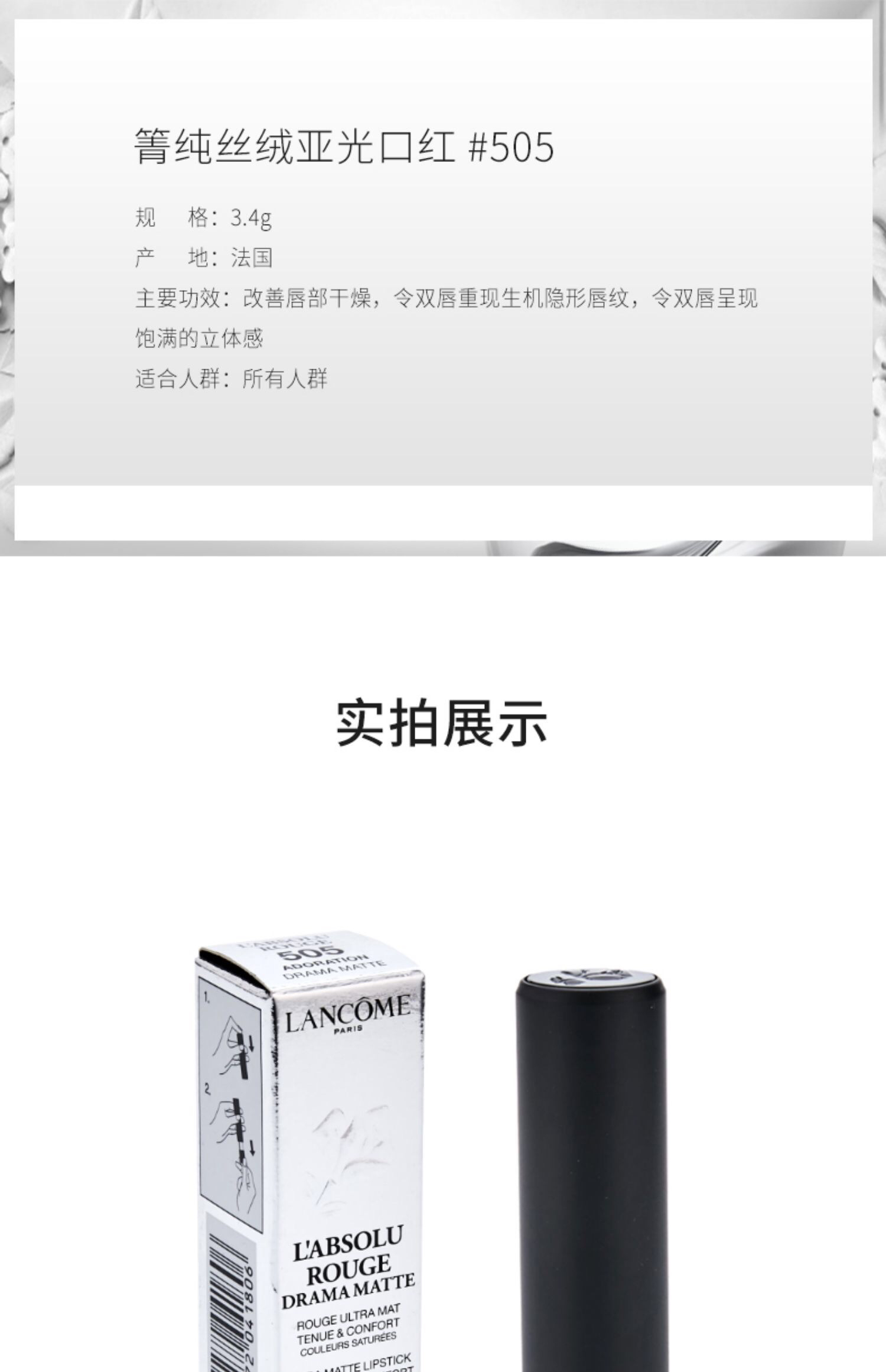 【海关保税直发】Lancome兰蔻菁纯丝绒哑光雾面口红505-黑管持久滋润-会员5折