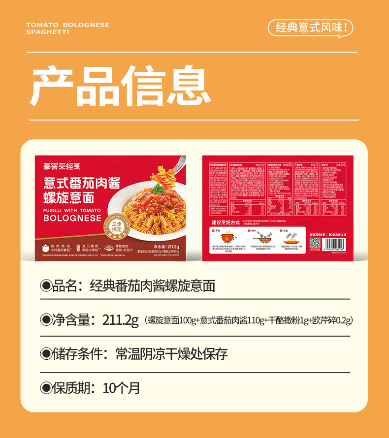 豪客来轻烹意式番茄肉酱螺旋意面/1包(211.29g)生产日期:26年2月