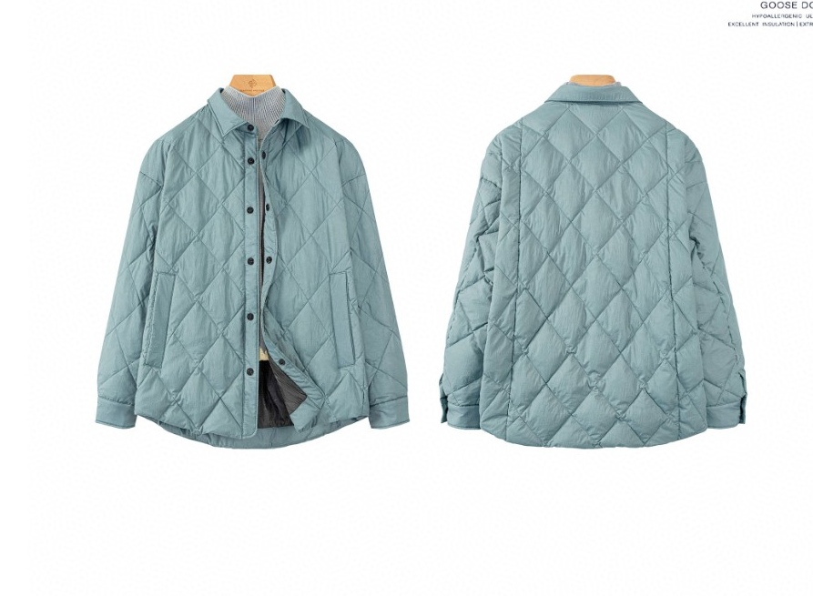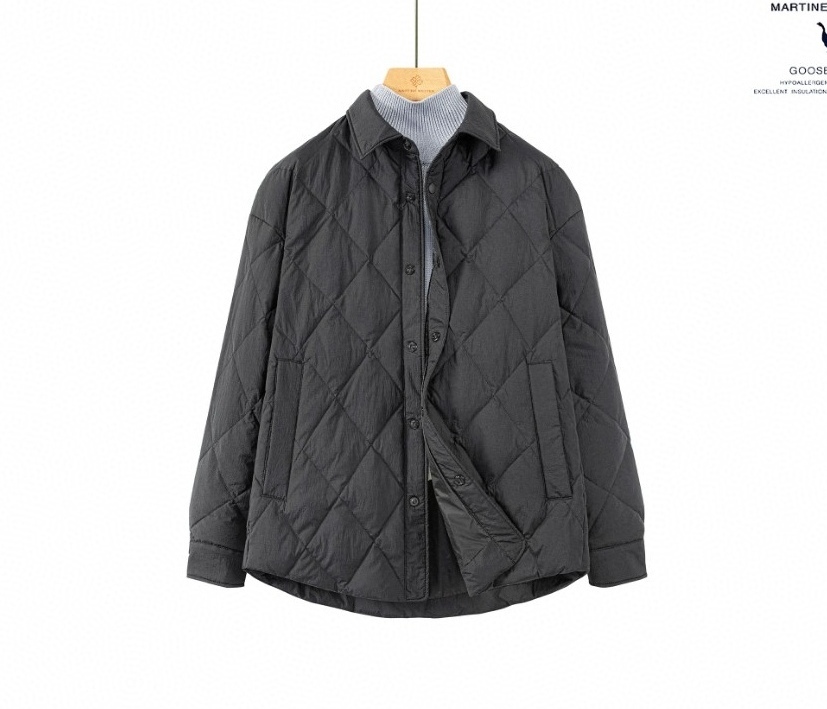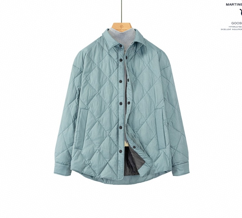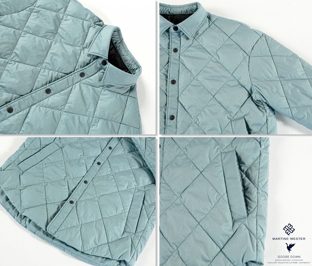 Martine Wester 女密可柔轻量面料菱形格衬衣领薄款鹅绒服; 全身精心绗线构成的菱形格,造型立体,显高显瘦,娇俏简约 采用定制安心鹅绒:绒子含量90%,一件一码可溯源。