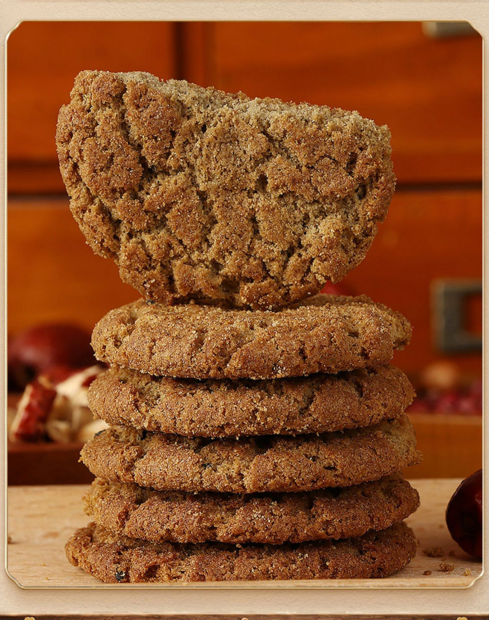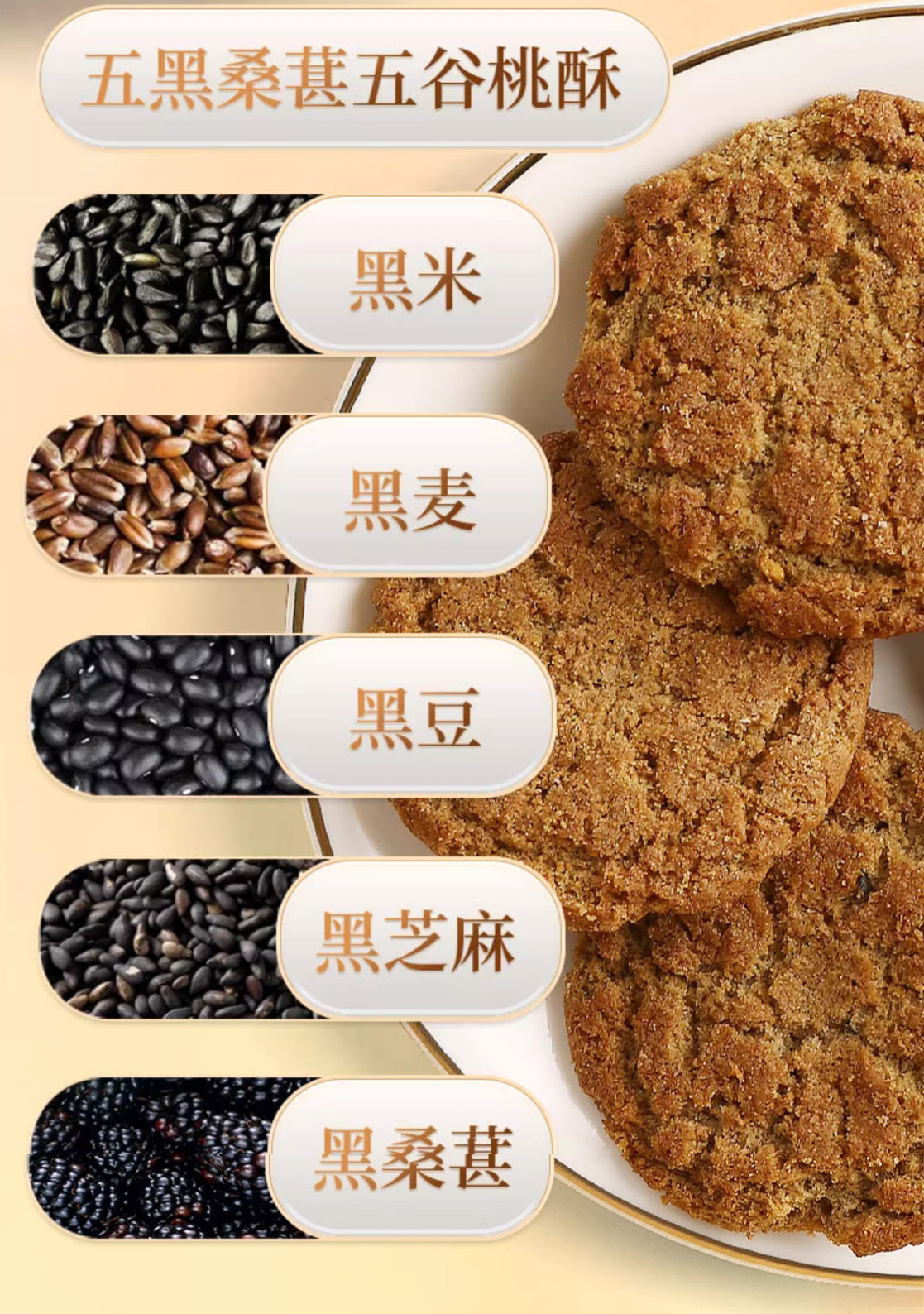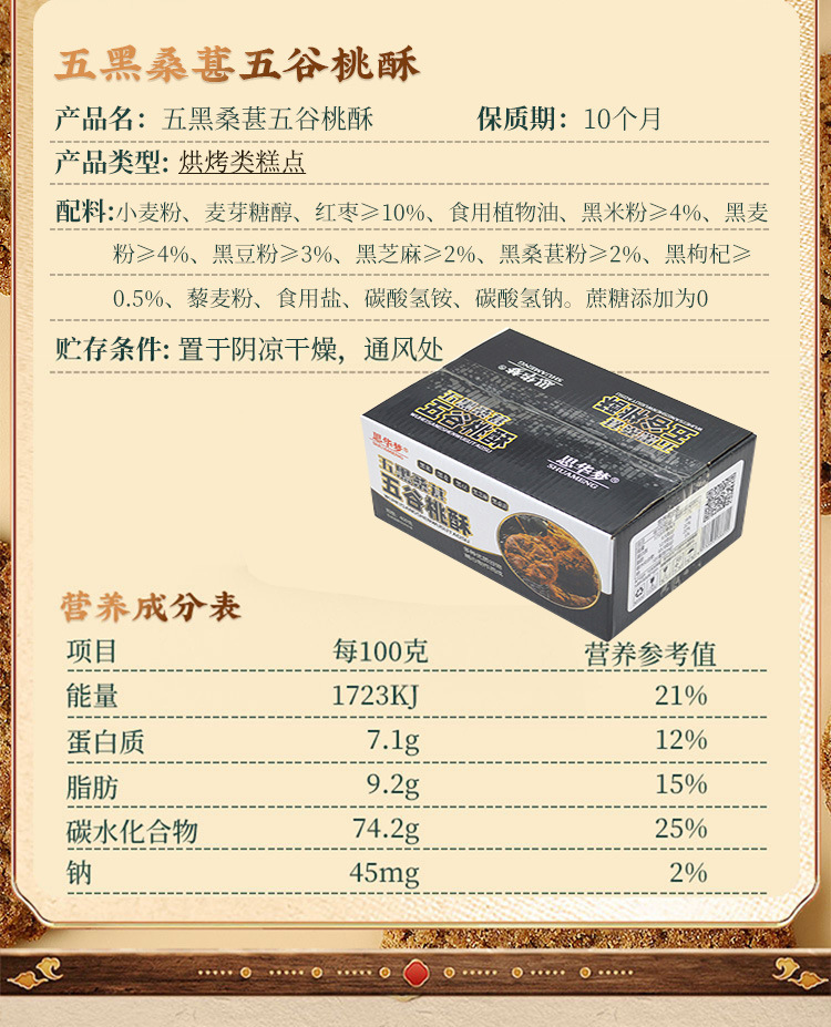 配料:小麦粉、麦芽糖醇、红枣≥10%、食用植物油、黑米粉≥4%、黑麦粉≥4%、黑豆粉之3%、黑芝麻》2%、黑桑葚粉>2%、黑枸杞>0.5%、藜麦粉、食用盐、碳酸氢铵、碳酸氢钠。蔗糖添加为0