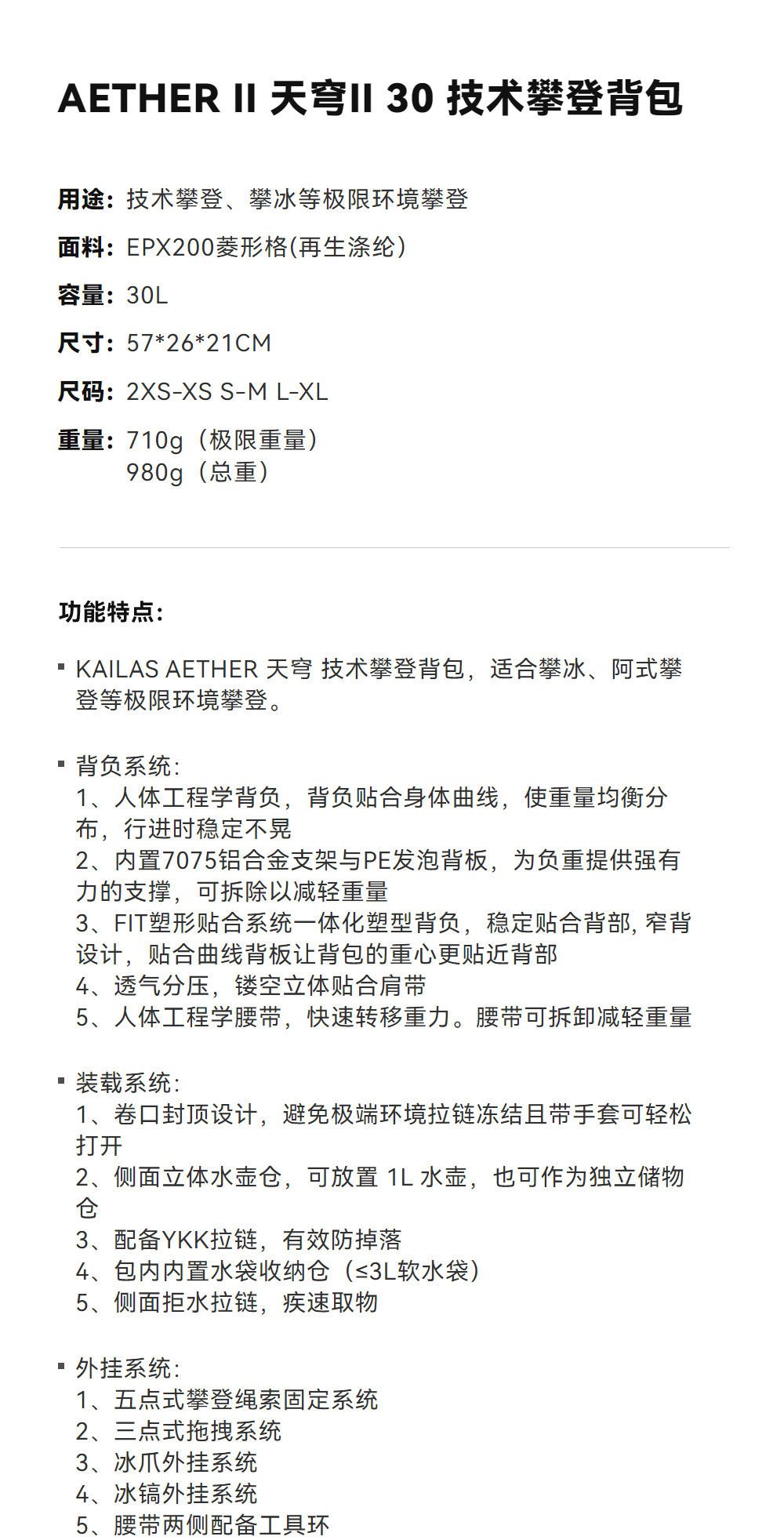 KAILAS凯乐石 AETHER II 天穹II 30 技术攀登背包 KA2653005