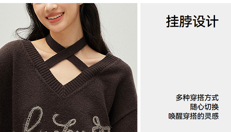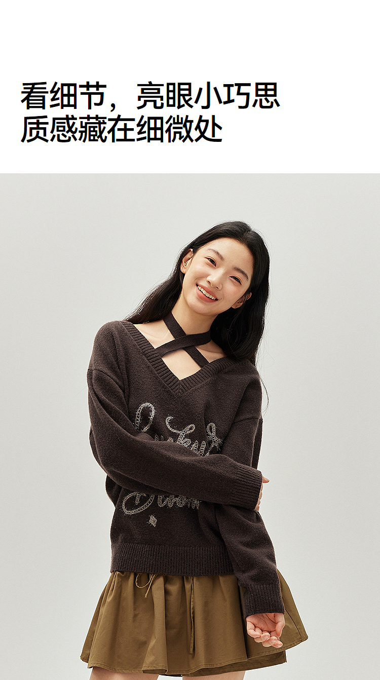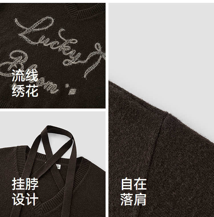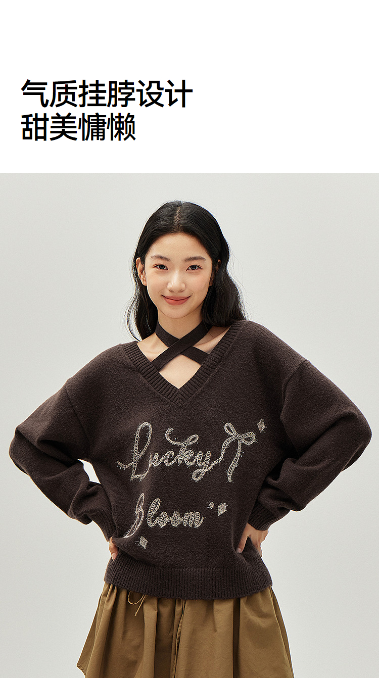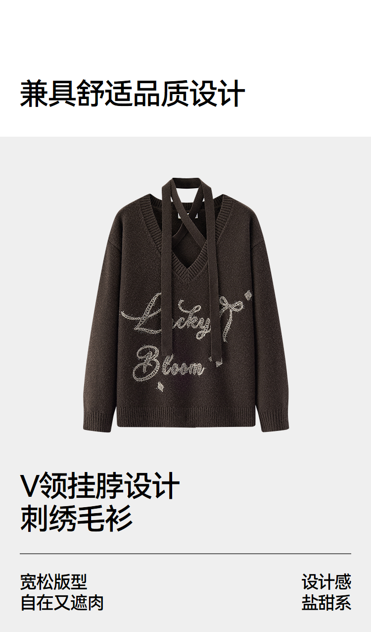 森马毛衣女冬季V领挂脖宽松刺绣蝴蝶结2025新款盐甜系设计感上衣