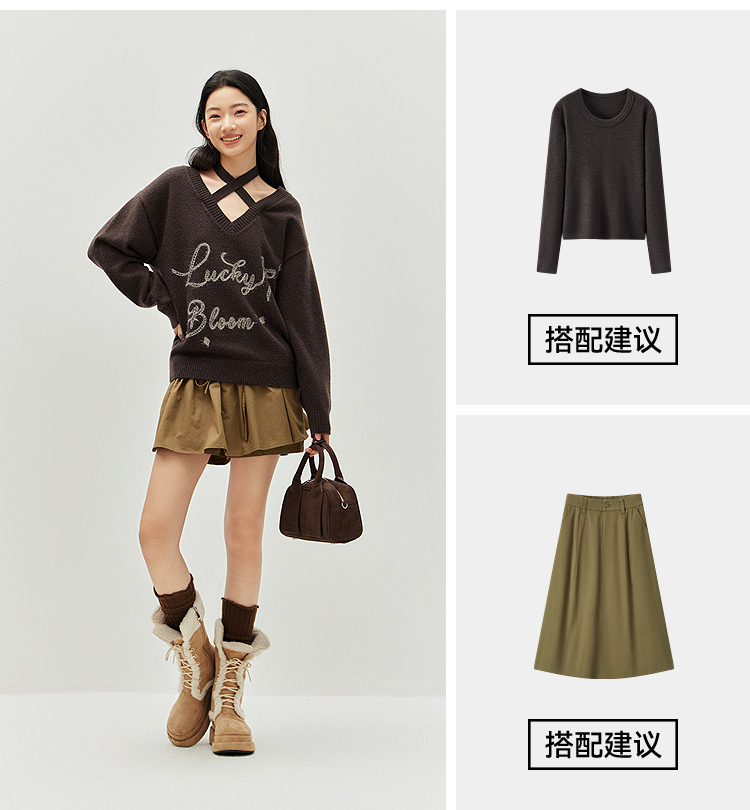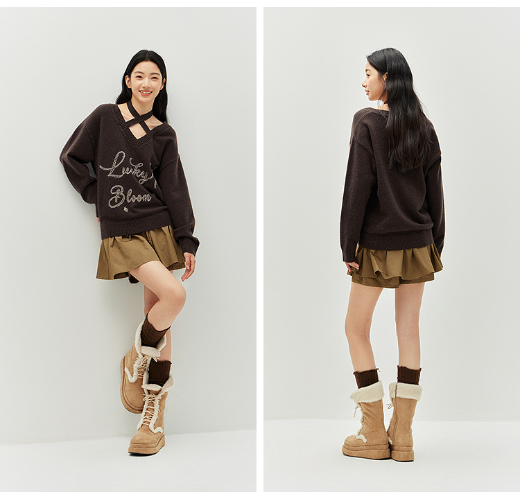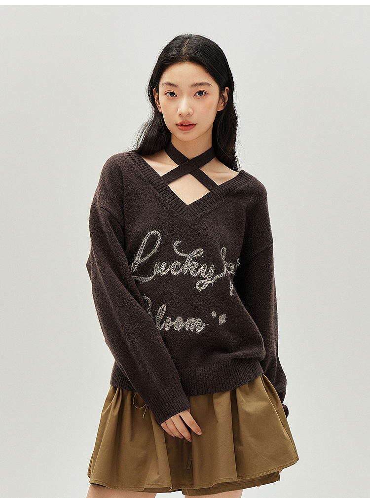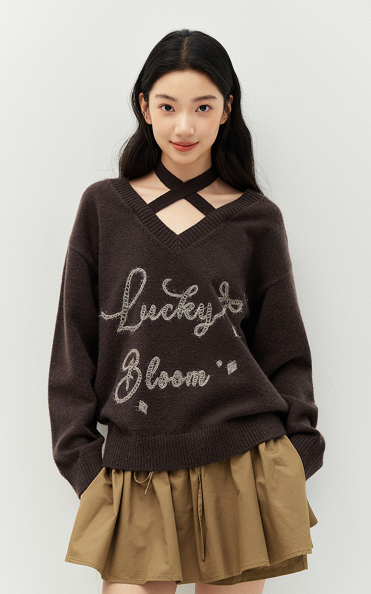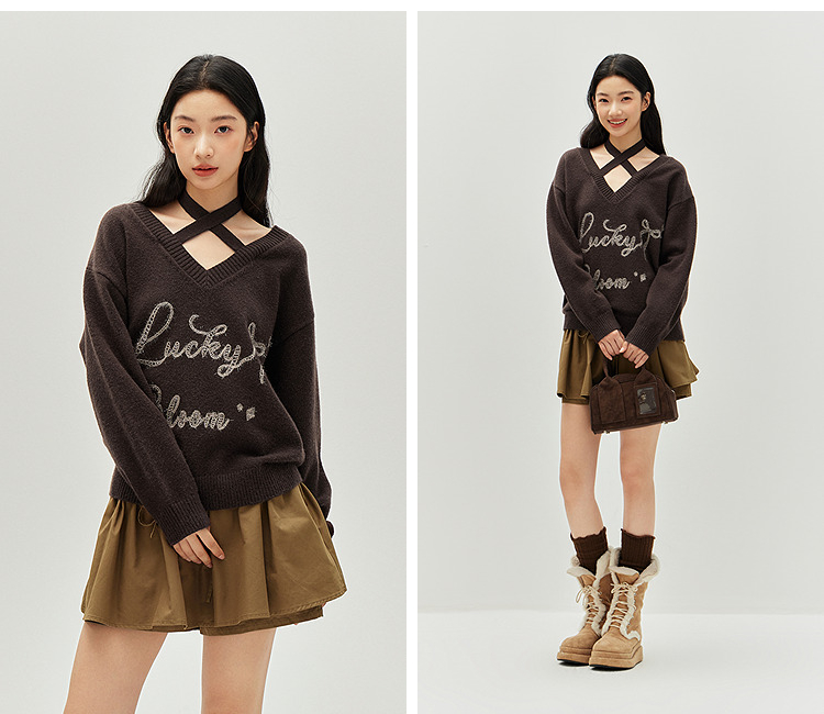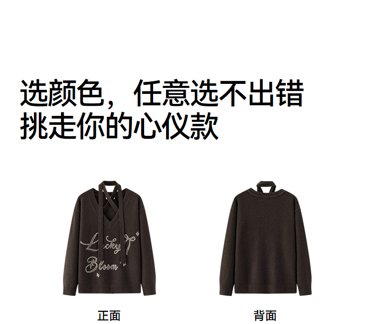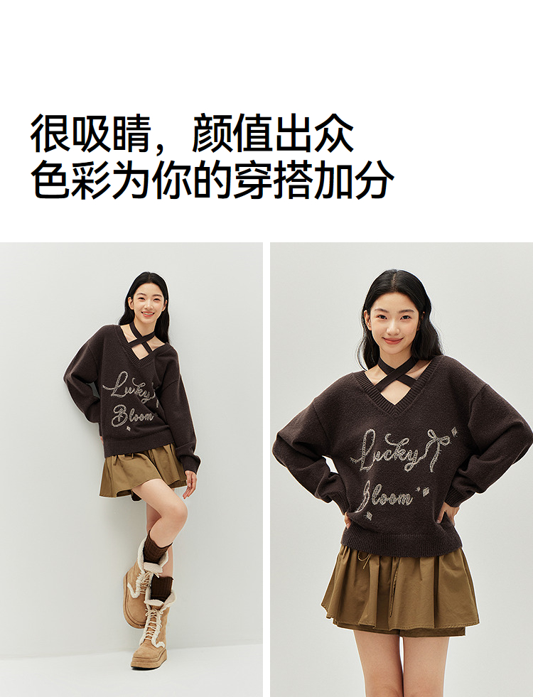 森马毛衣女冬季V领挂脖宽松刺绣蝴蝶结2025新款盐甜系设计感上衣