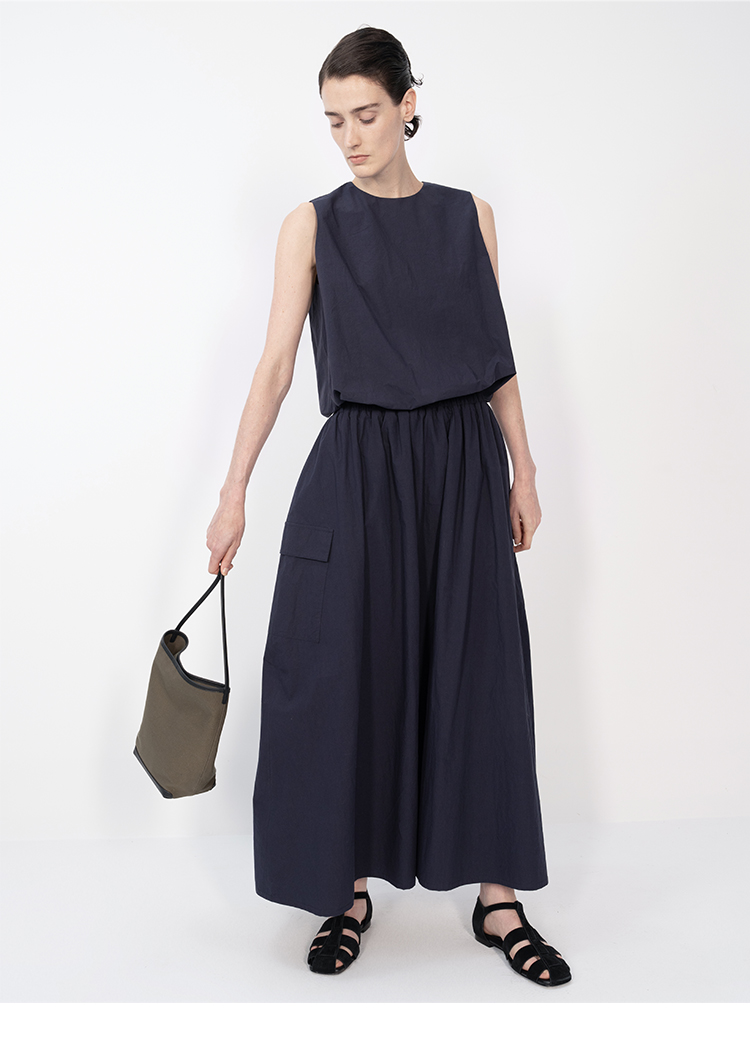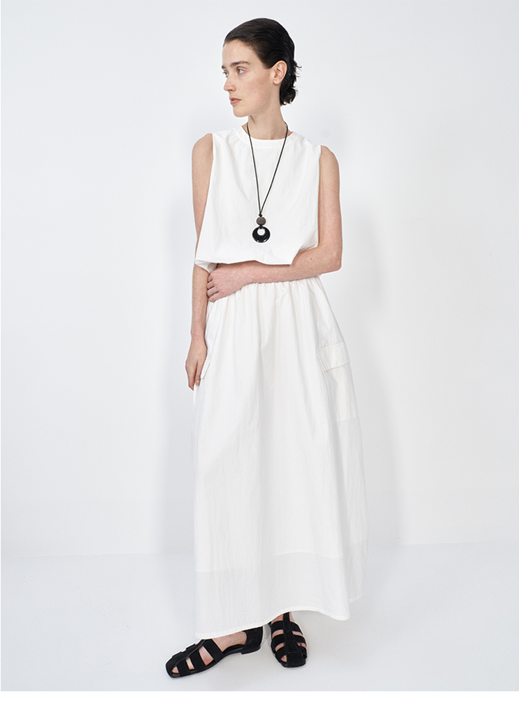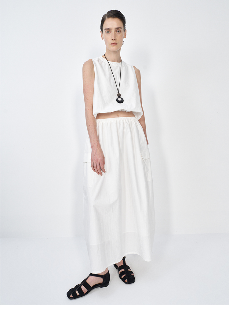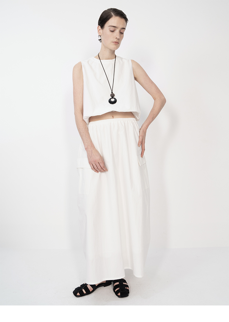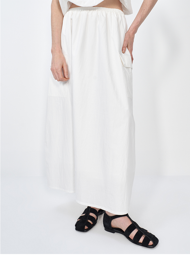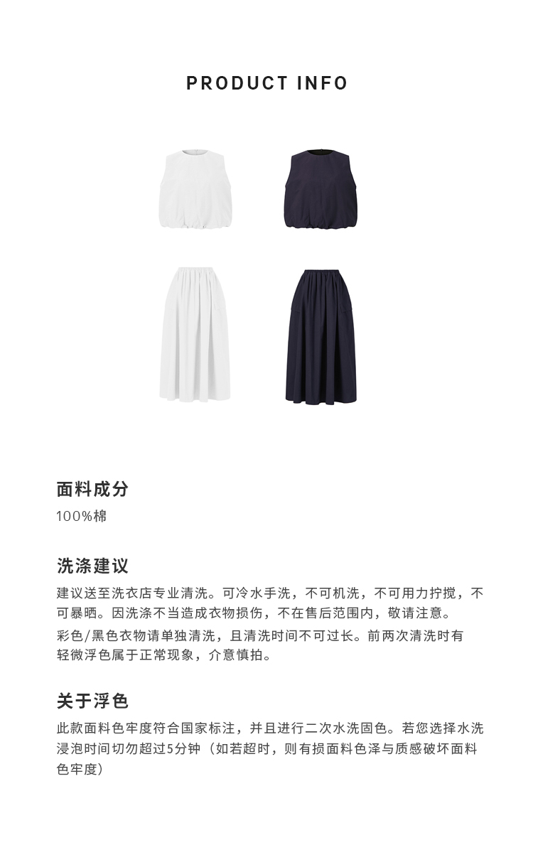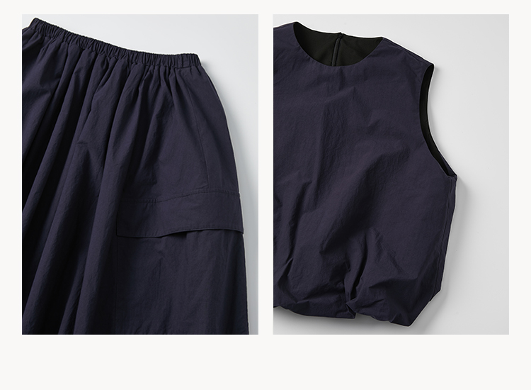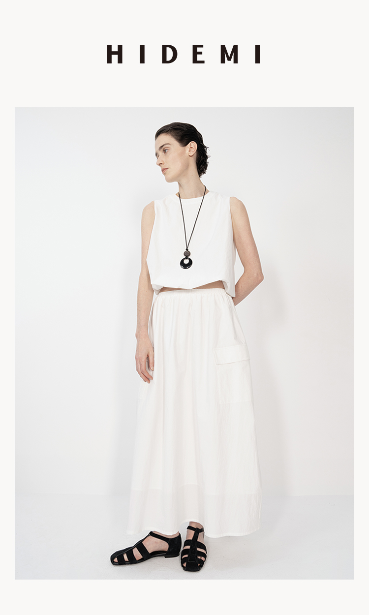 HIDEMI 微褶皱水洗棉简约设计大口袋休闲伞状上衣半身裙套装