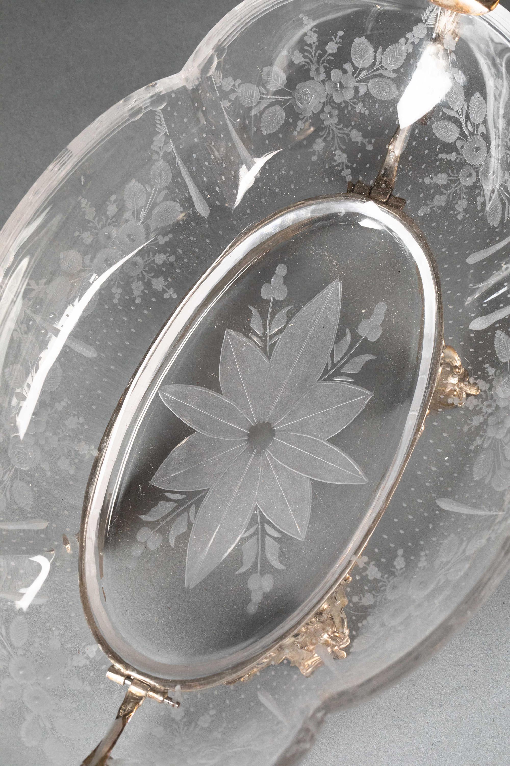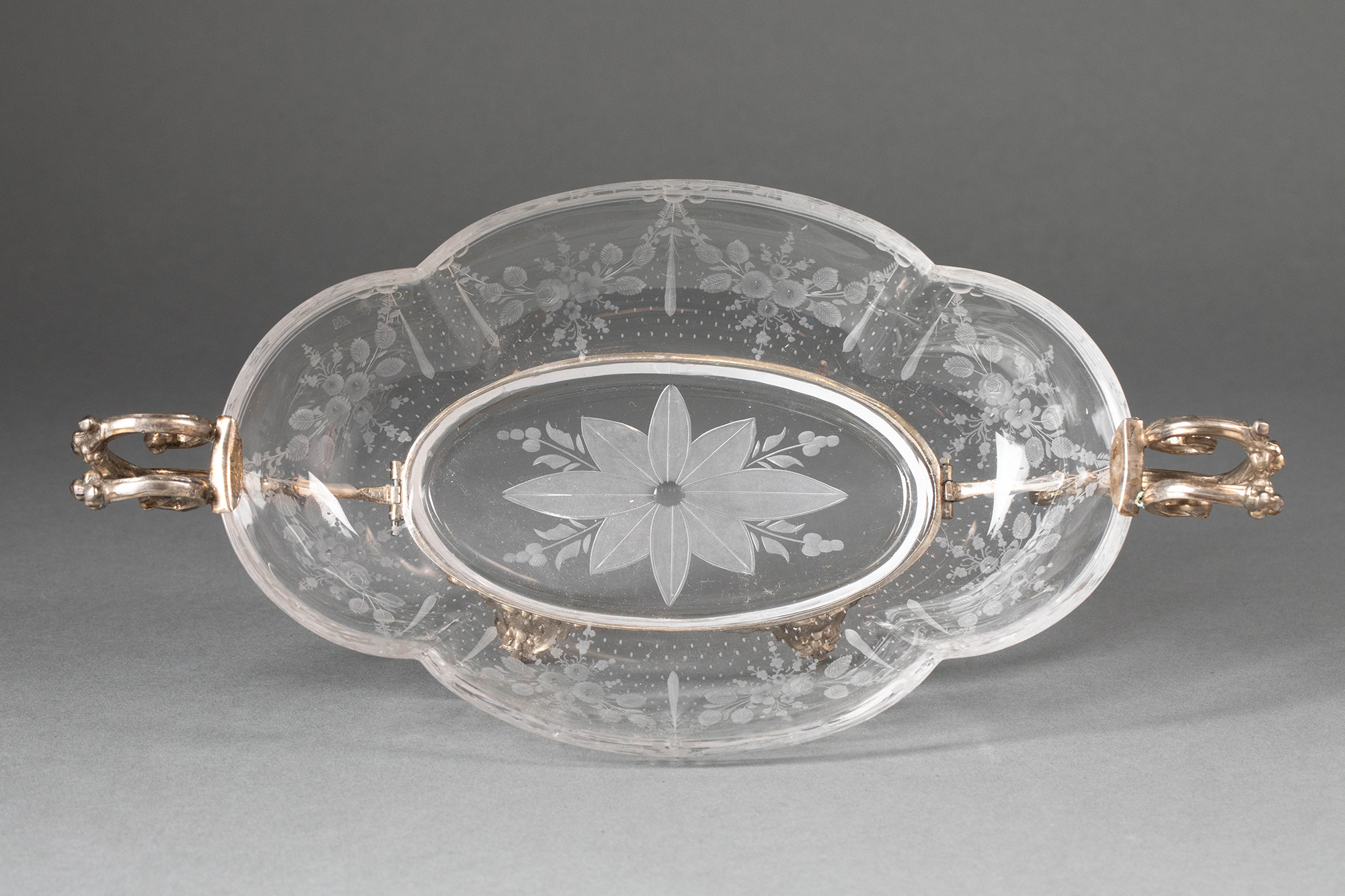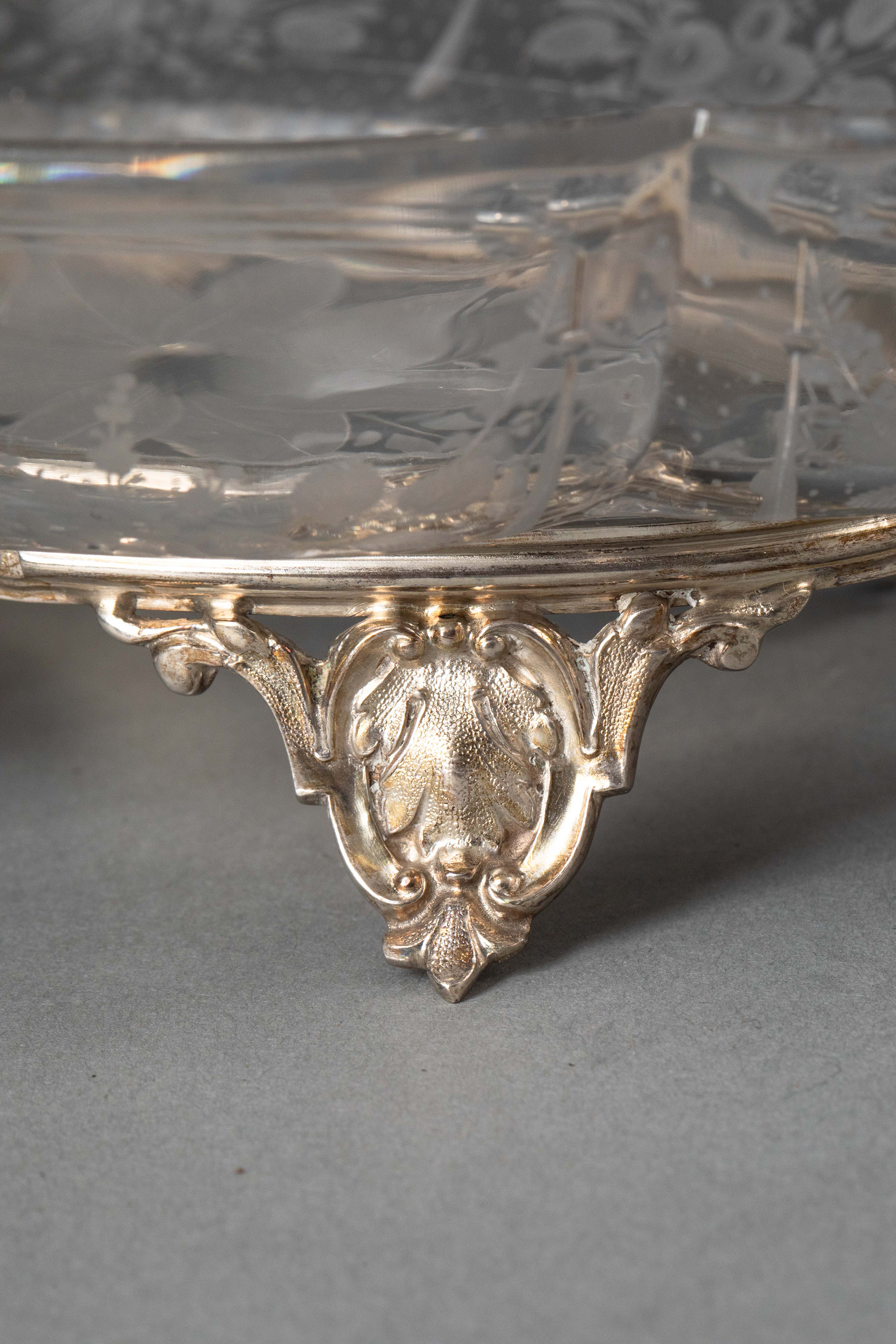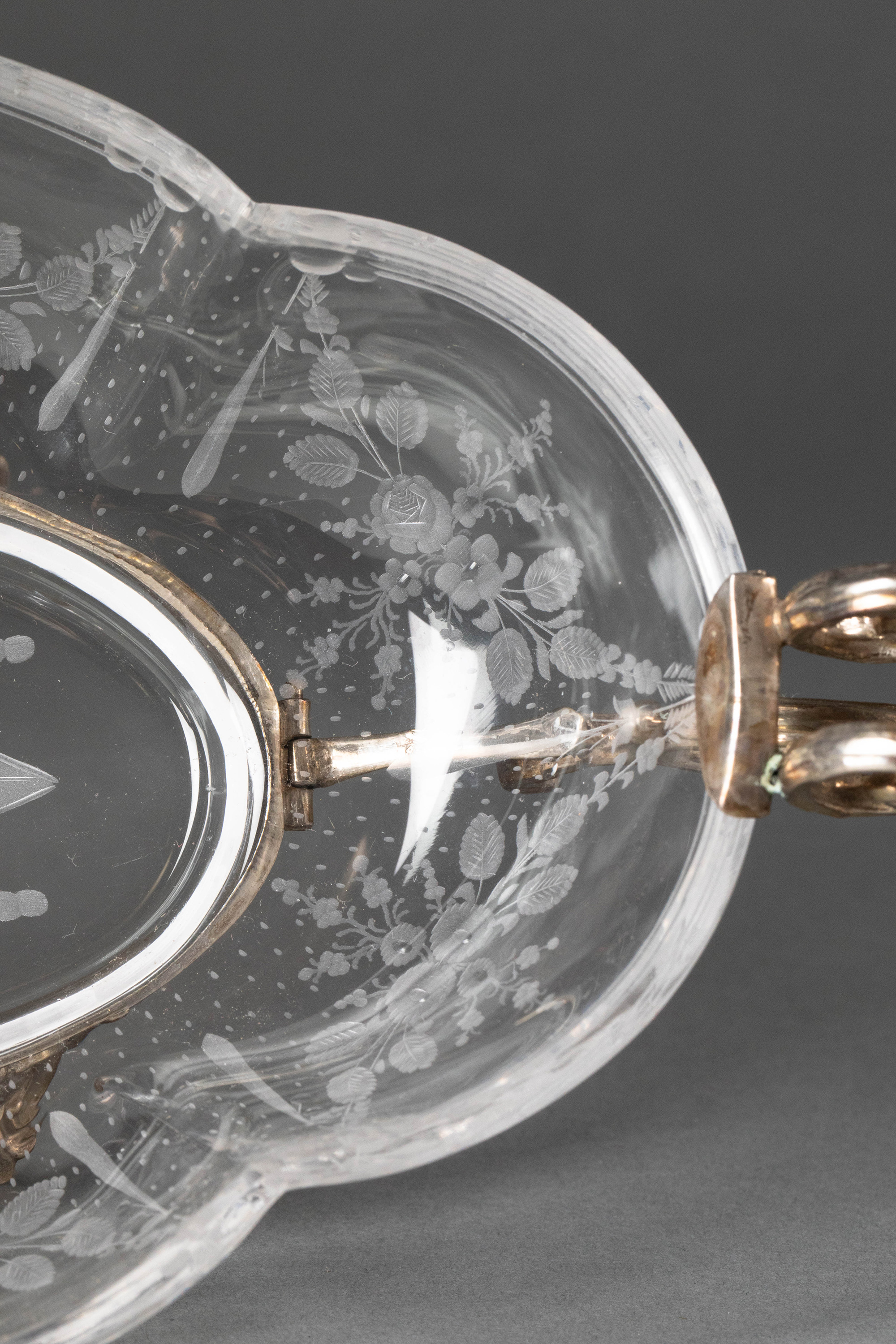 1880年代法国出品路易十五风格卷叶纹镀银精雕装饰花卉主题蚀刻水晶双耳果盘套件