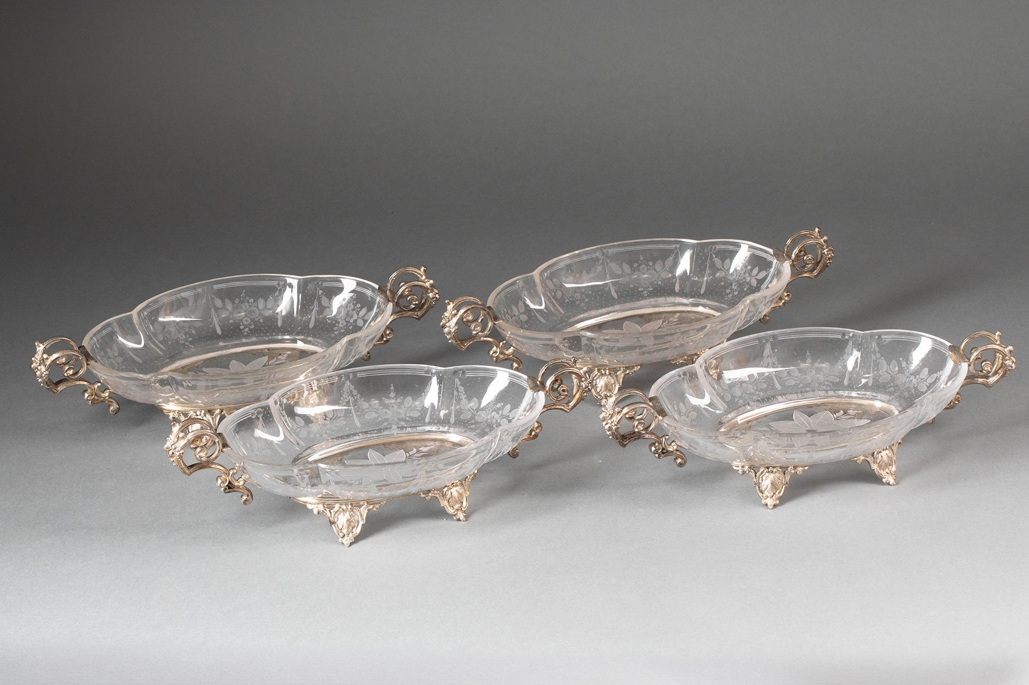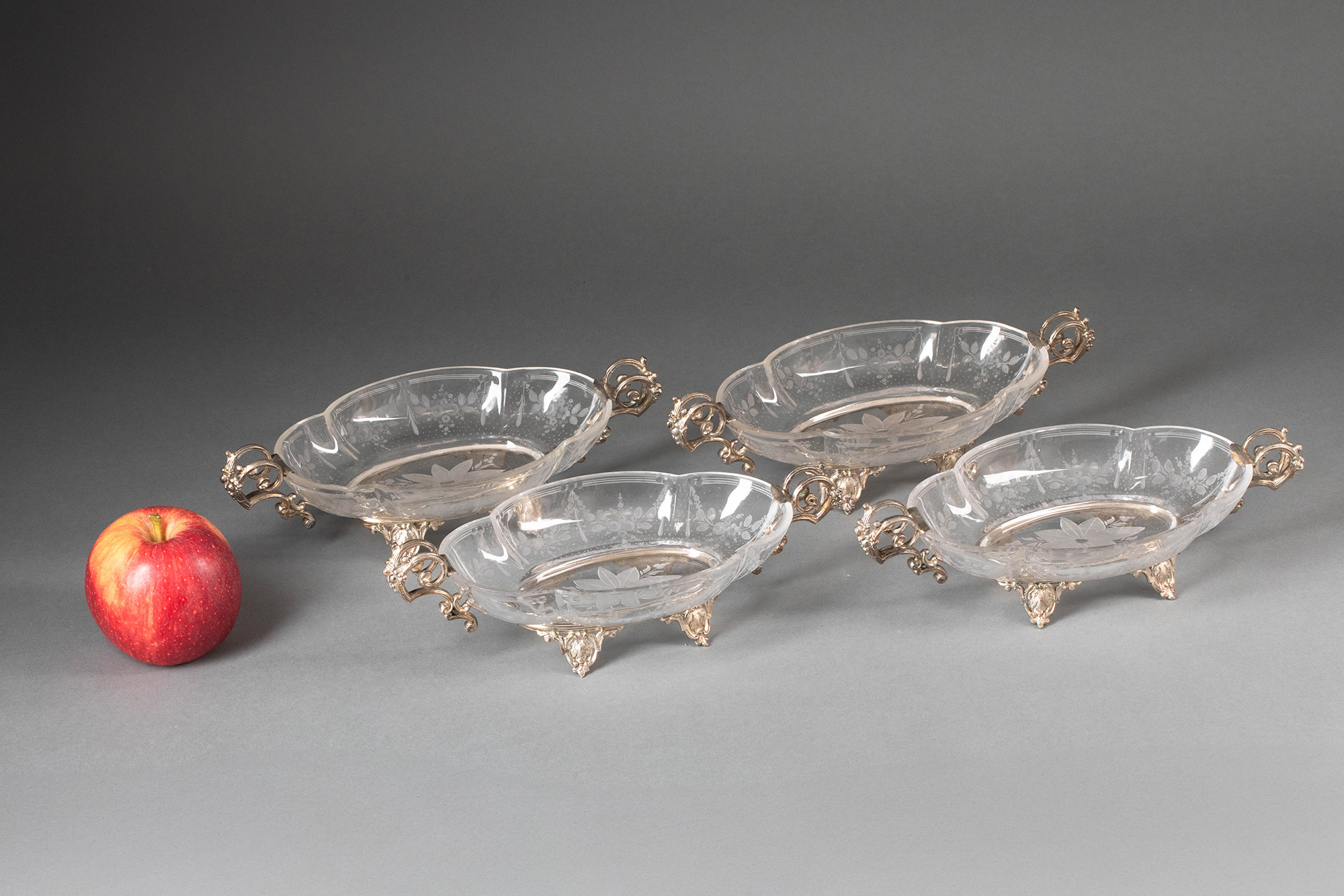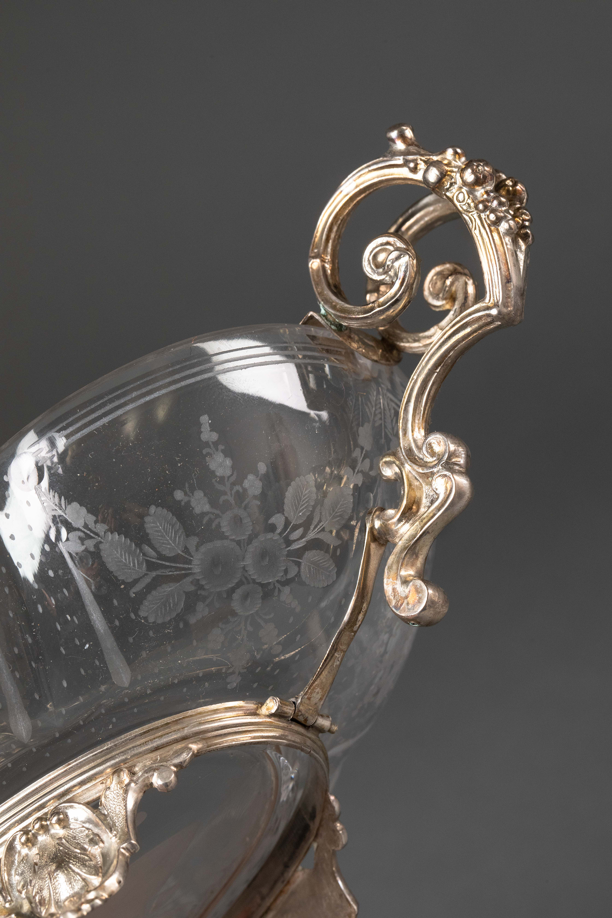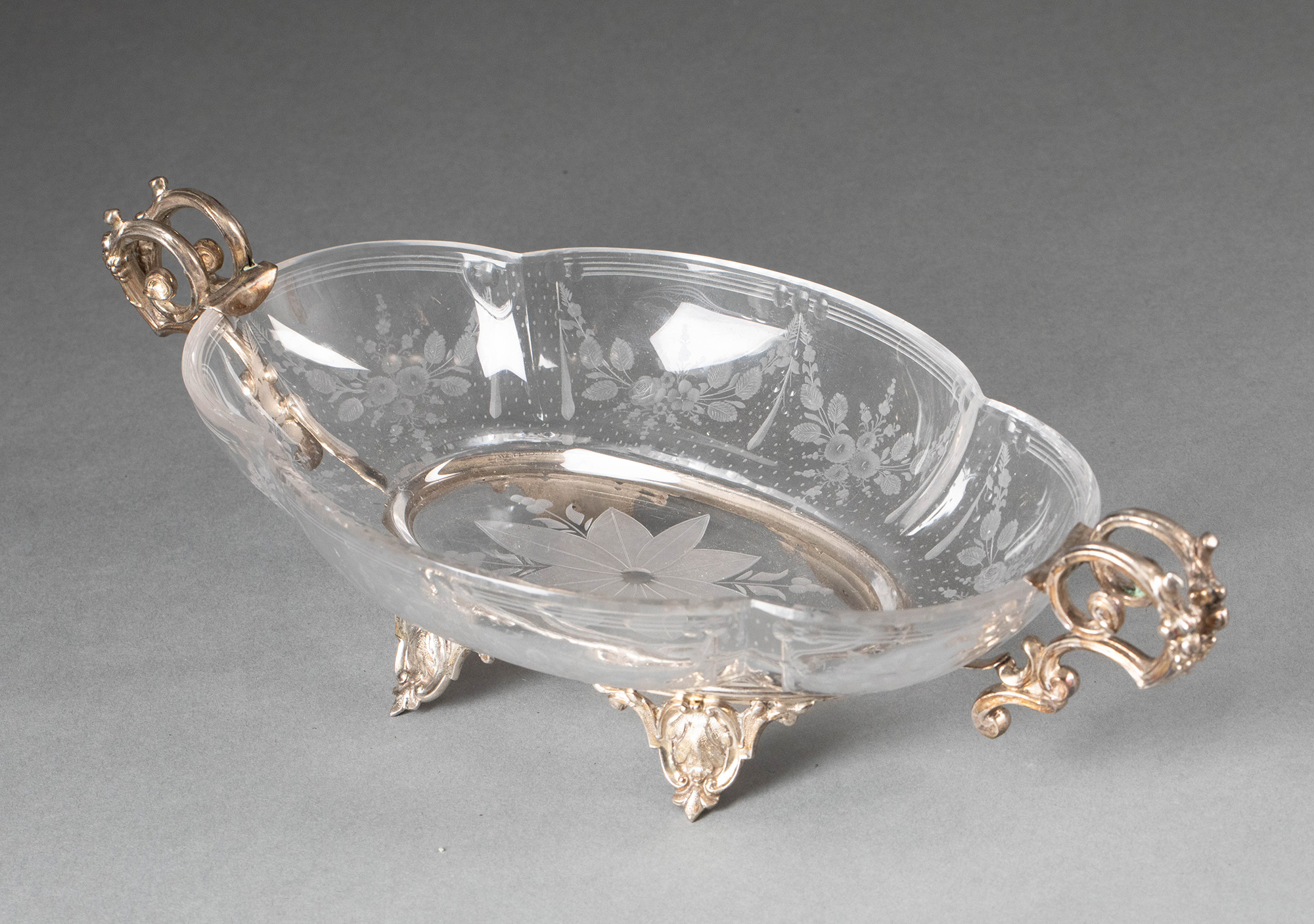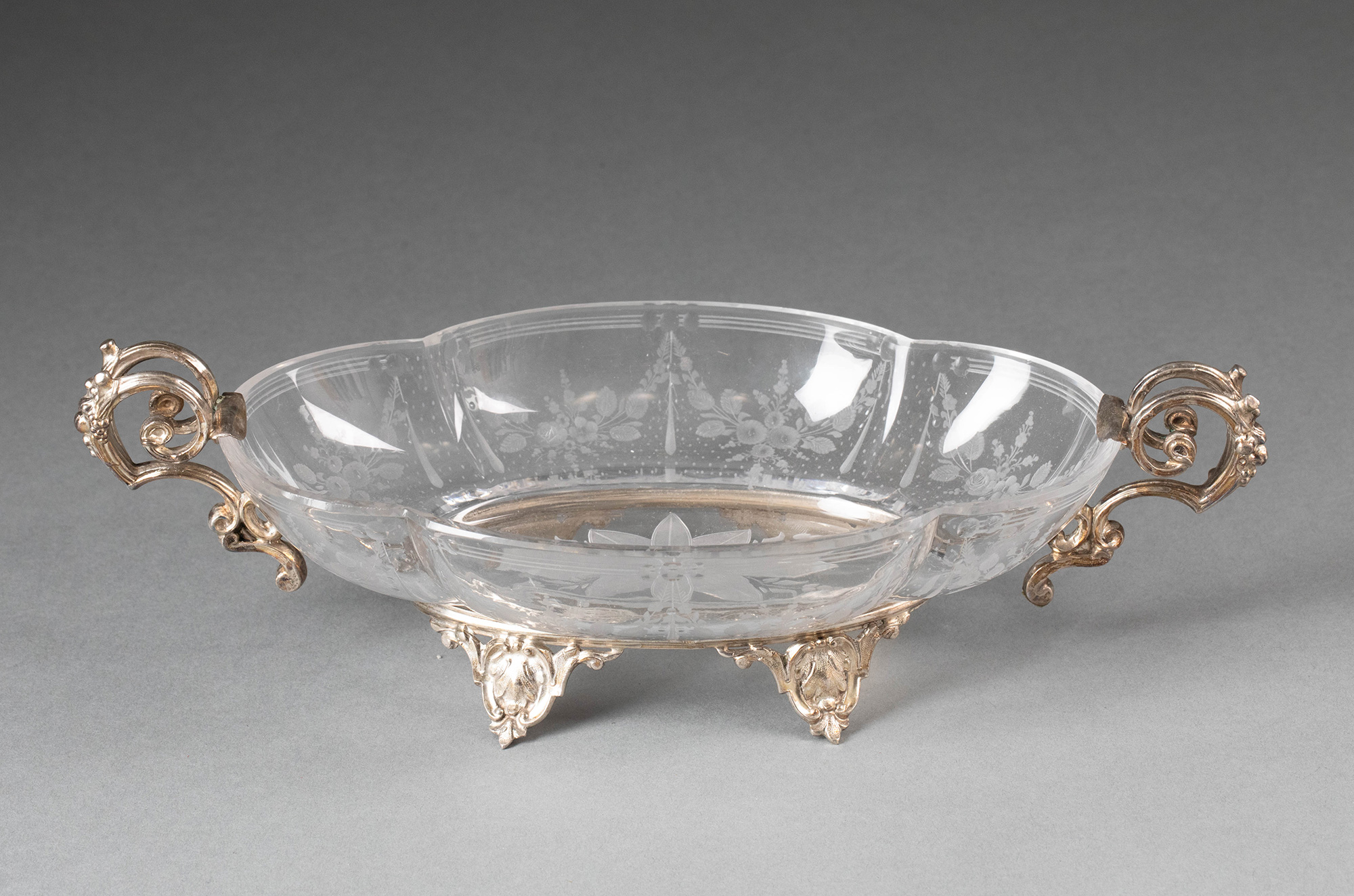 1880年代法国出品路易十五风格卷叶纹镀银精雕装饰花卉主题蚀刻水晶双耳果盘套件