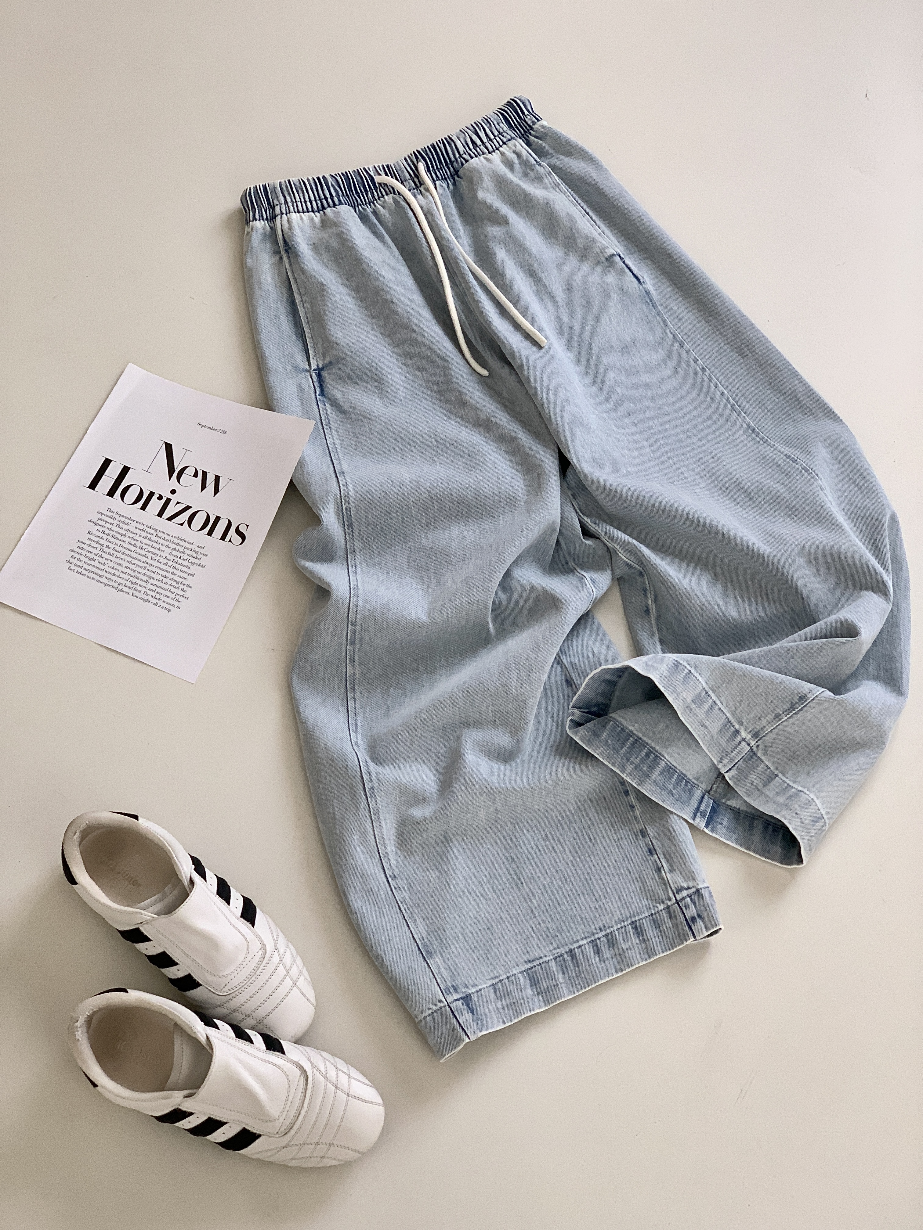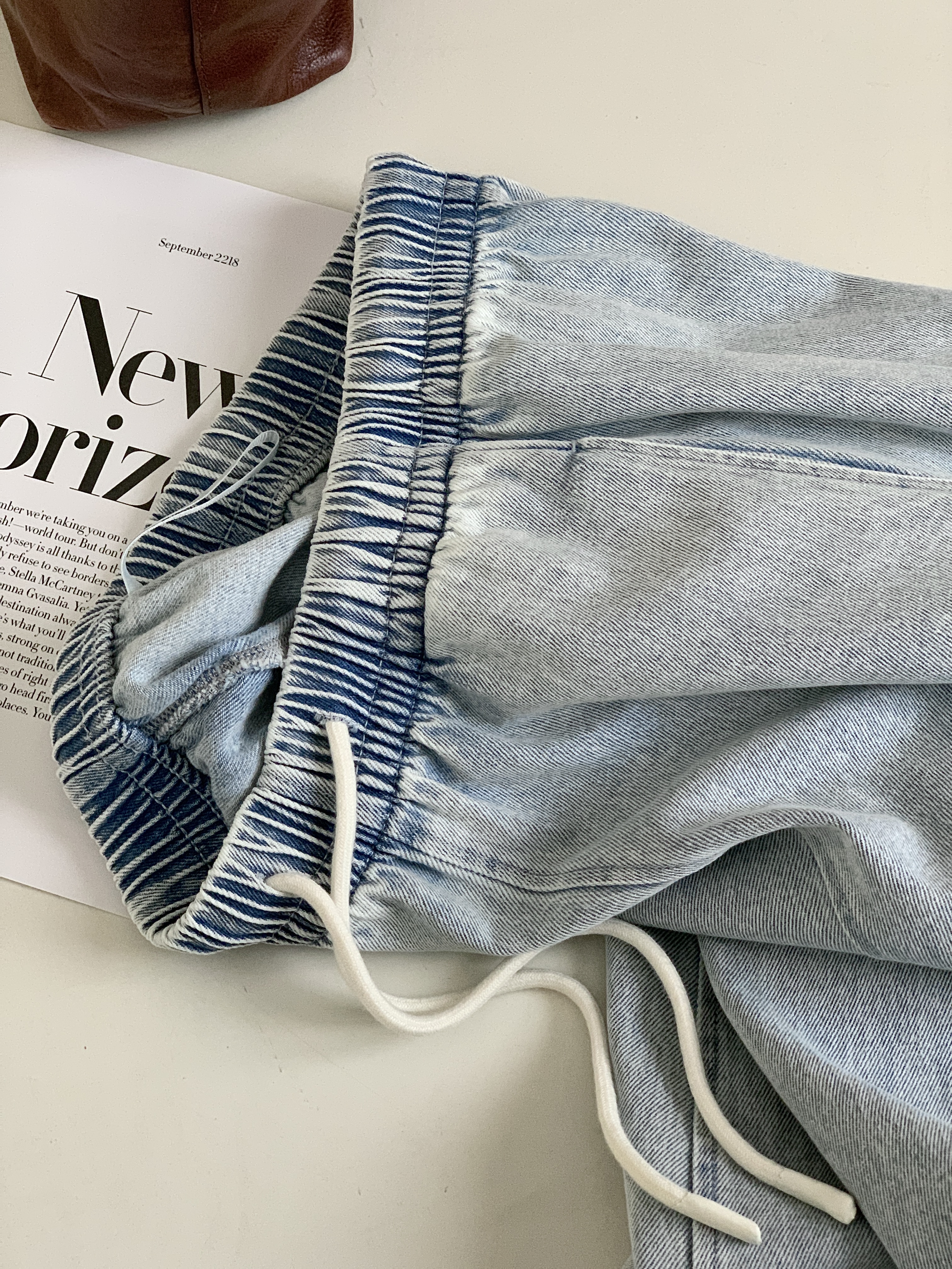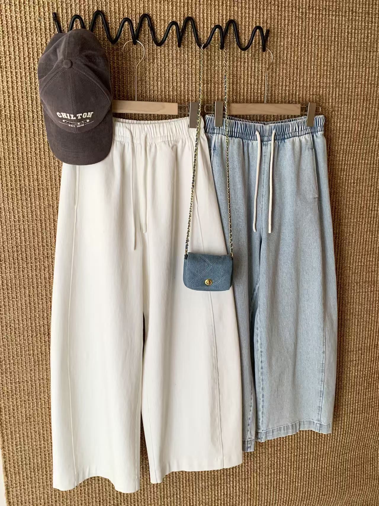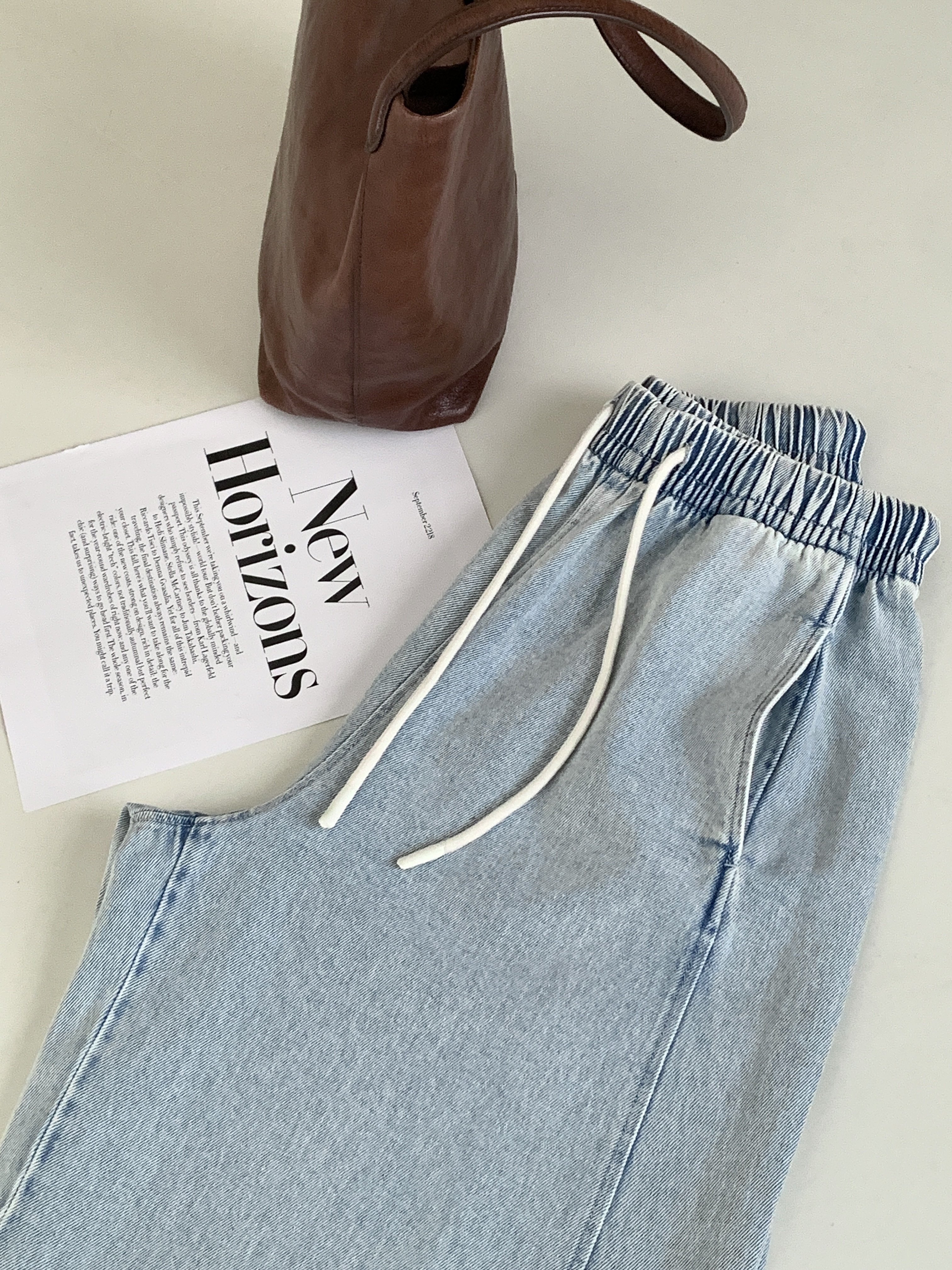 【多妈团购 汀蓝白牛随心裤 腿粗闭眼拍(预售10天发)】开春穿太合适了!九分裤长,清爽不拖沓,懒人抽绳松紧腰头设计,颜色自然又温柔,遮肉效果绝了-连横