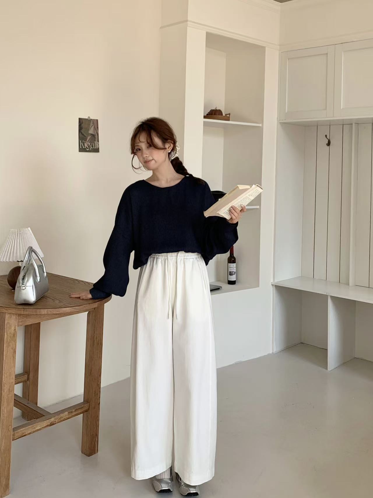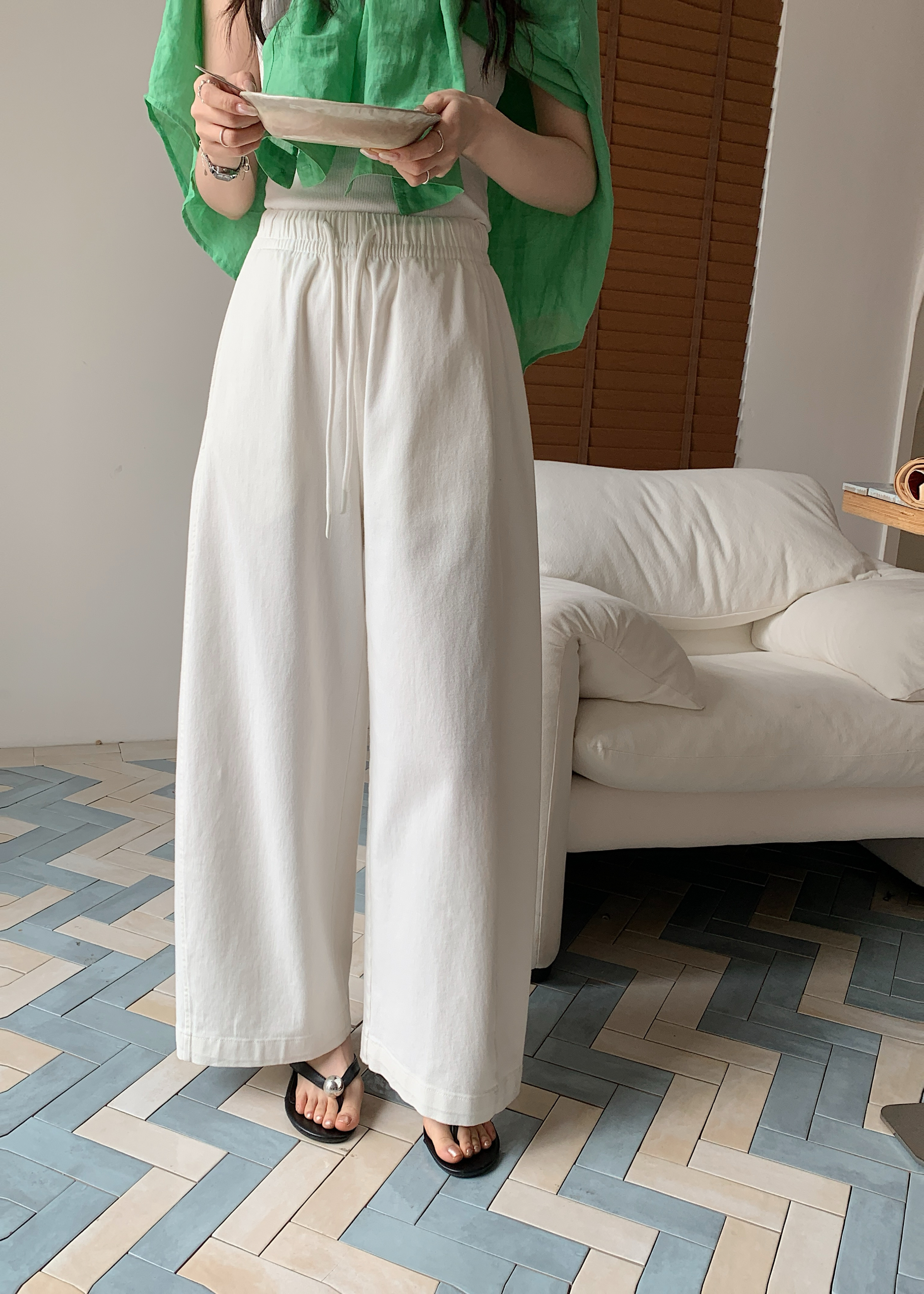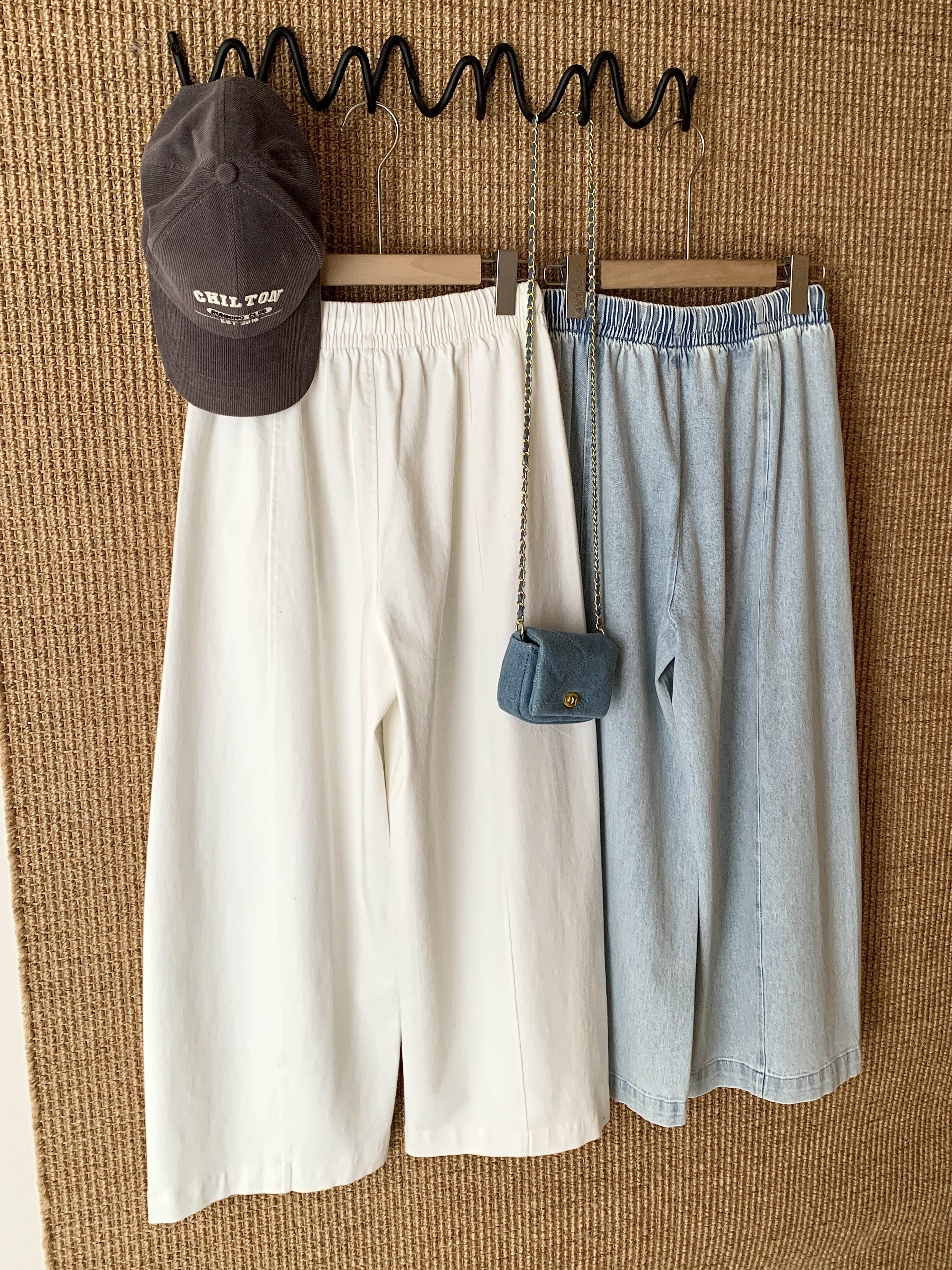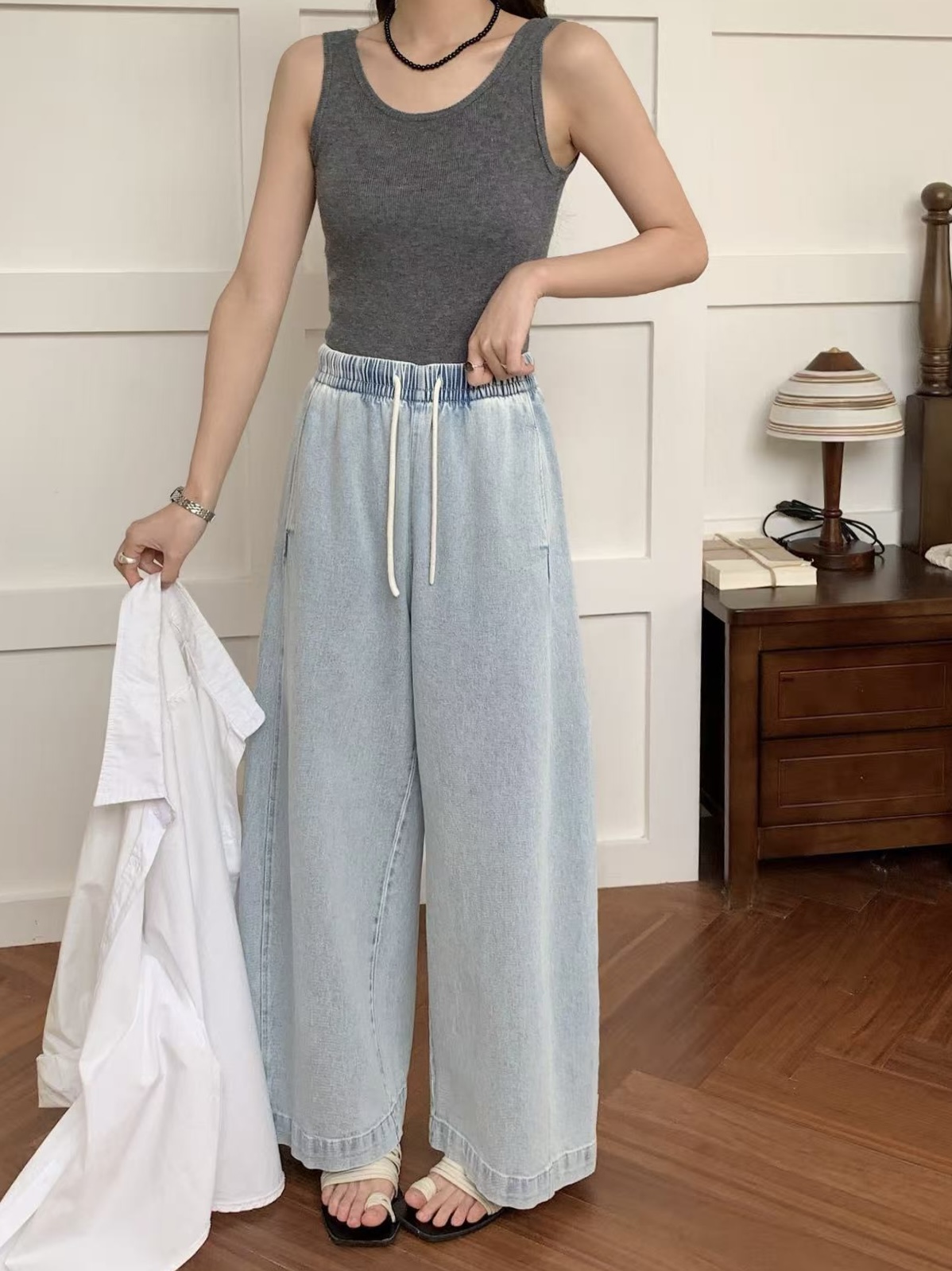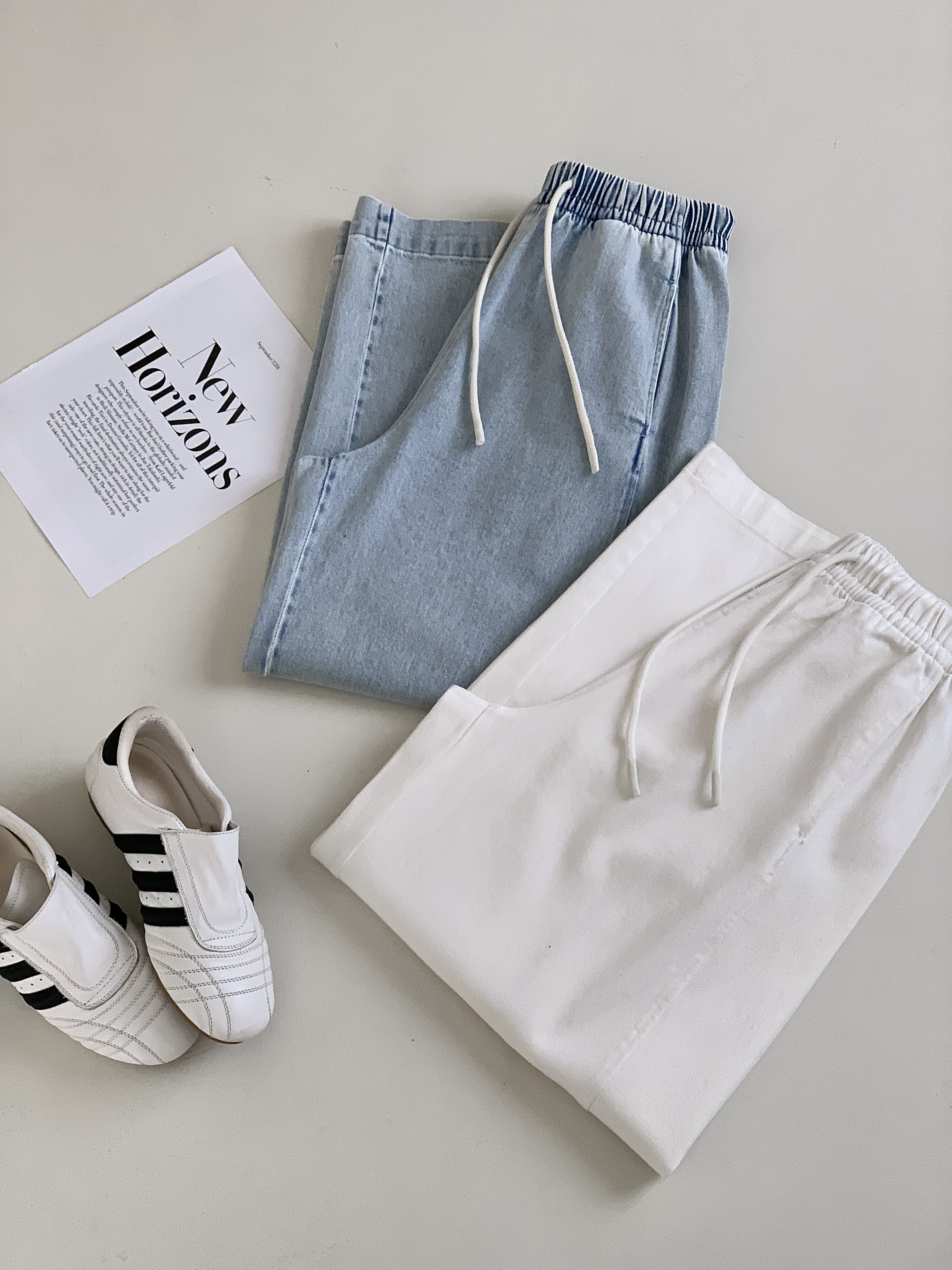 【多妈团购 汀蓝白牛随心裤 腿粗闭眼拍(预售10天发)】开春穿太合适了!九分裤长,清爽不拖沓,懒人抽绳松紧腰头设计,颜色自然又温柔,遮肉效果绝了-连横