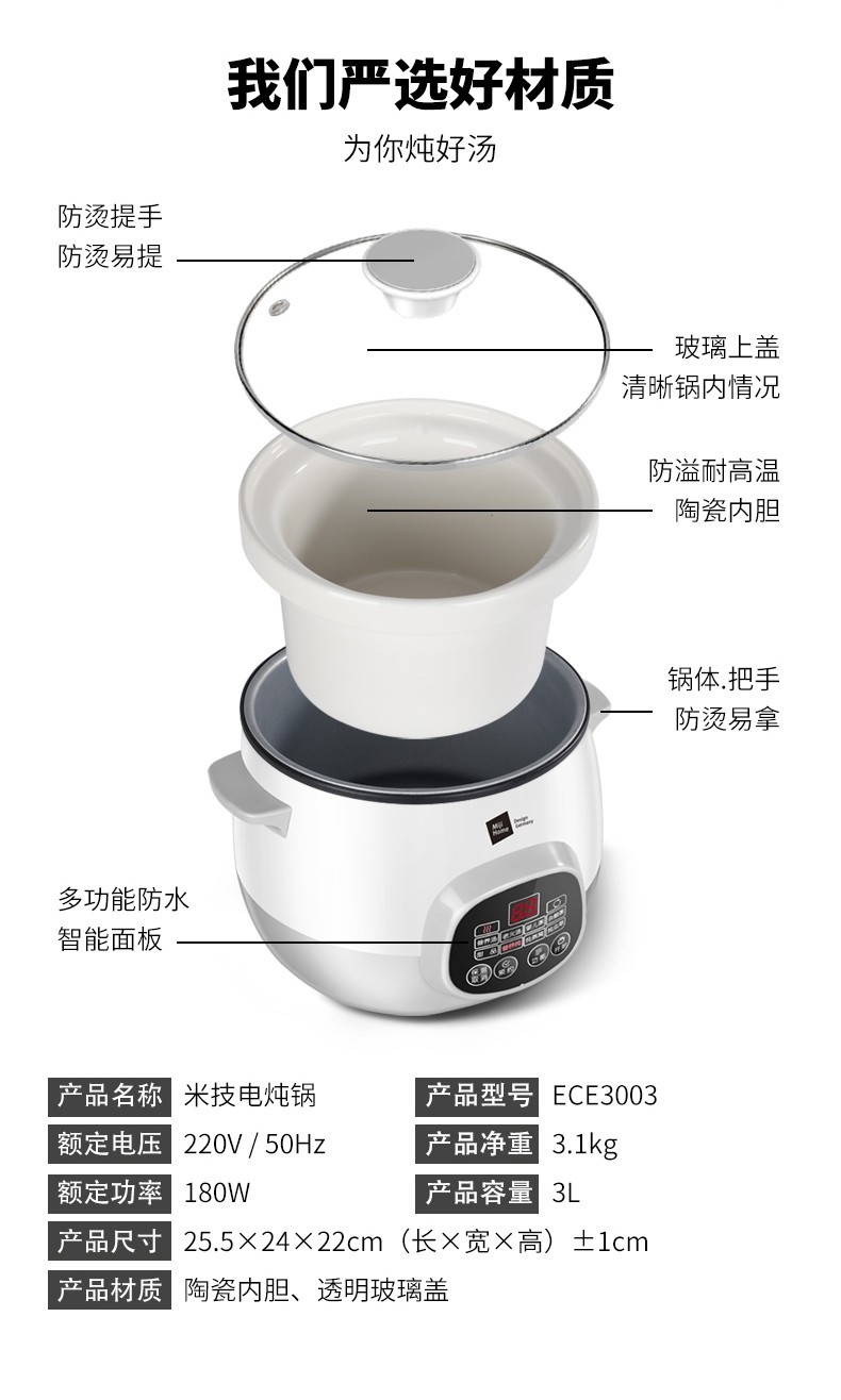 德国 米技 ECE3003电炖锅 煮粥煲汤 3升 陶瓷内胆 文火慢炖玻璃锅盖 ECE3003