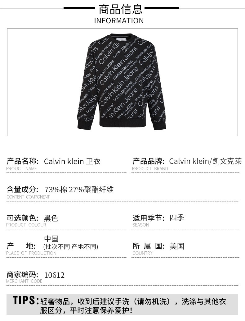 凯文克莱(Calvin Klein)男装CK男士连帽卫衣春秋薄款10612