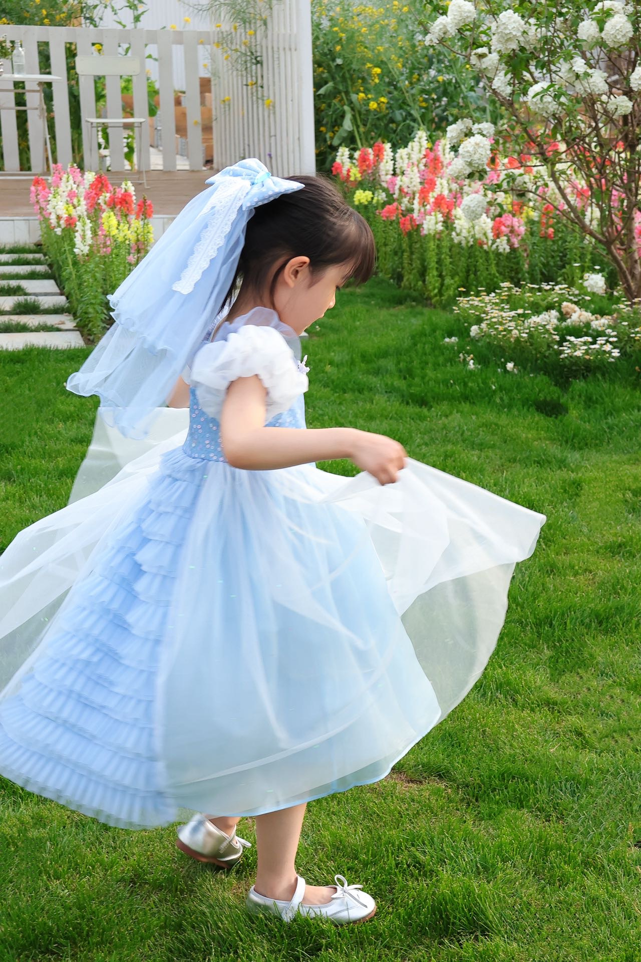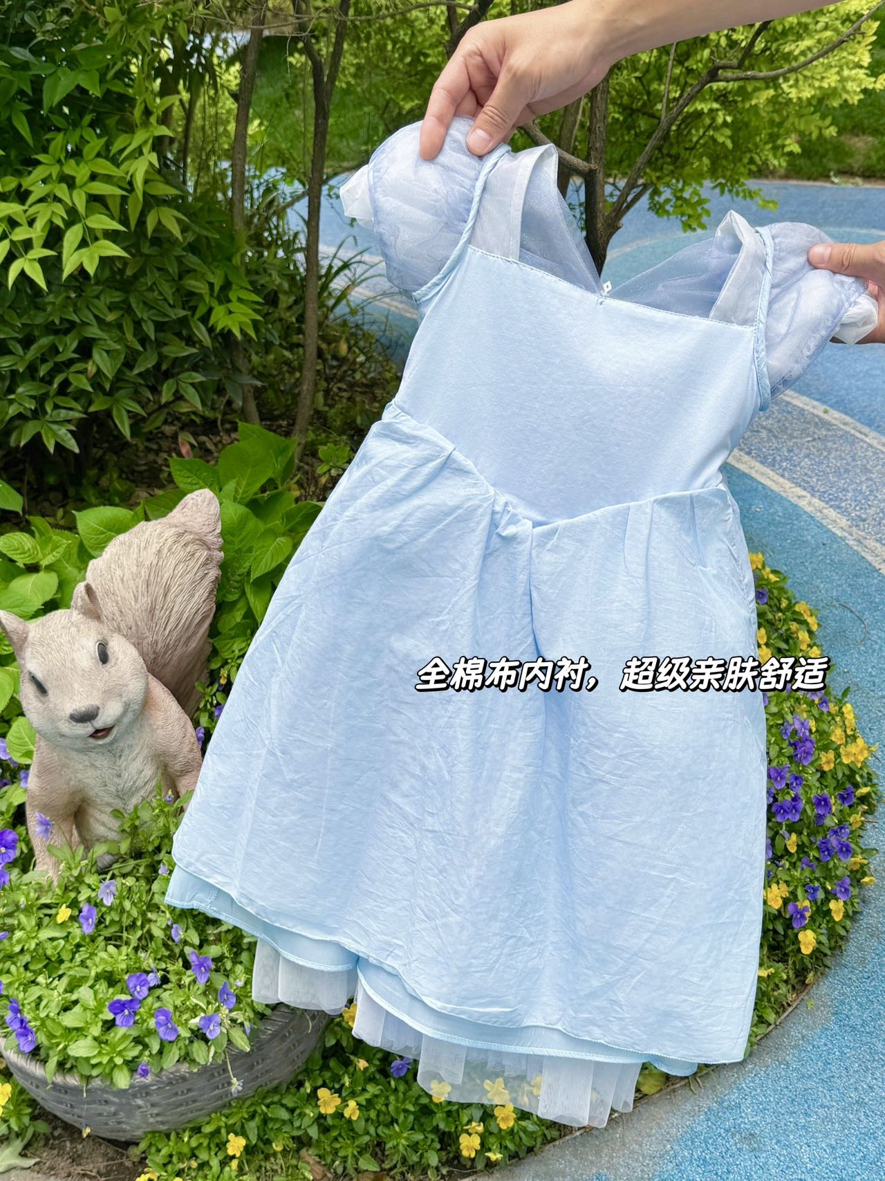 裙摆第一层网纱100%聚酯纤维,第二层百合缎100%聚酯纤维,第三层里料100%棉;辅料除外