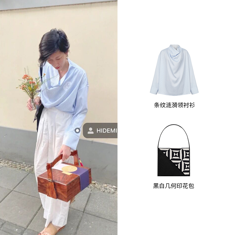 HIDEMI 夏日清透深海蓝色织竖条纹套装 口袋衬衫/喇叭型宽松长裤