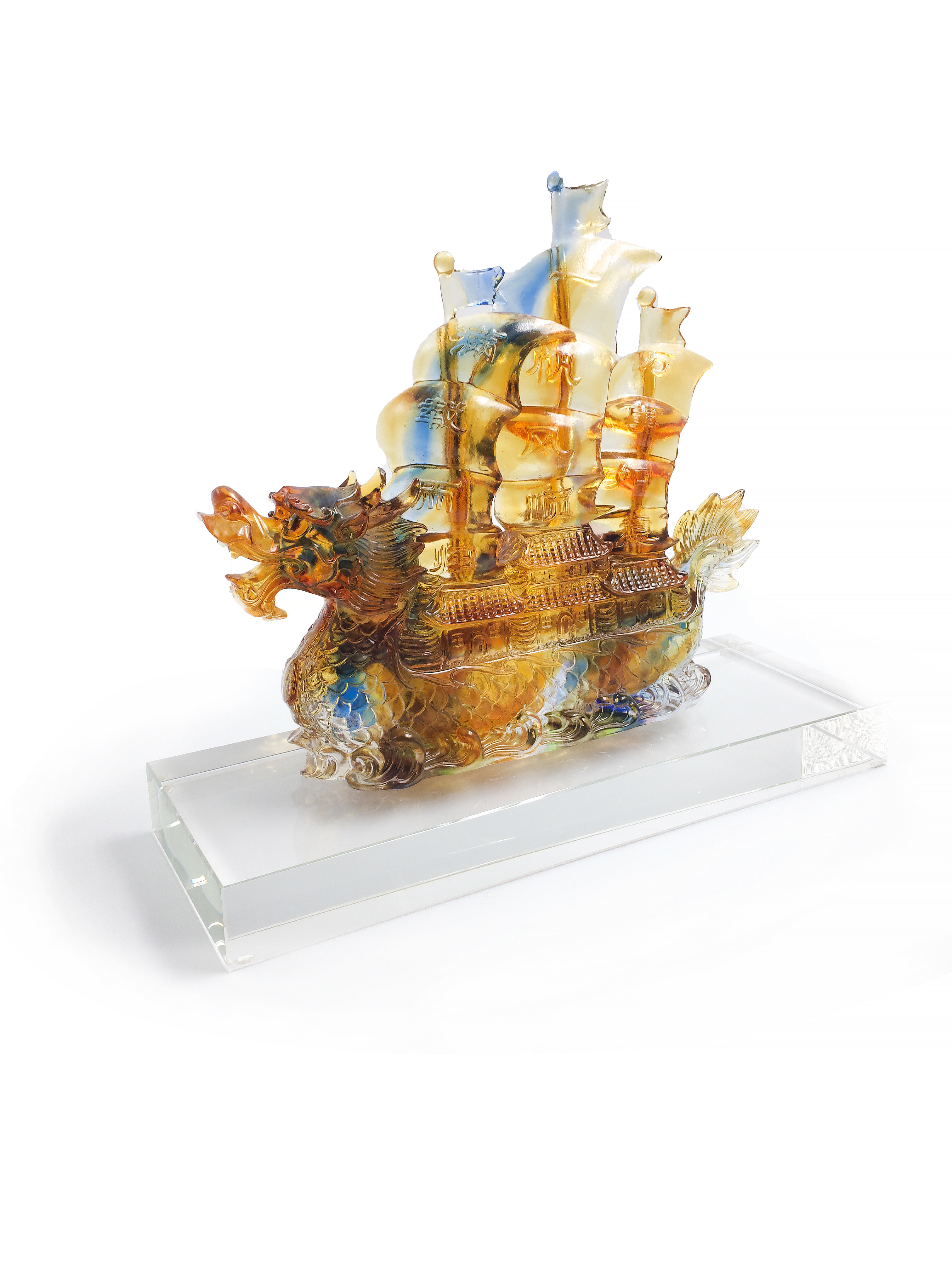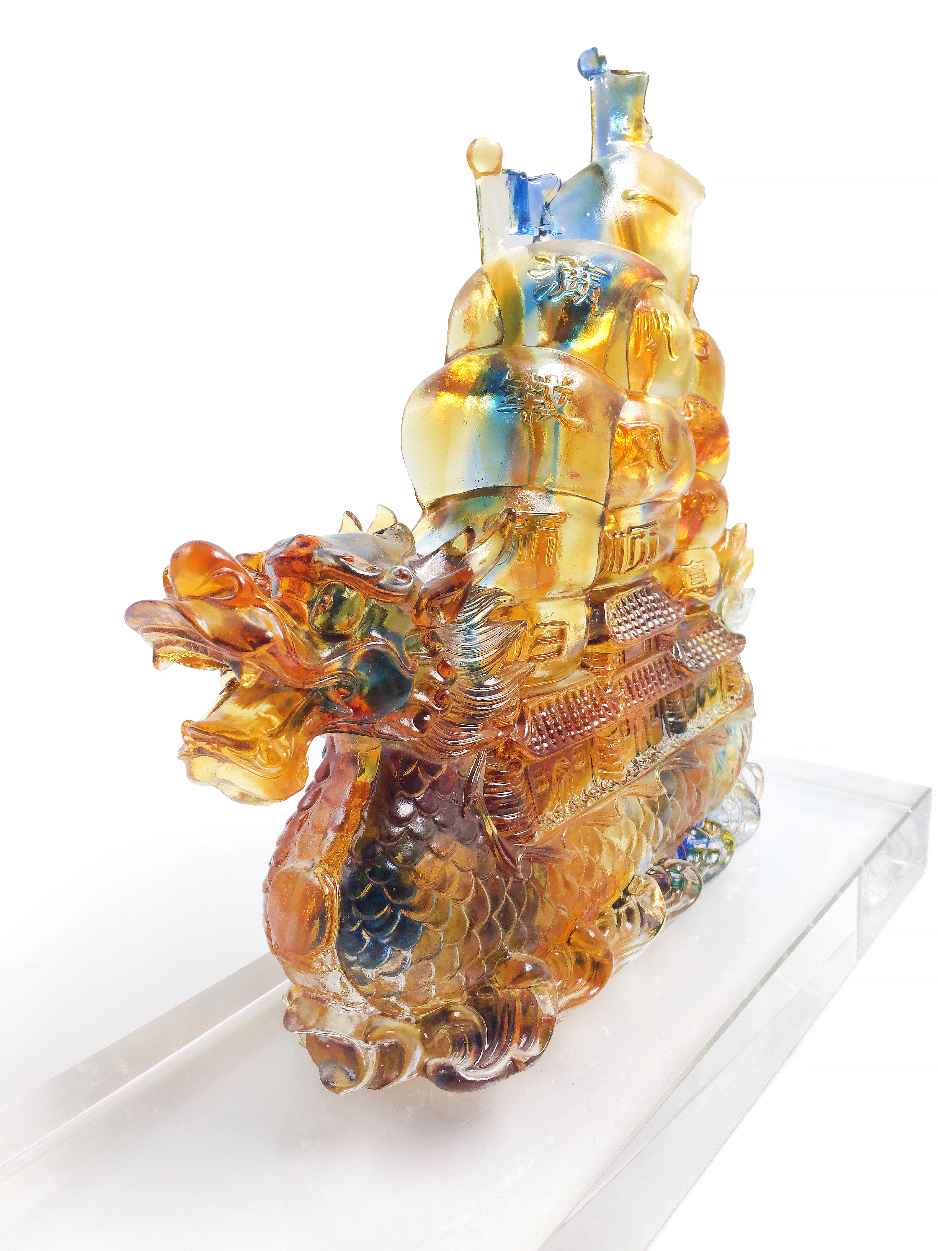 整个作品威武霸气加之琉璃本身的特点晶莹剔透精致细腻的铸造表现、瑰丽变幻的色彩流动,使其深具无可比拟的独特魅力和艺术价值。并且在文化寓意上含有广结“龙缘”,广得“龙福”:给人以“龙精虎猛,顺风顺水”精进美好的联想