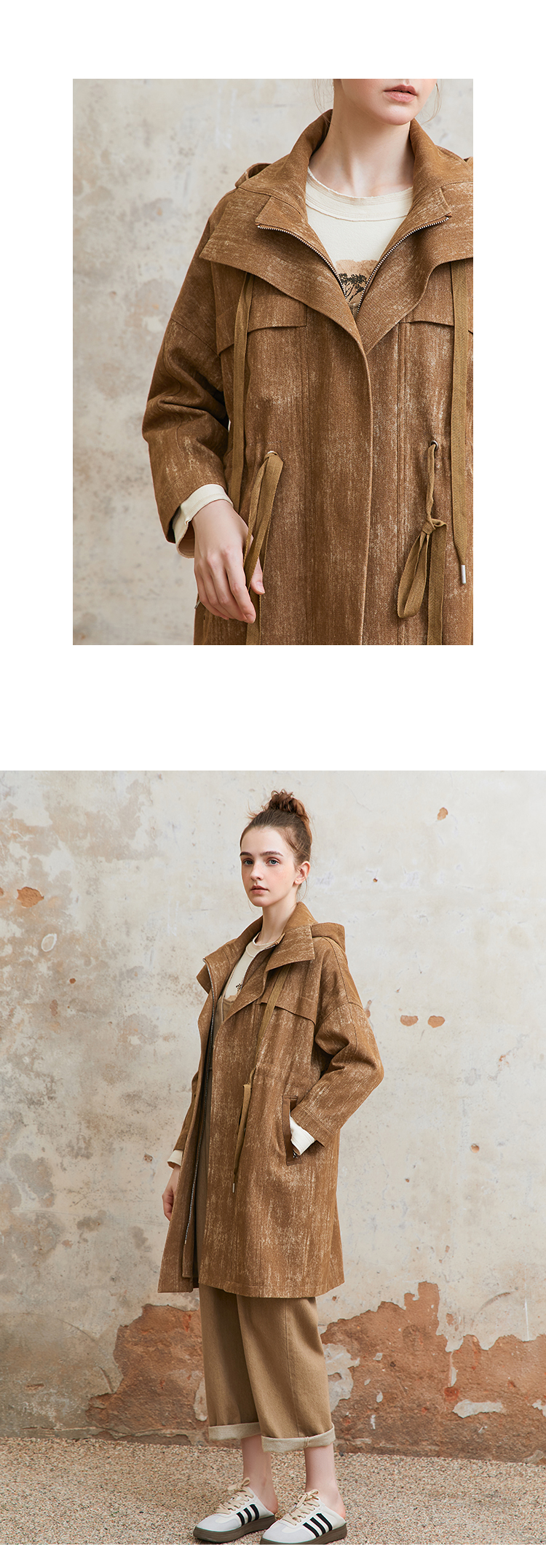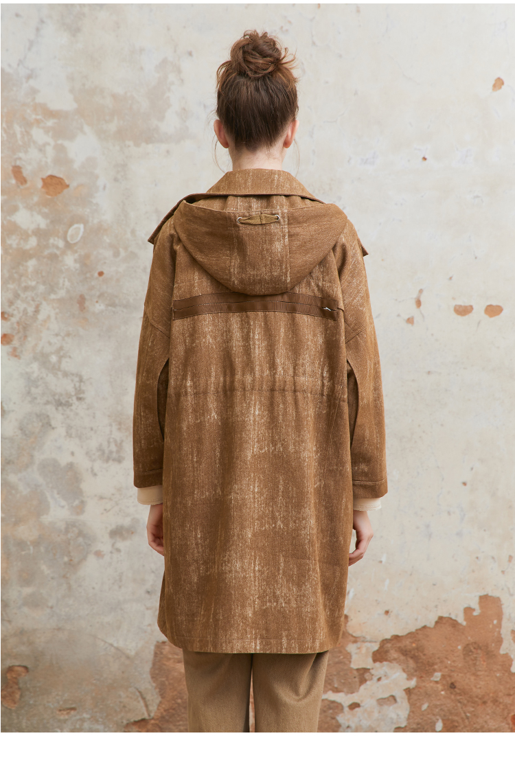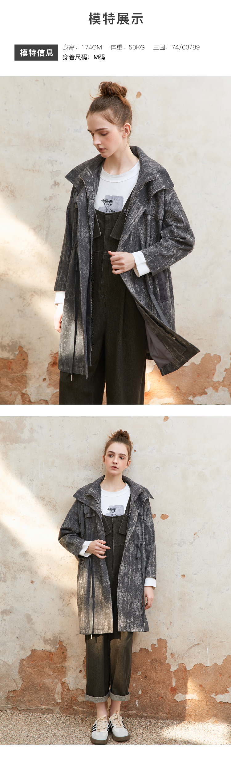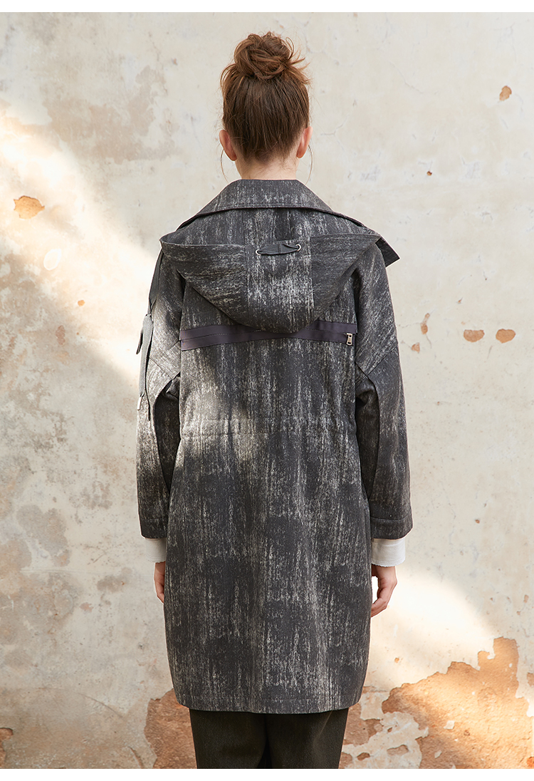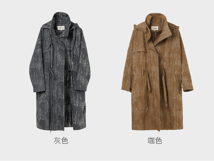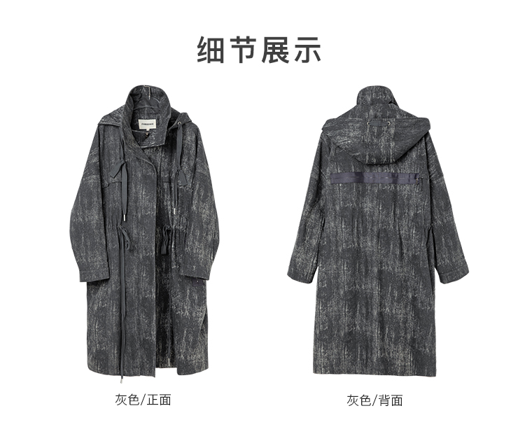 famecoco范可儿刷色印花中长款风衣女士连帽抽绳外套FAC1AA006