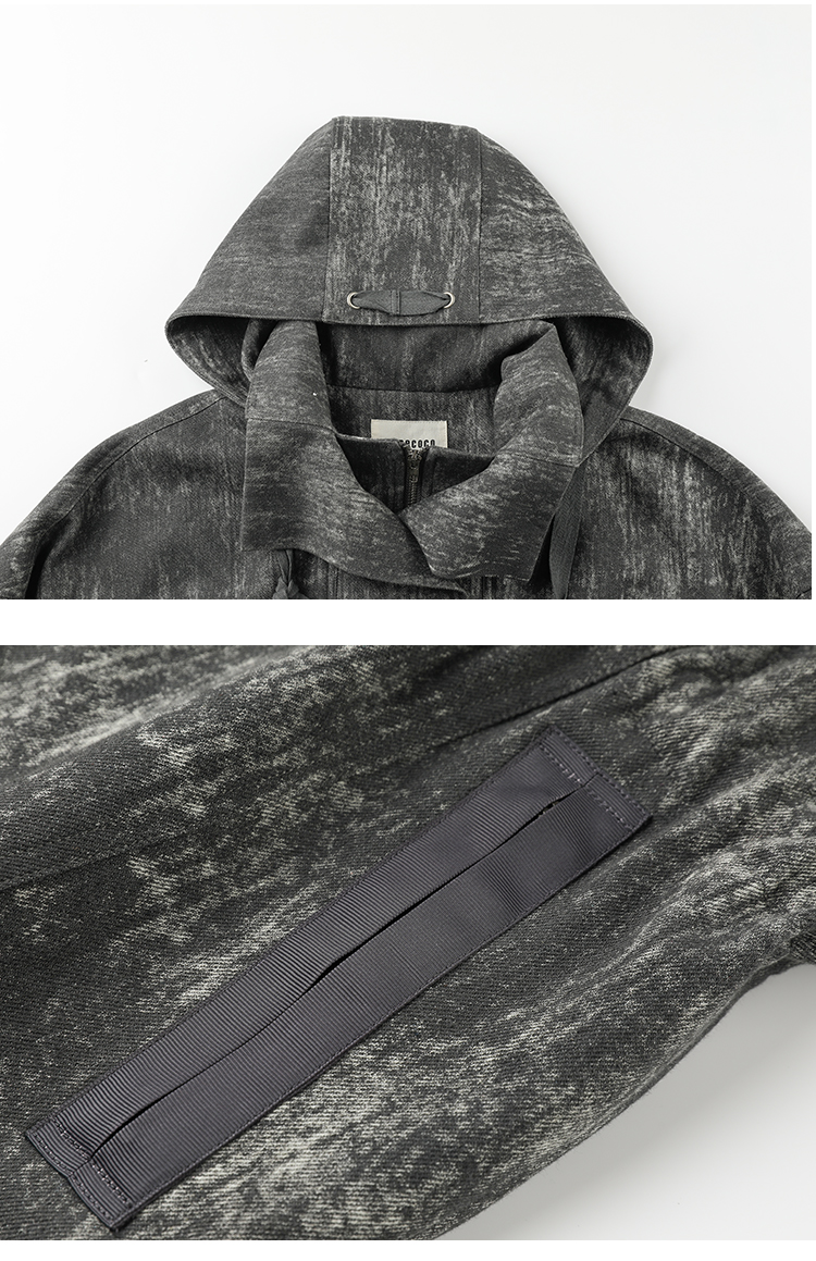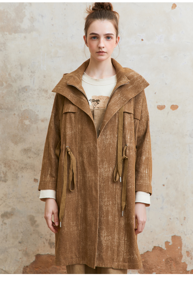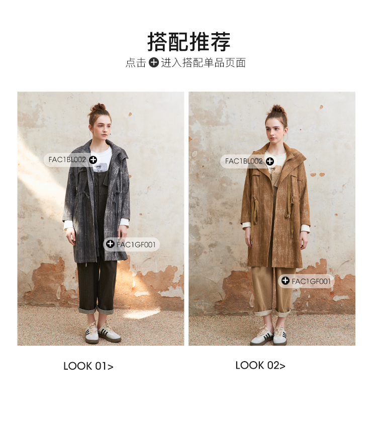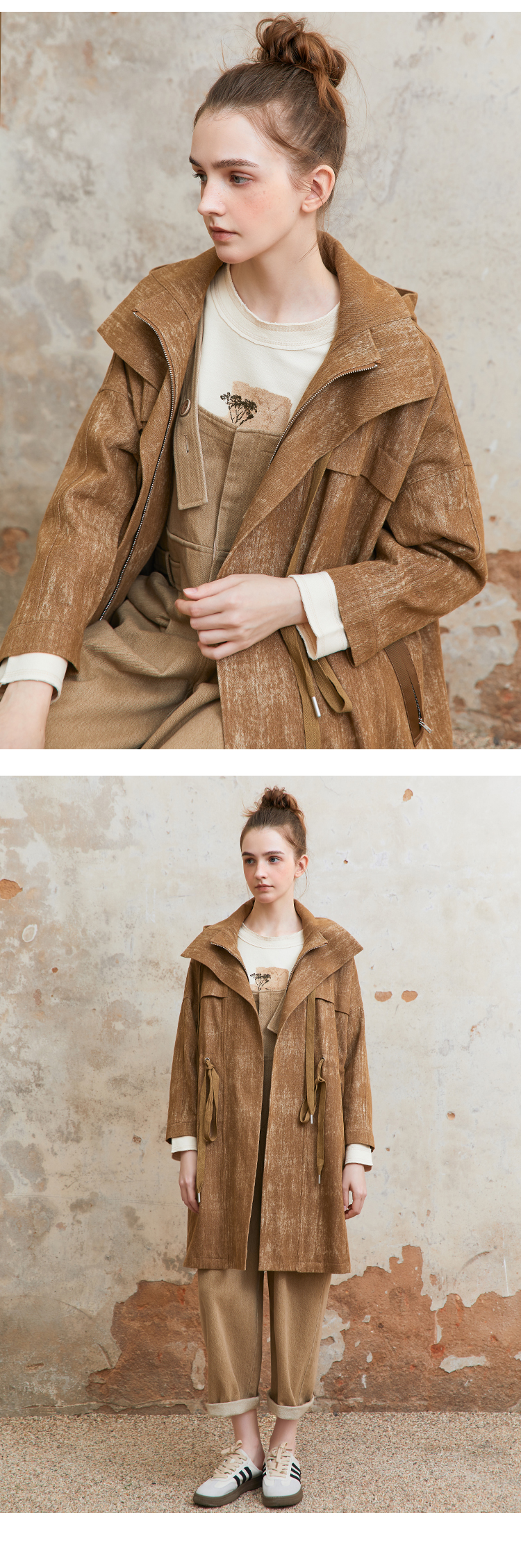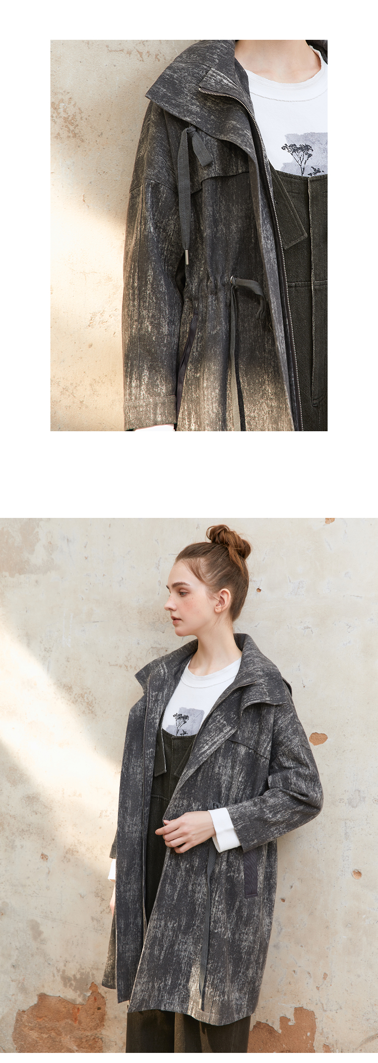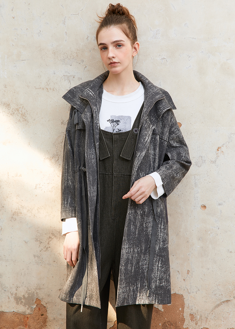 famecoco范可儿刷色印花中长款风衣女士连帽抽绳外套FAC1AA006