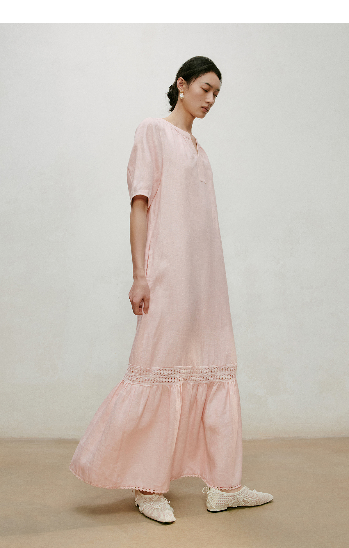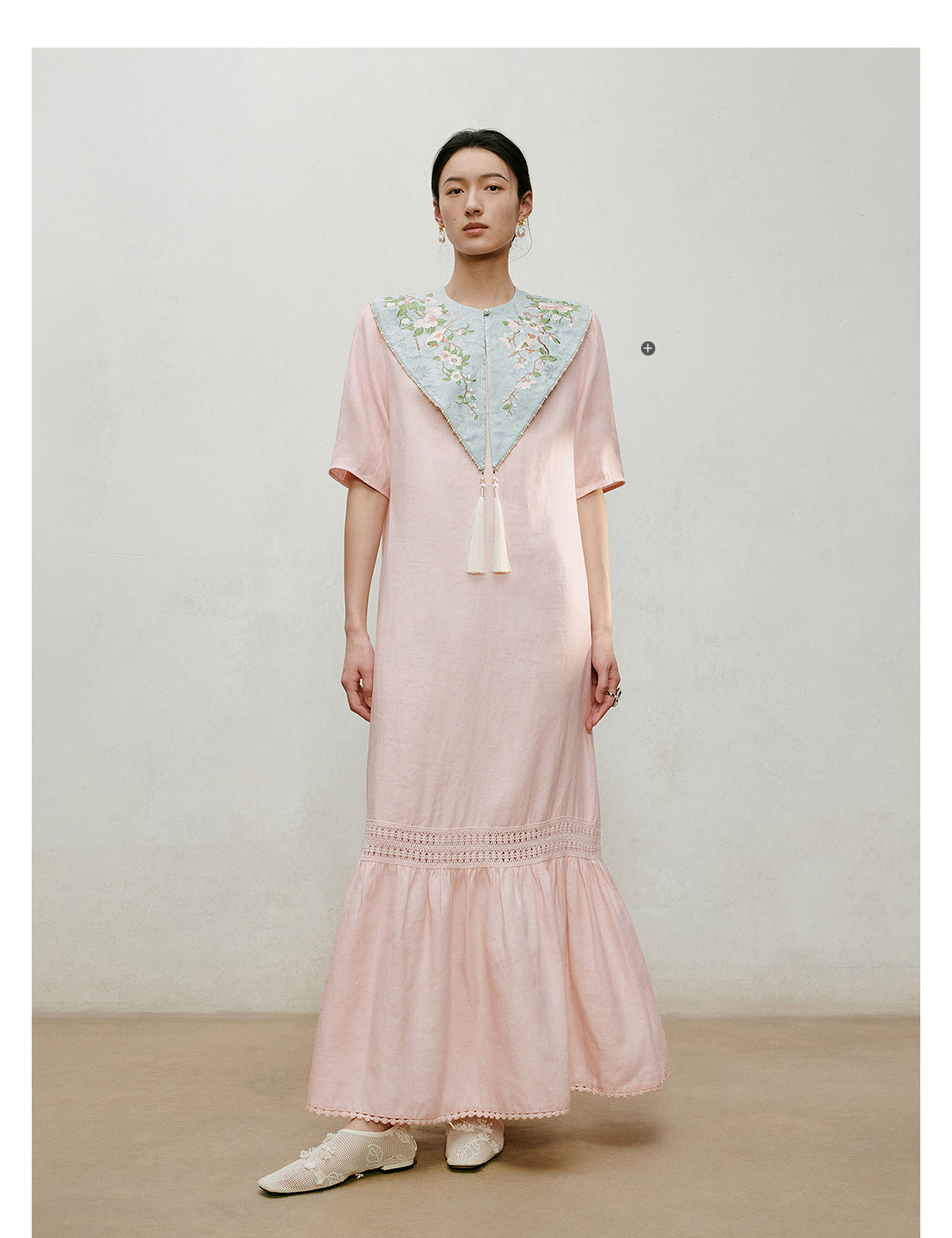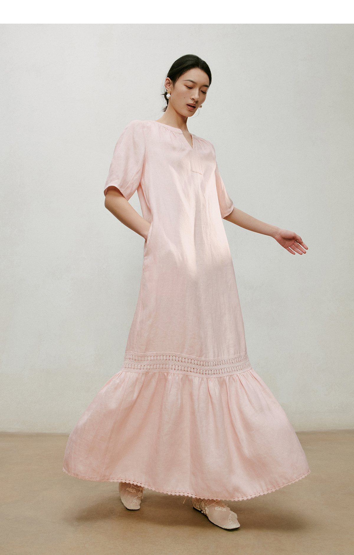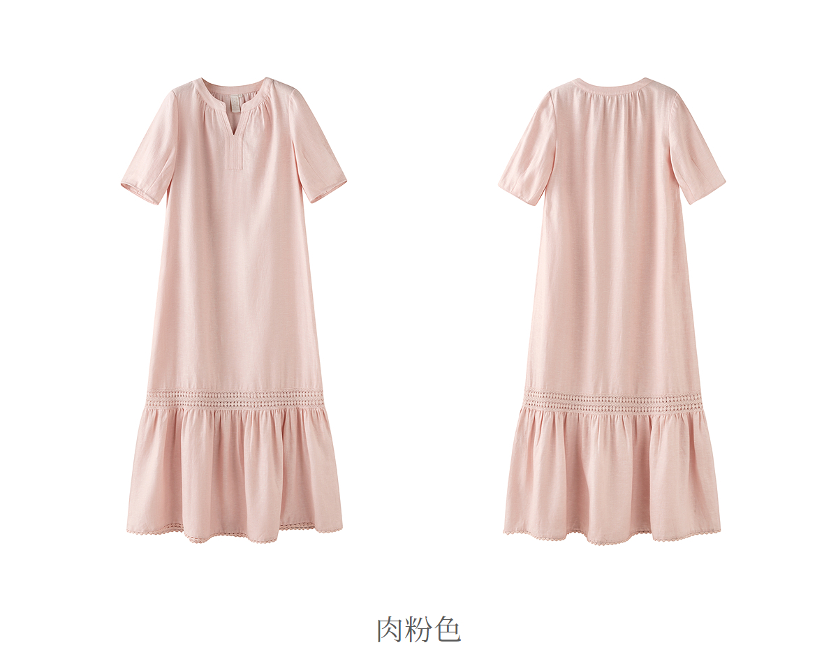 【林栖设计小店】漫芳华|肉粉色花边温柔百搭宽松2026夏新款立领连衣裙1962092