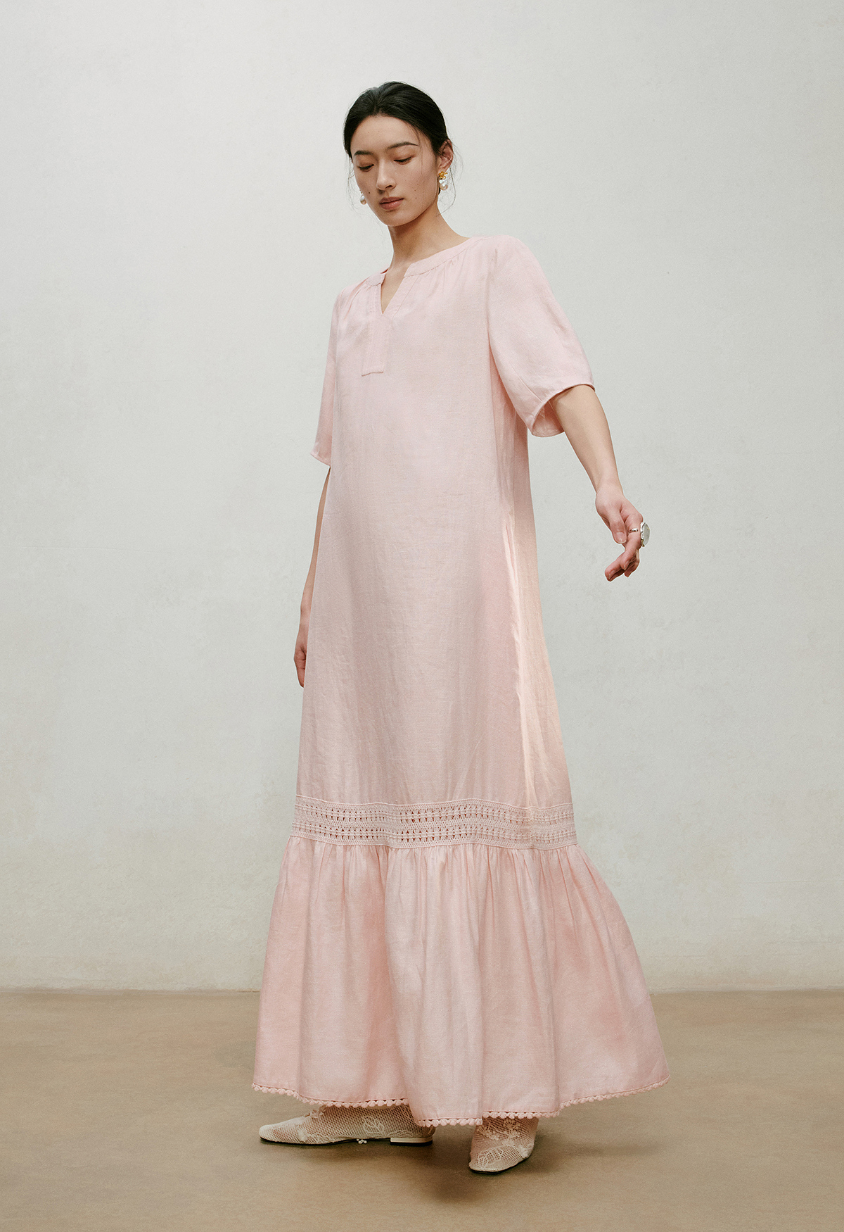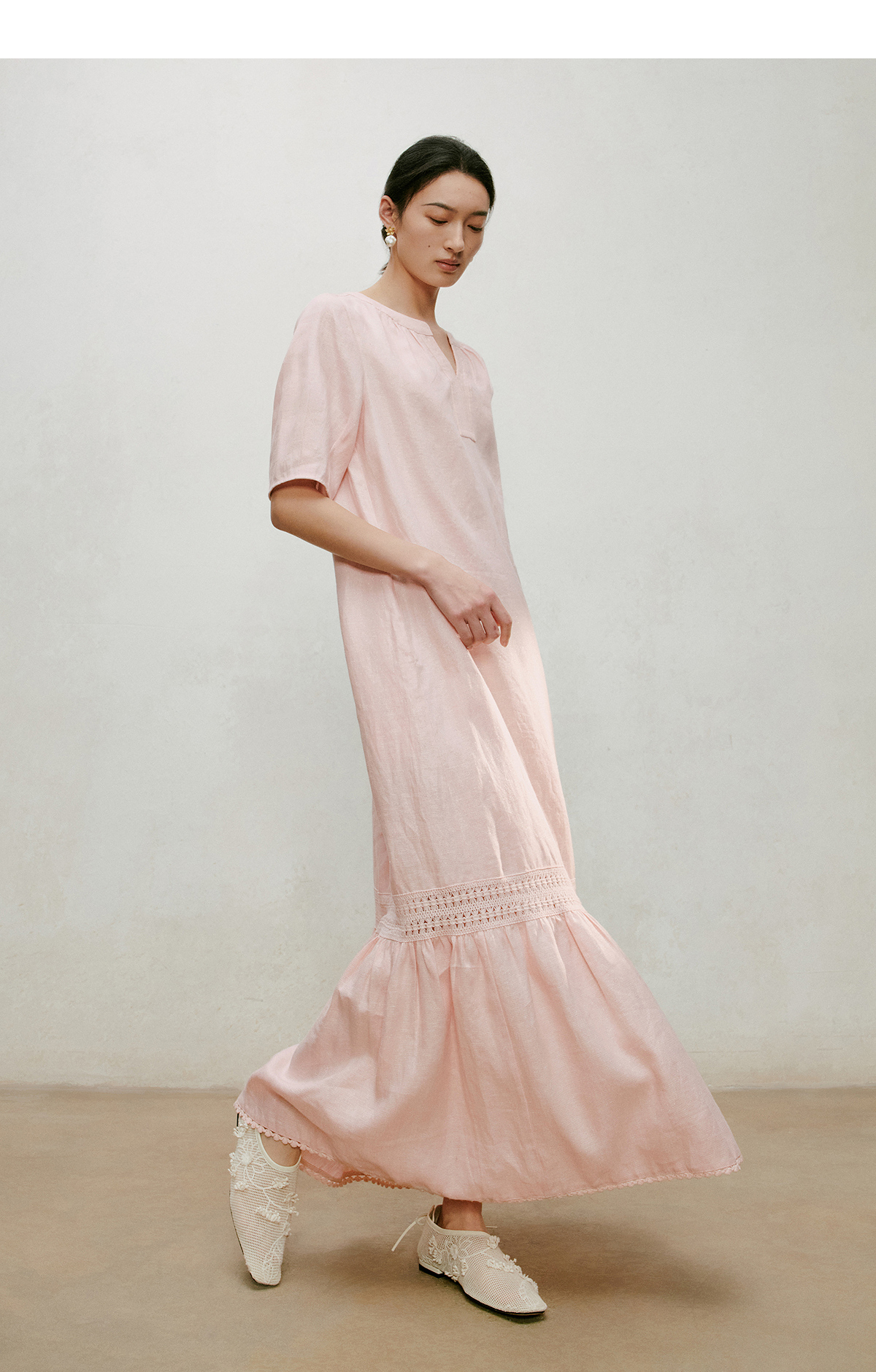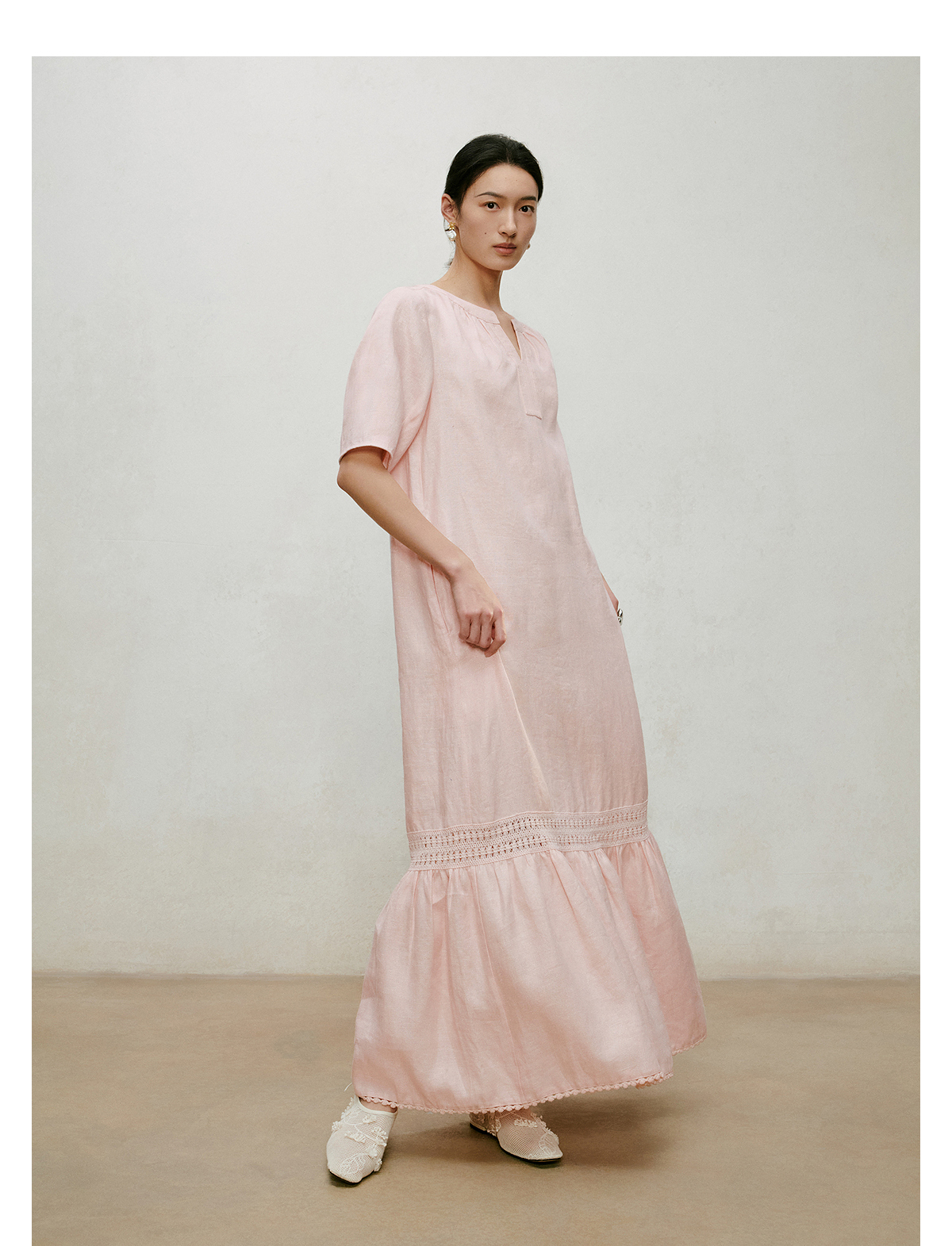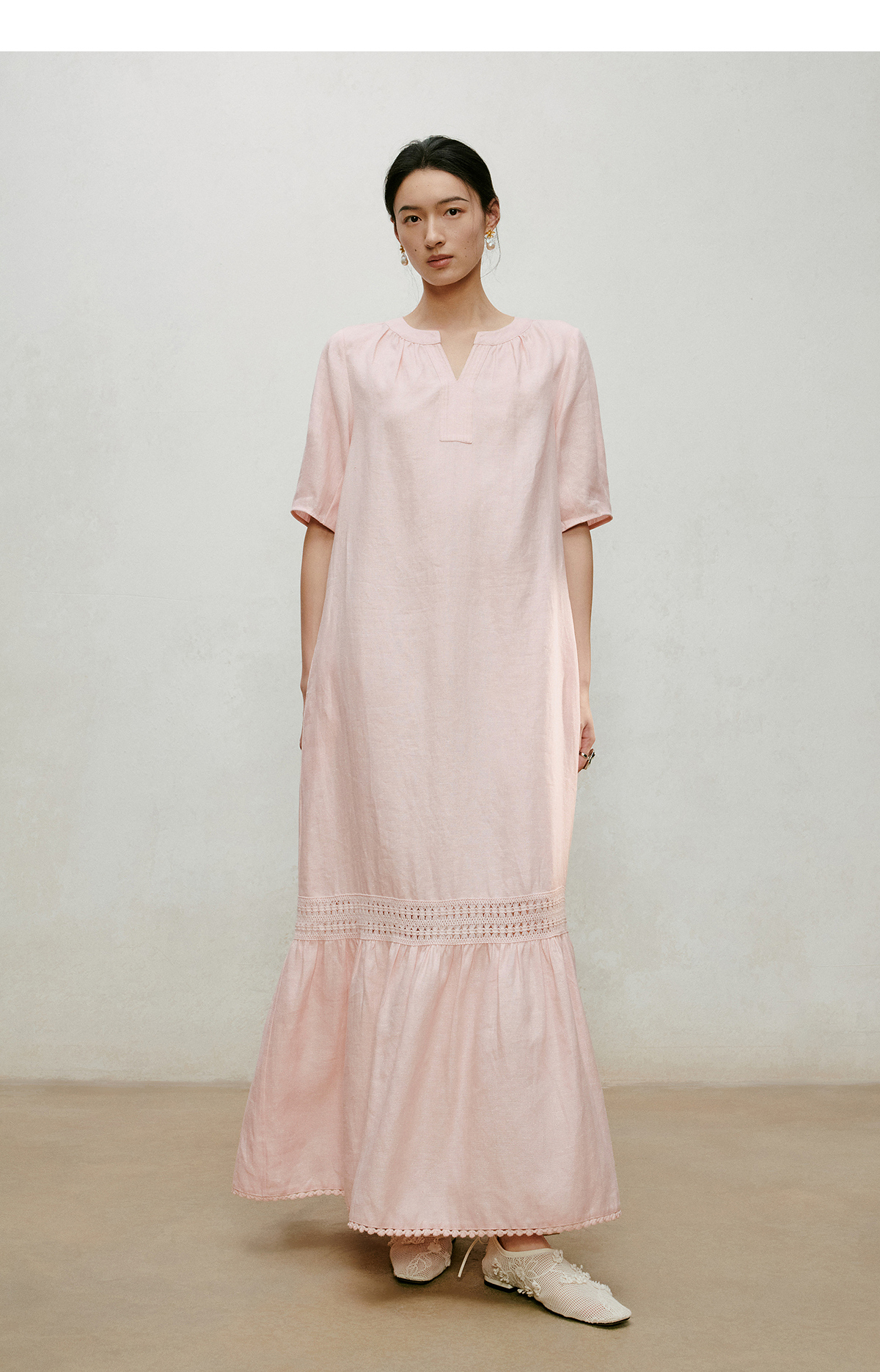 【林栖设计小店】漫芳华|肉粉色花边温柔百搭宽松2026夏新款立领连衣裙1962092