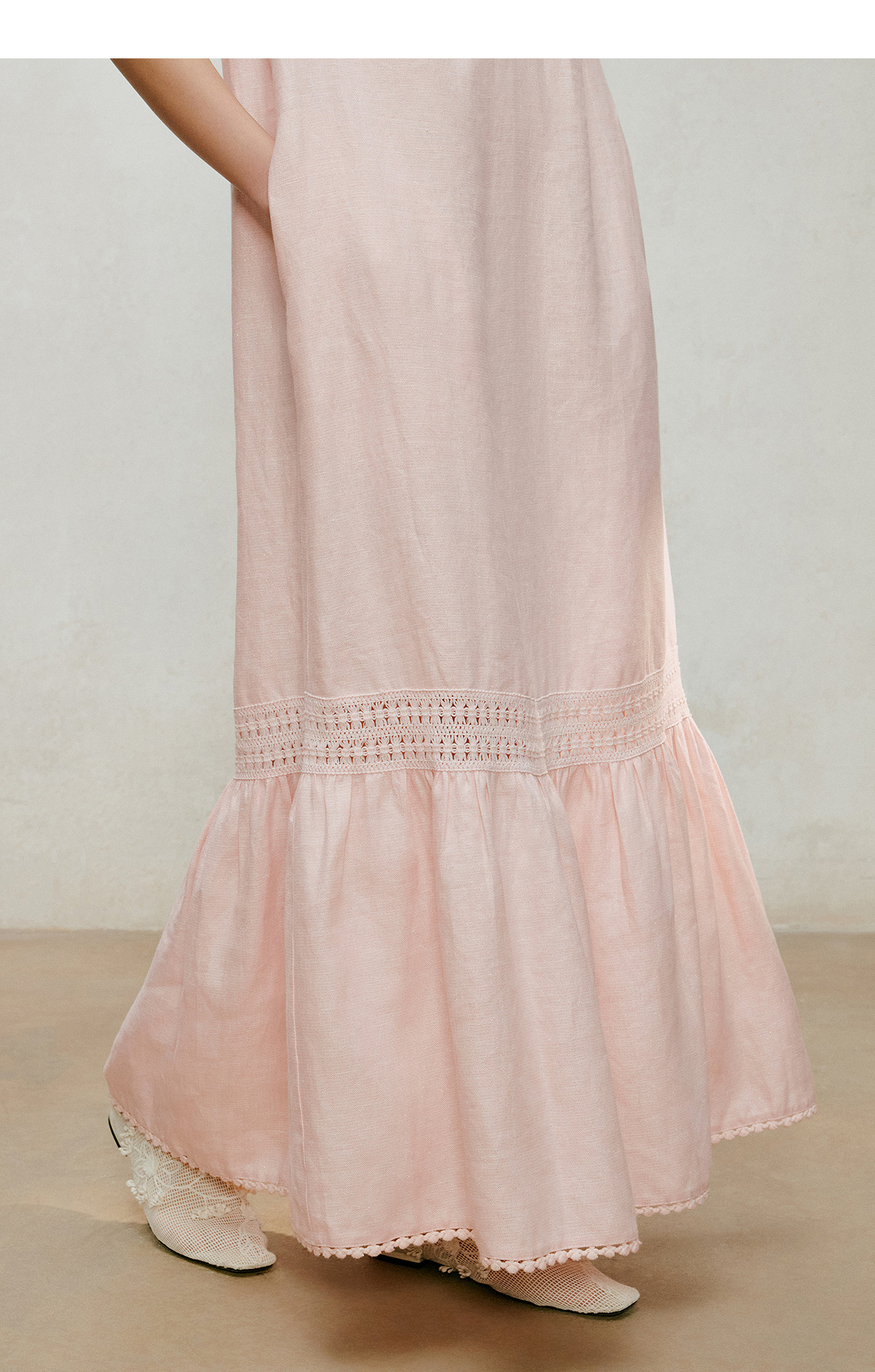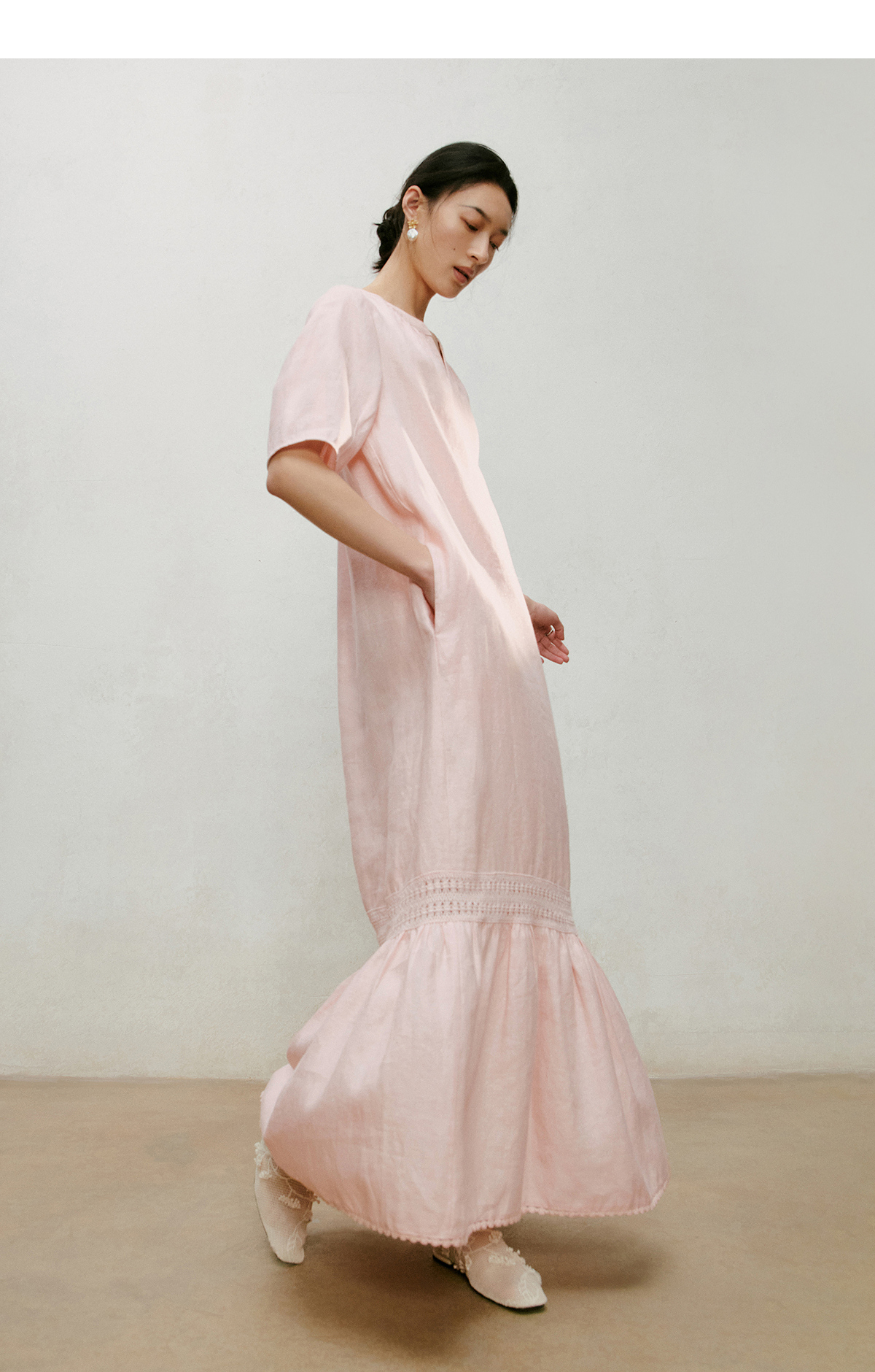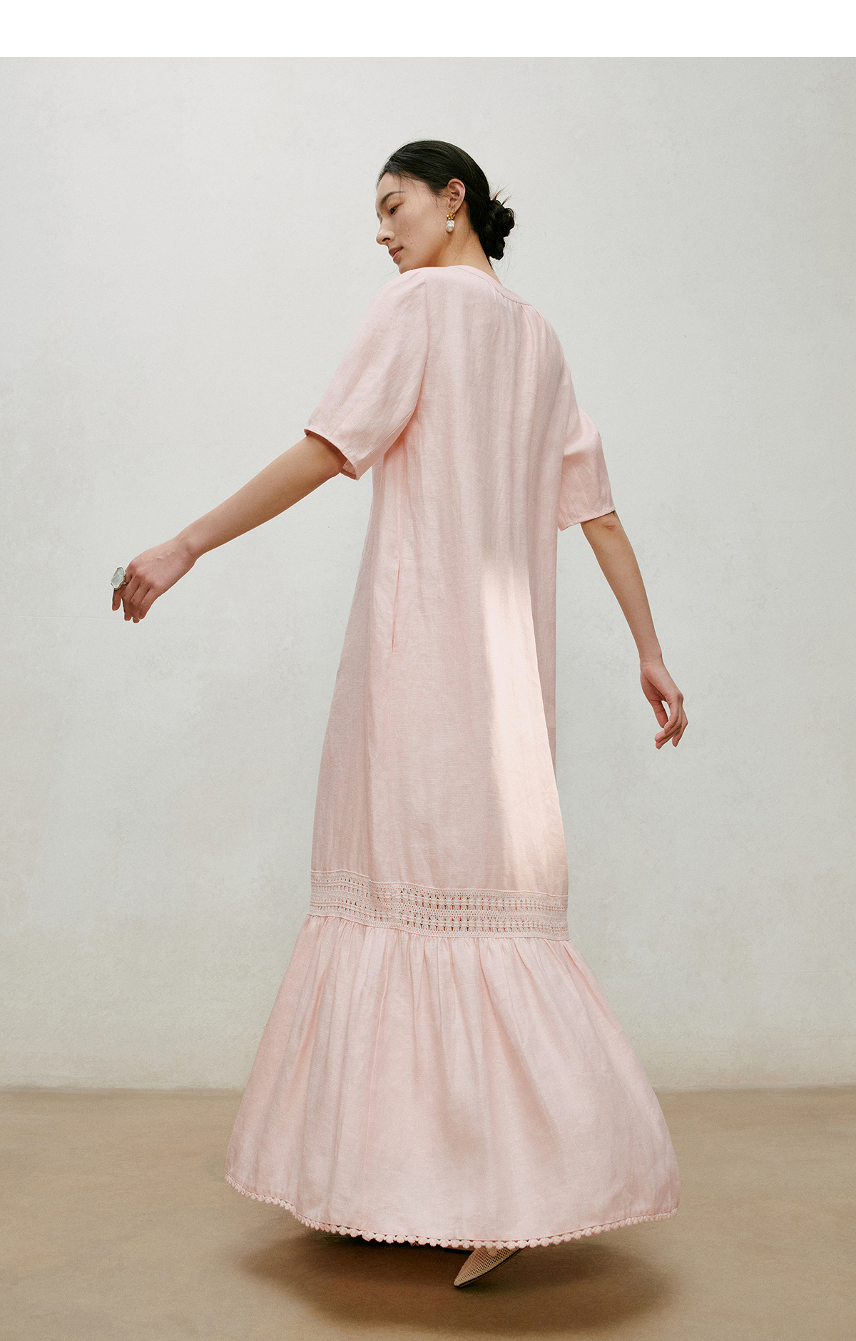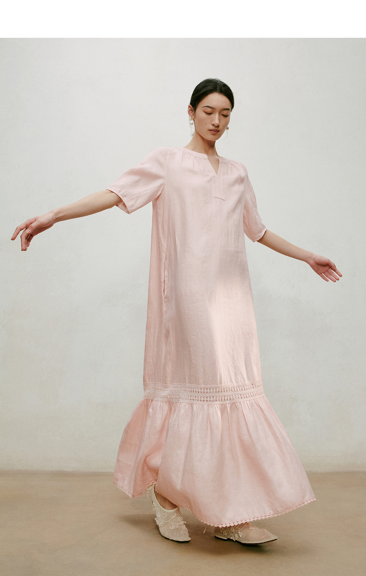 【林栖设计小店】漫芳华|肉粉色花边温柔百搭宽松2026夏新款立领连衣裙1962092