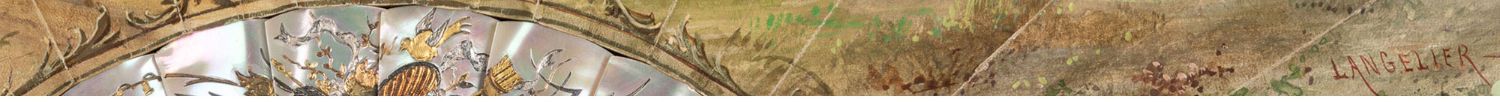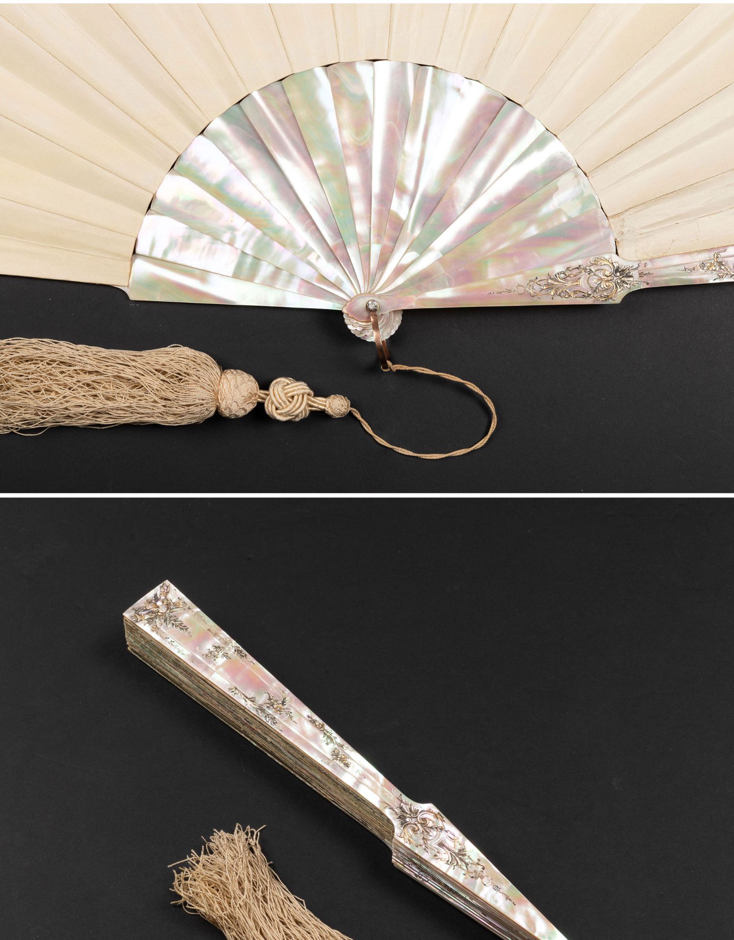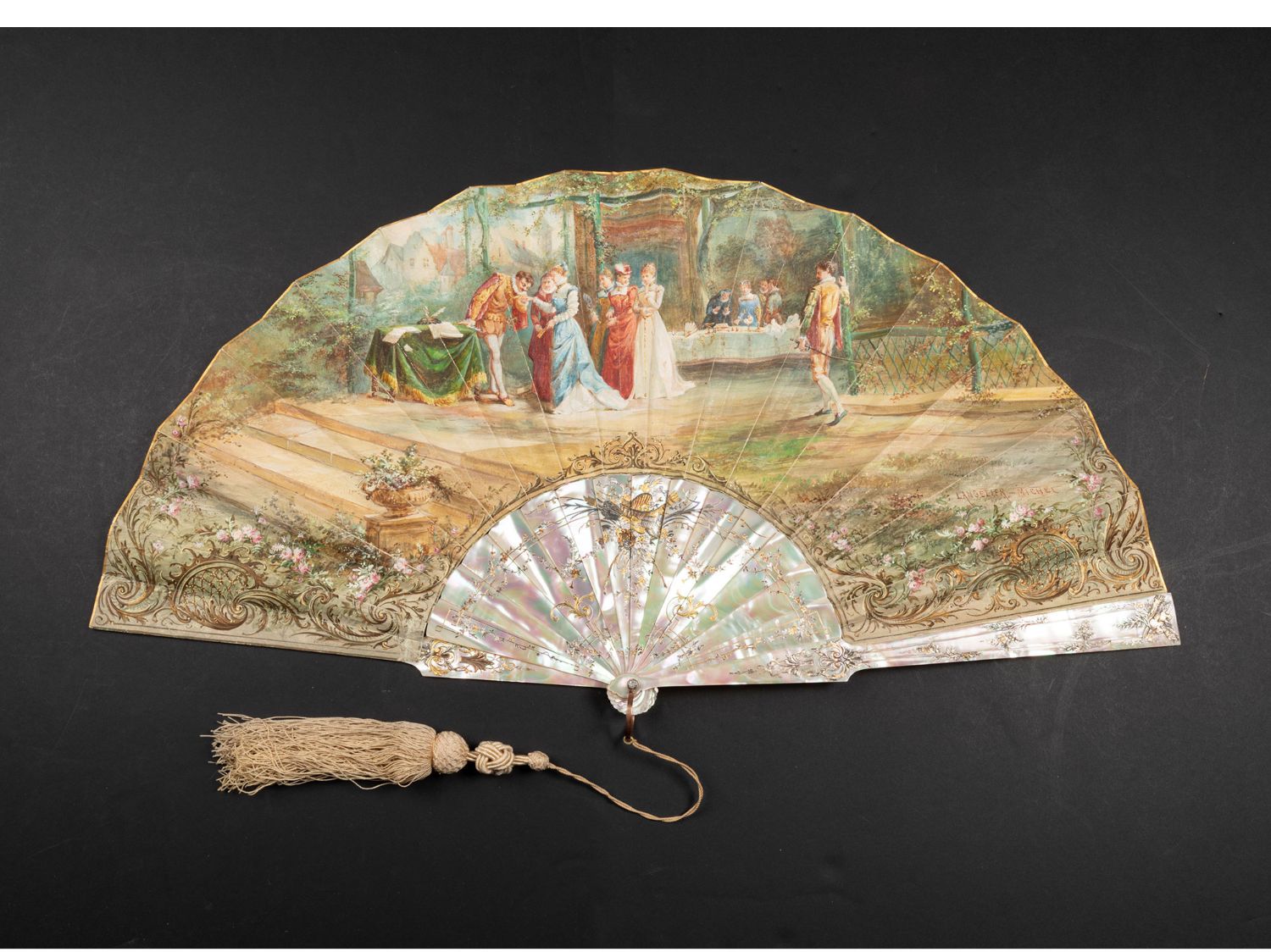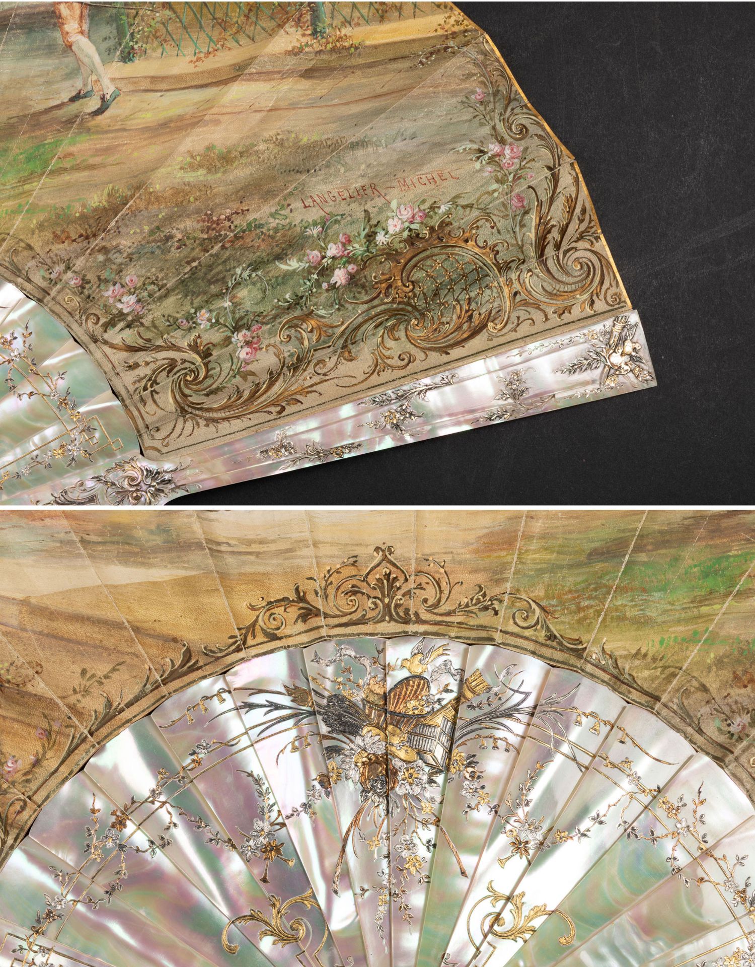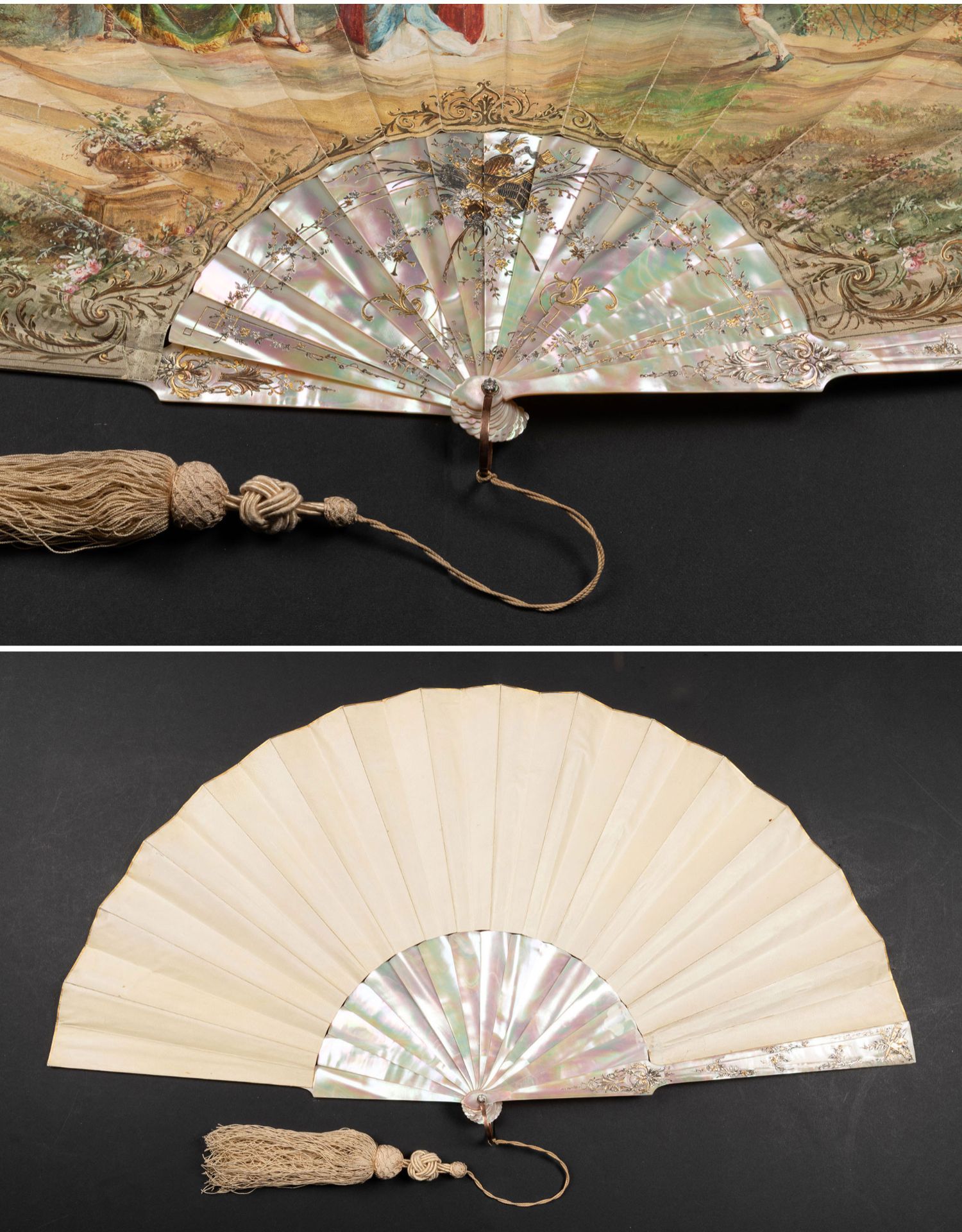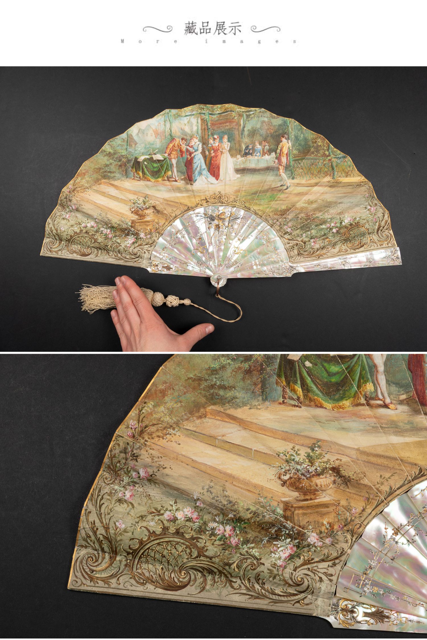 独角鹿西洋古董法国著名画师签名手绘天鹅皮扇面描金母贝扇骨折扇