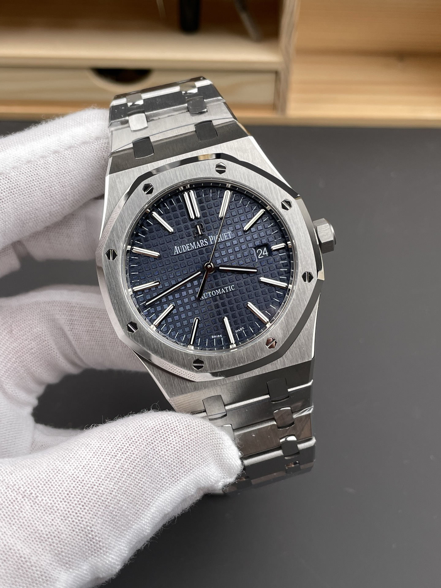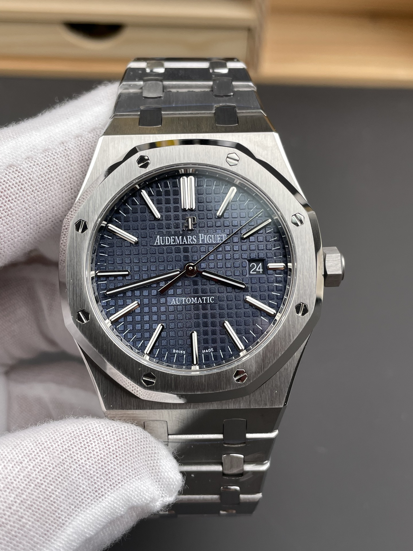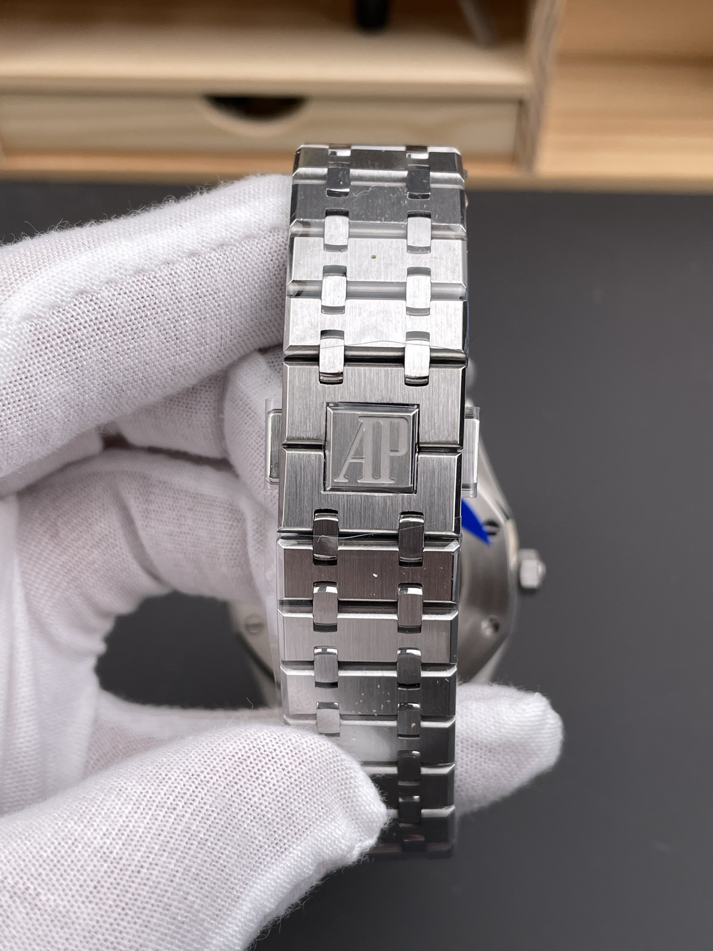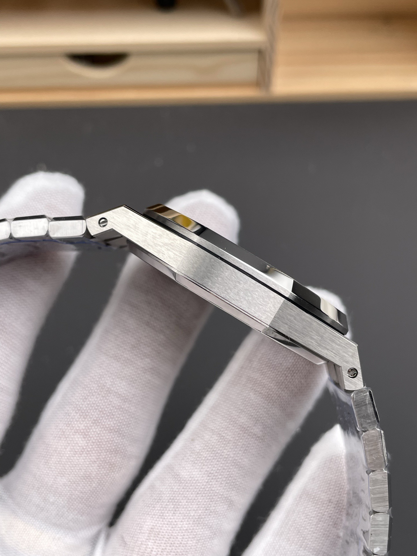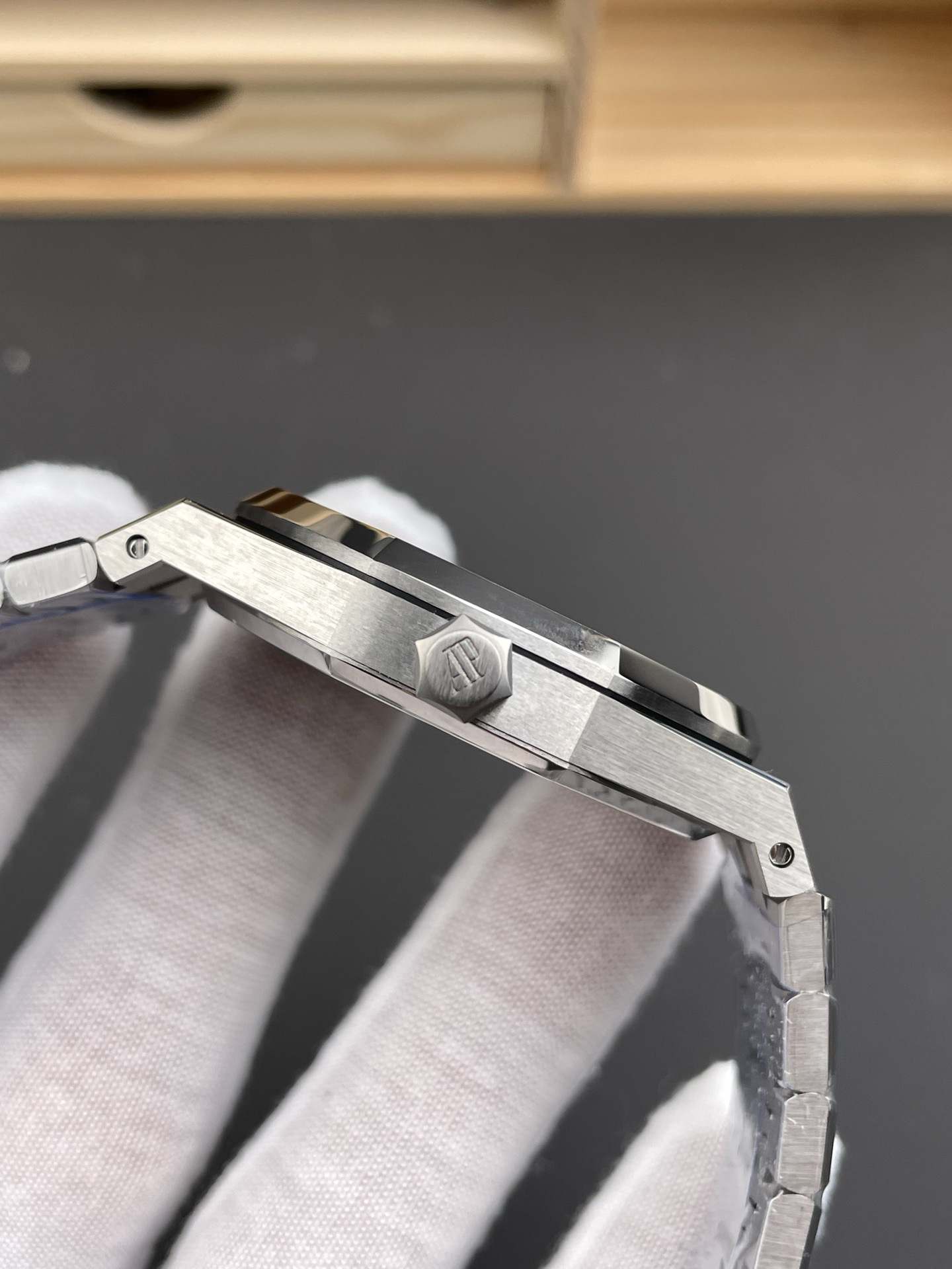 (升级版)NOOB定制版,目前最高版本殿堂级之作--AP皇家橡树系列15400《一体机CAL.3120》。前一代的版本已经是傲视群雄,此次推出的《一体机CAL.3120》是再次向原版看齐,可以说是目前市面上唯一的"版"15400。一体式表壳和八角舷窗表圈,六角螺丝略微凹陷于表壳媲美正品。坦克履带型表带的松紧感和细腻质感与原版相差无恙,弧度流畅。表盘"TAPISSERIE"格纹横竖整齐排列装饰表盘搭配白金荧光立体时标和皇家橡树指针.(以上细节如见实物更是惊艳)。全新研发的一体机CAL.3120 摆轮位置对应正品在7点位置,平面游丝(Flat).甲板上的齿轮与发条盒均真实可动可用。动力储备时间与原版一致的41小时。15400全新全面全升级,让你一见钟情,在喜欢的年纪就能拥有!