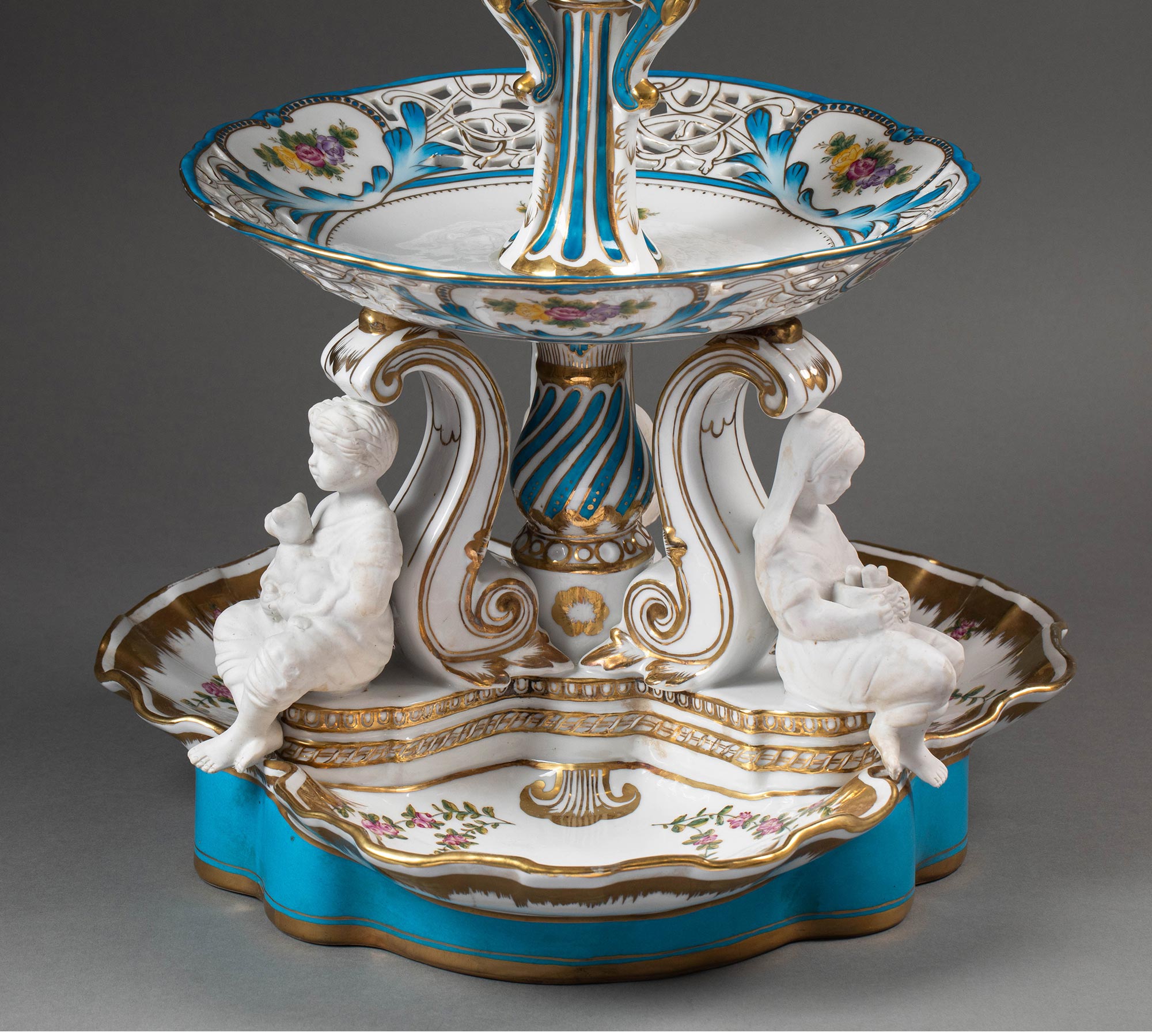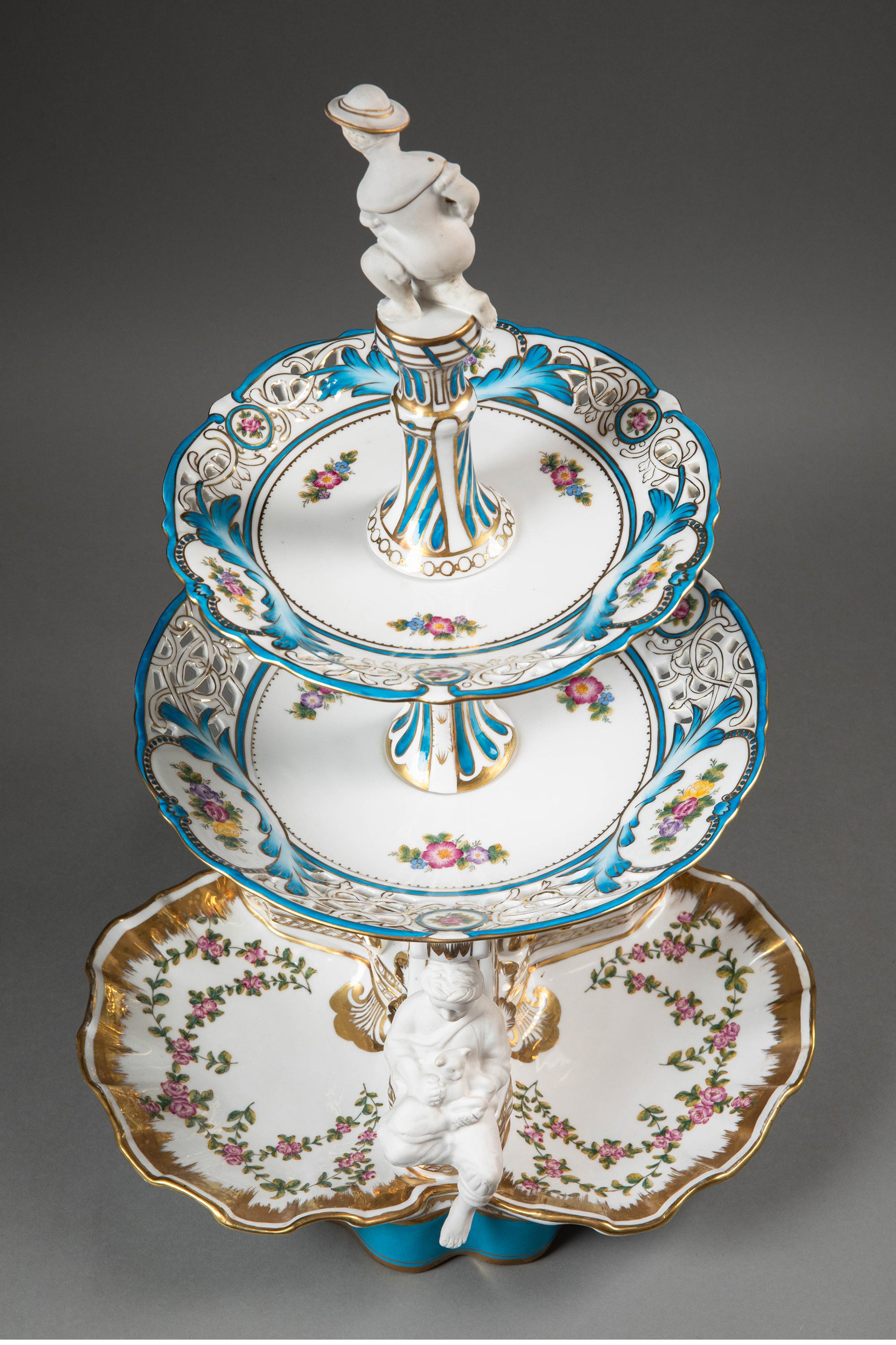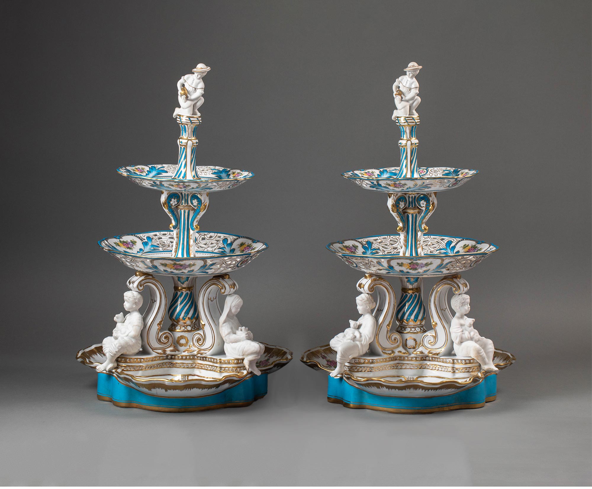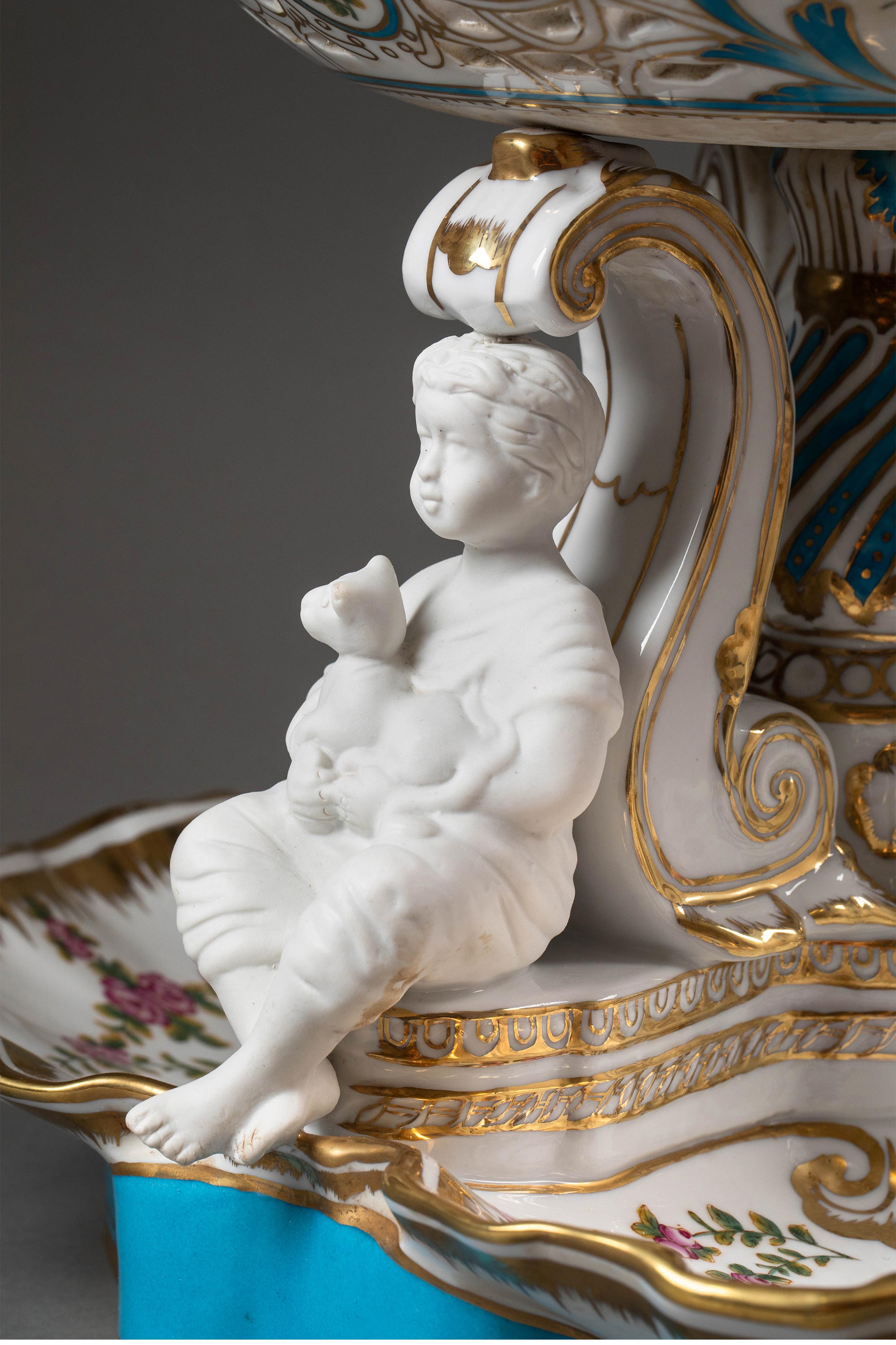 19世纪法国出品孩童人物造型素胎瓷雕装饰古典花叶主题手绘描金多层瓷盘/中央摆件一对