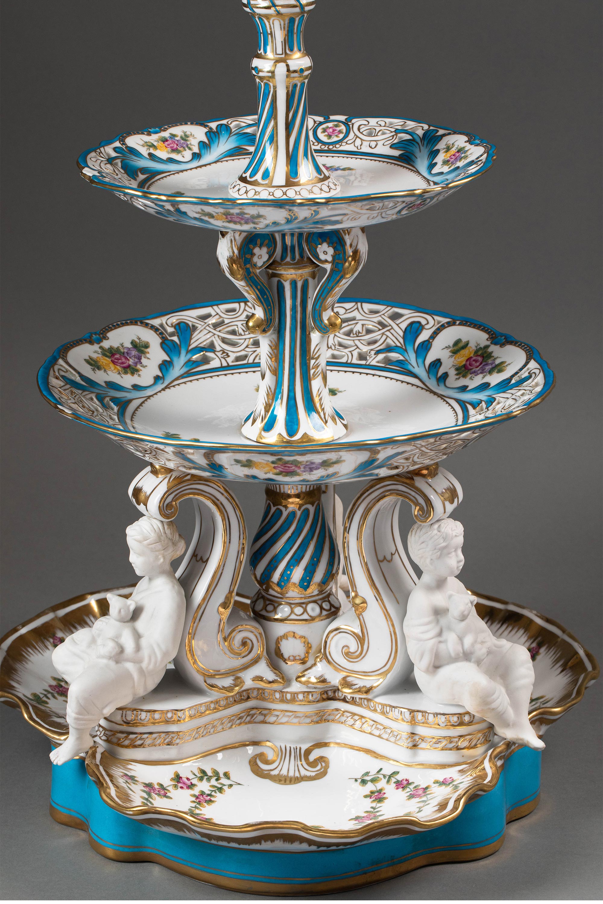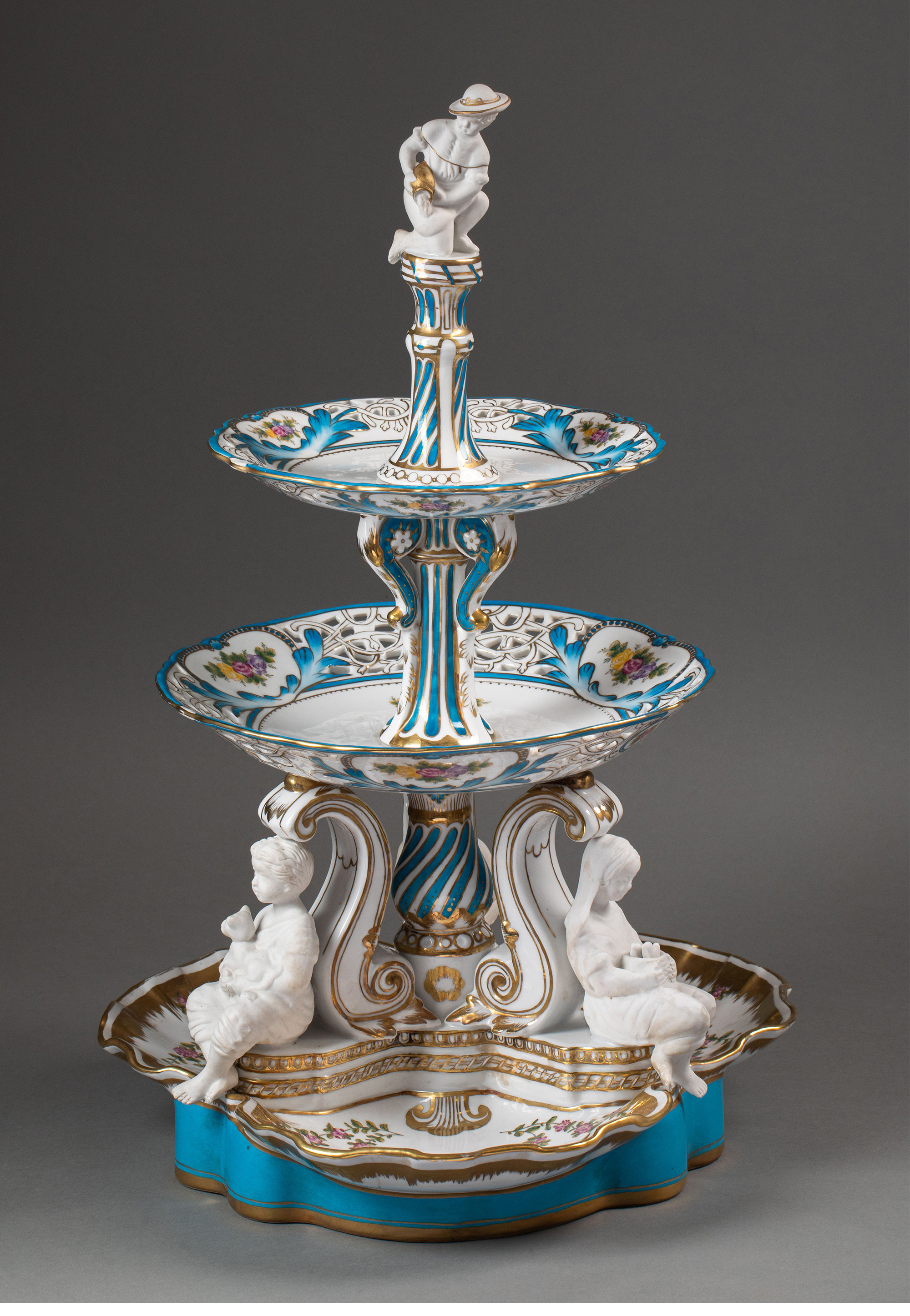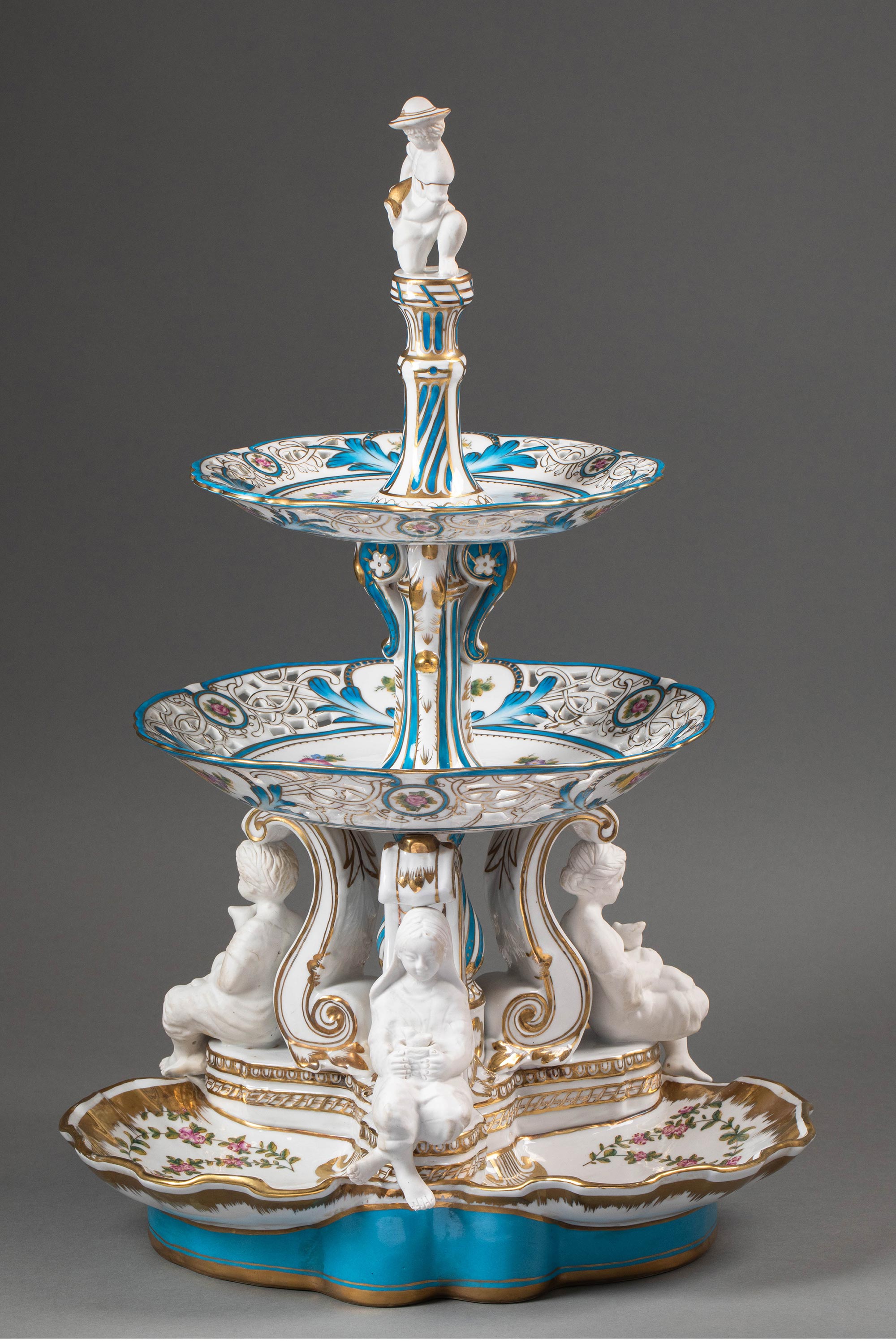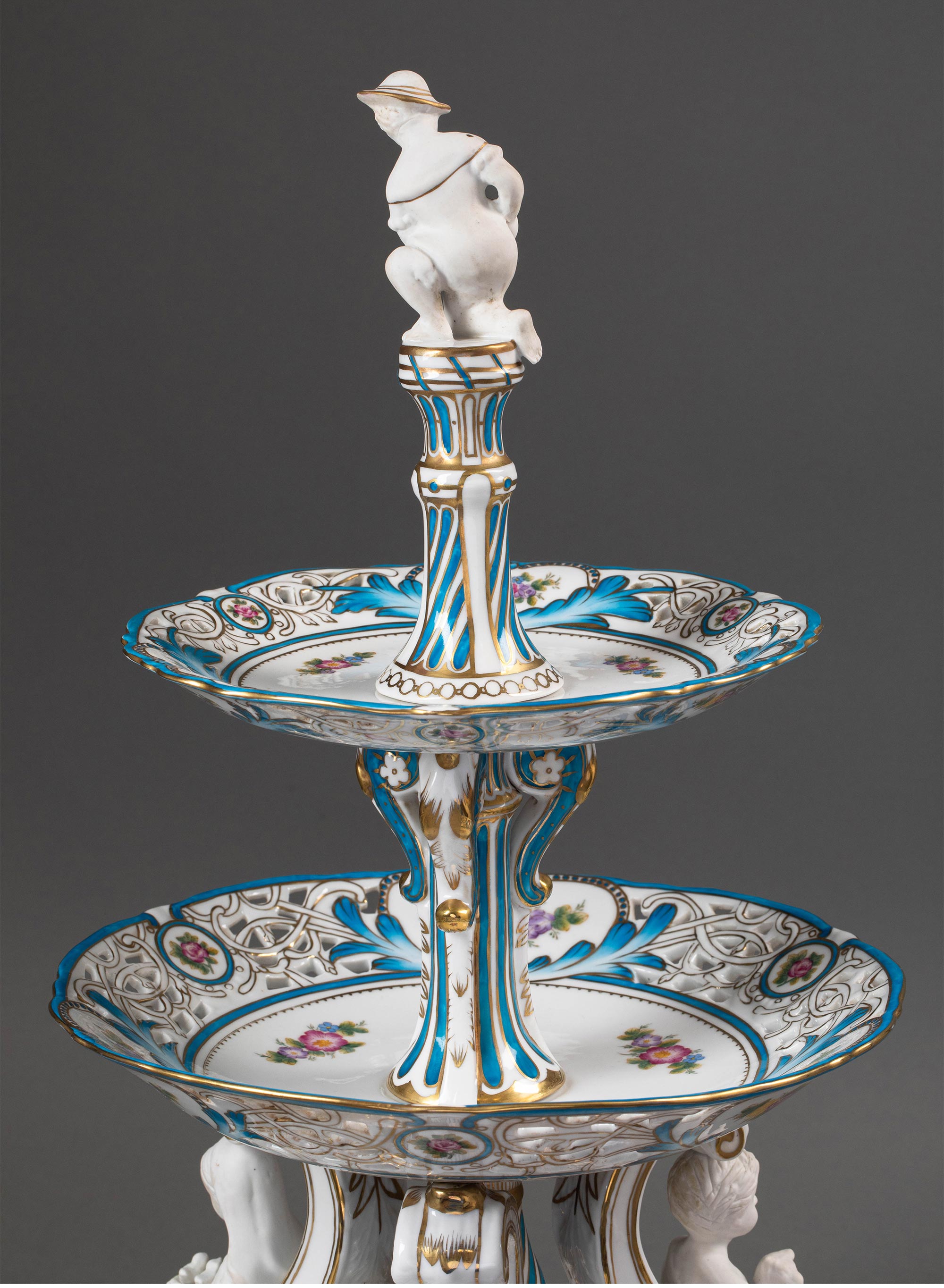 19世纪法国出品孩童人物造型素胎瓷雕装饰古典花叶主题手绘描金多层瓷盘/中央摆件一对