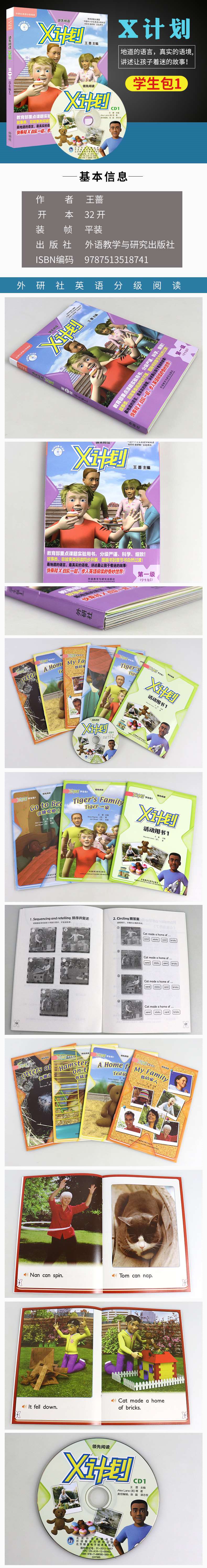 “外研社英语分级阅读·领先阅读·X计划”与已经出版的“丽声拼读故事会”“丽声经典故事屋”“丽声百科万花筒”和“丽声冒险故事岛”同属于一个分级体系。目前已出版10级,每级含6-8册读物,1册《活动用书》,1-2张CD光盘。故事书可用“外研通”点读笔点读,所需声音文件可到外研通网站免费下载。