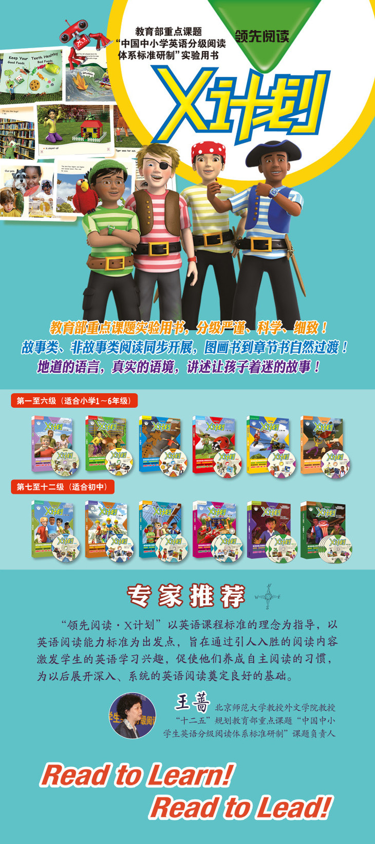 “外研社英语分级阅读·领先阅读·X计划”是全国教育科学“十二五”规划2011年度教育部重点课题“中国中小学生英语分级阅读体系标准研制”的实验用书,旨在给广大中小学生提供一套跨学科的英语分级阅读读物,帮助学生全面提升听、说、读、写的能力,养成自主阅读的习惯。