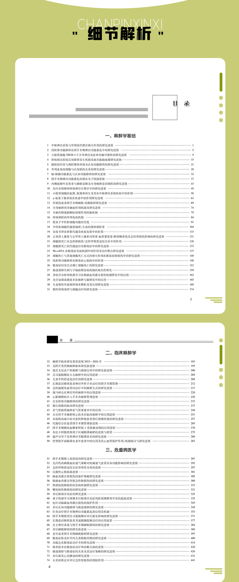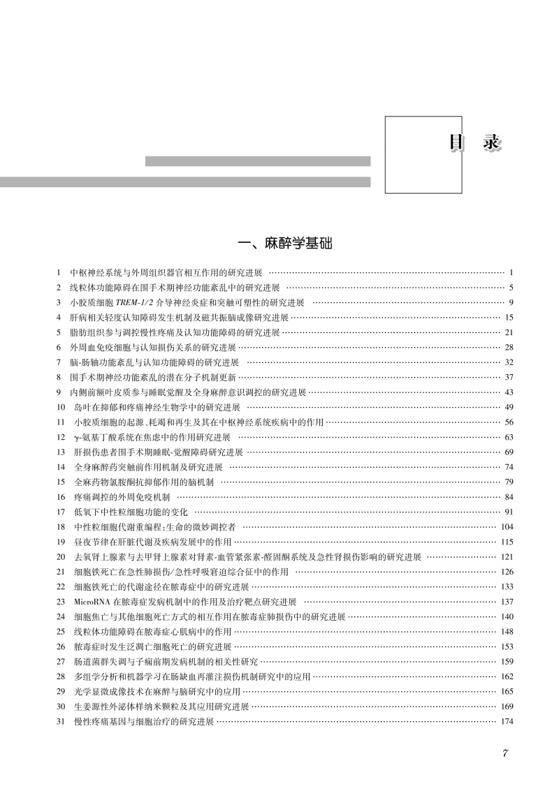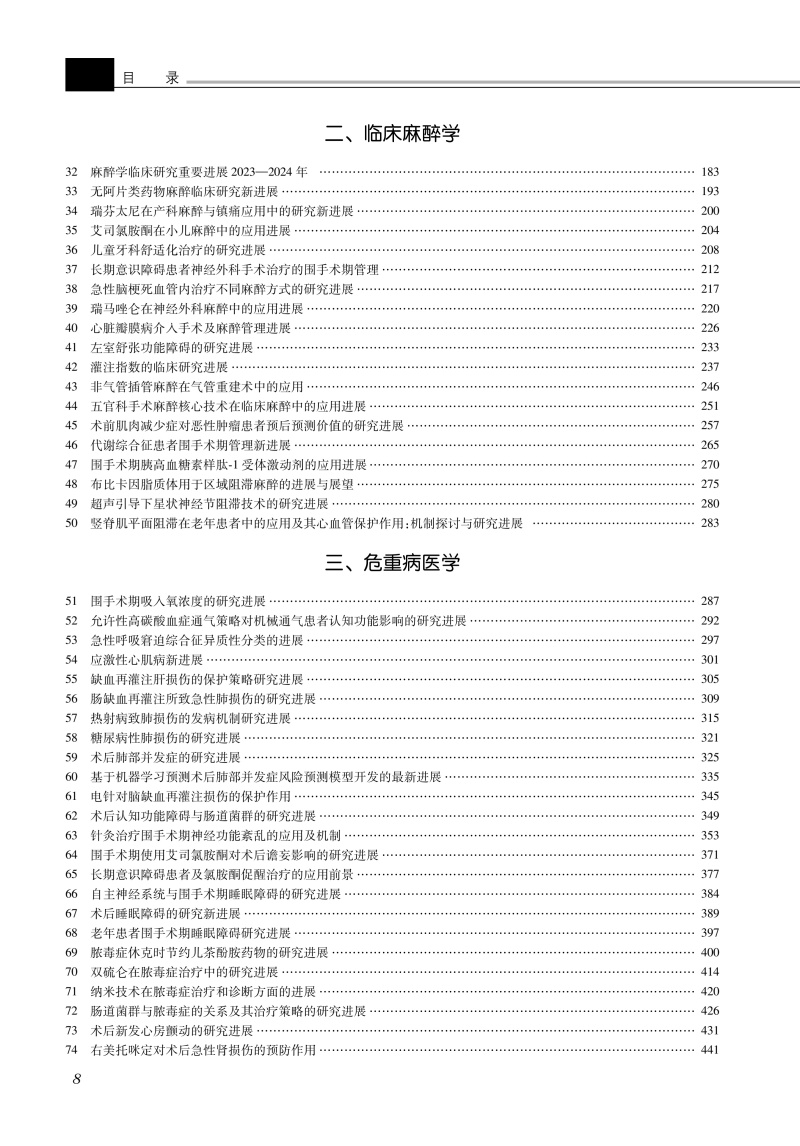 内容涉及麻醉学基础、临床监测、临床麻醉、危重病医学、疼痛诊疗学、麻醉学科建设等多个方面。全面系统地介绍了每个领域的最前沿的知识热点,理论联系实践。为麻醉学科的建设提供了更多的学术理论和实践的素材。《2023麻醉学新进展》仍然秉承了一贯的编撰风格,对入选稿件的遴选侧重近两年麻醉学领域重要研究的进展、新技术的运用和新理论的实践。上一辑新设立的“学科建设与管理”板块篇幅有所增加,本辑又增设了“麻醉学教育”板块,充分体现开展学科建设与教育传承逐渐成为开展临床麻醉与基础研究工作之外的又一工作重点。随着信息技术的发展和麻醉学地位的日渐突出,虚拟现实技术、人工智能理念已经潜移默化地影响了麻醉学的日常工作,这些“新进展”在本辑内容中均有所体现。