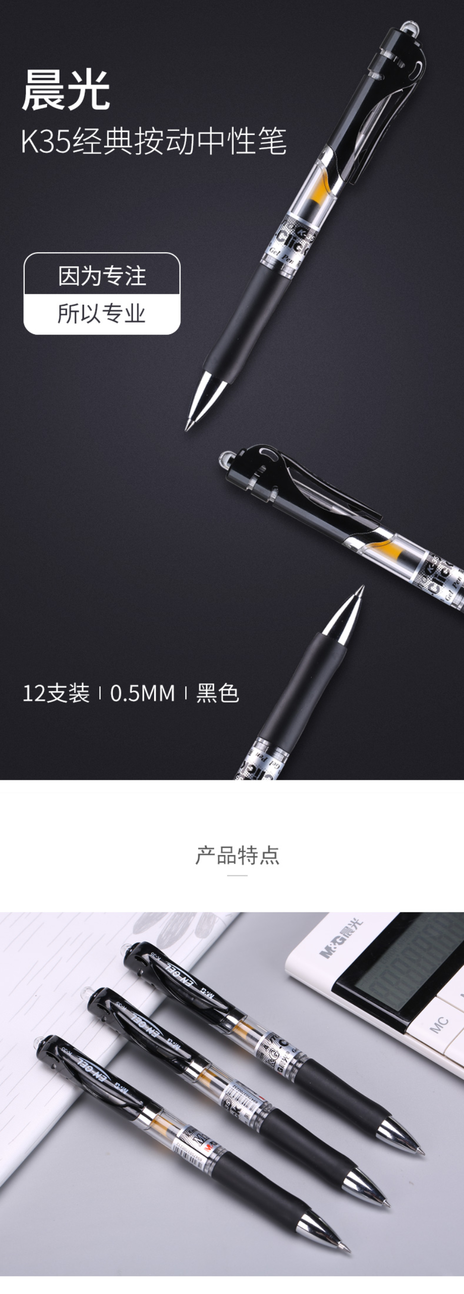 晨光(M&G)文具K35/0.5mm黑色中性笔 按动碳素笔 经典子弹头签字笔 办公用水笔 12支/盒