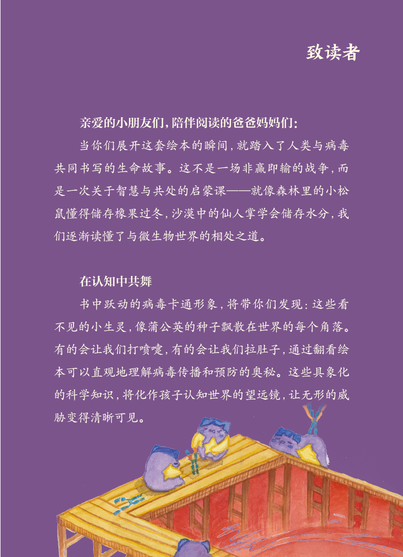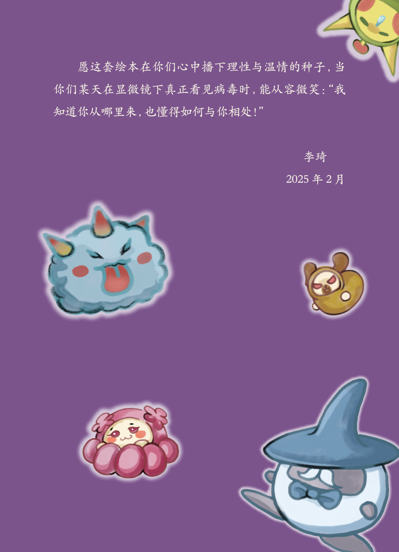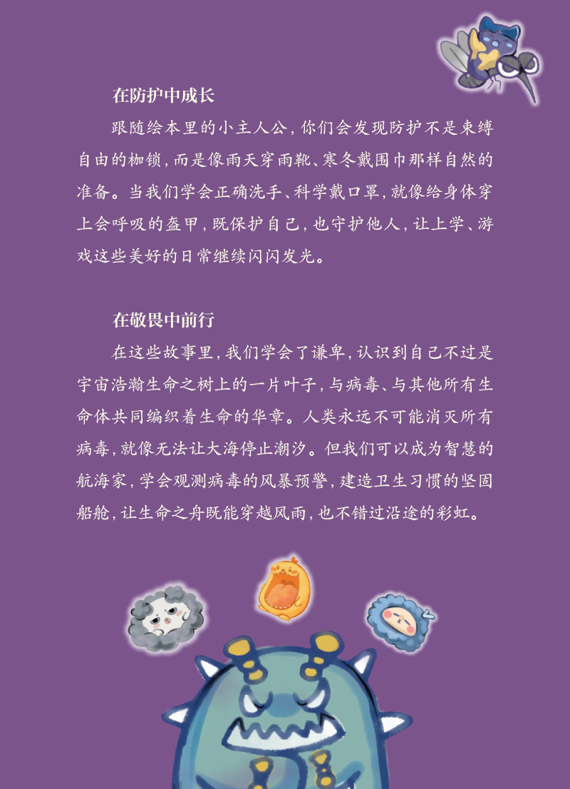 1.“病毒快走开”科普绘以常见传染病病毒电镜图为原型设计卡通IP形象,以“提升公众疾病预防和卫生应急能力”为主旨,联合医疗卫生、绘本领域相关专家、艺术家,创作便于学龄前至学龄期儿童少年理解的科普绘本。 2.绘本内容涵盖公众日常生活中可能接触到的乙肝病毒、戊肝病毒、麻疹病毒、脊髓灰质炎病毒、人乳头瘤病毒、狂犬病毒、水痘-带状疱疹病毒、诺如病毒、流感病毒、登革病毒的传播与预防相关知识,让大家在轻松愉悦的氛围中学习和巩固医学知识,提高大众的健康素养水平。