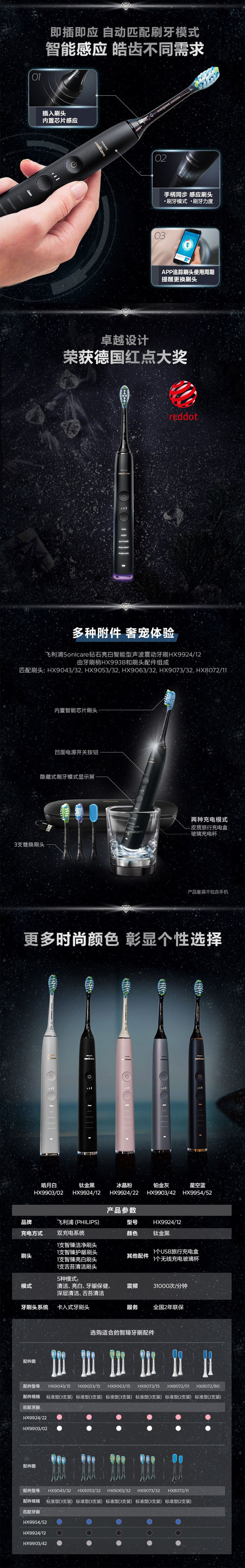 飞利浦Philips电动牙刷 蓝牙版 成人声波震动钻石系列 钛金黑 HX9924/12