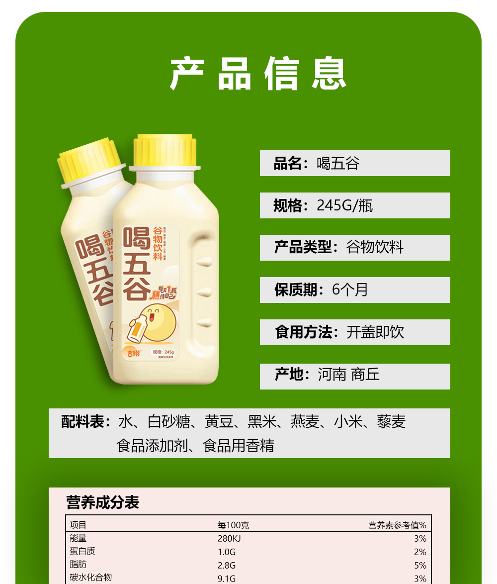 【醒粉福利29.9元10瓶】吉翔喝五谷谷物饮料 五种粗粮研磨,高纤高蛋白