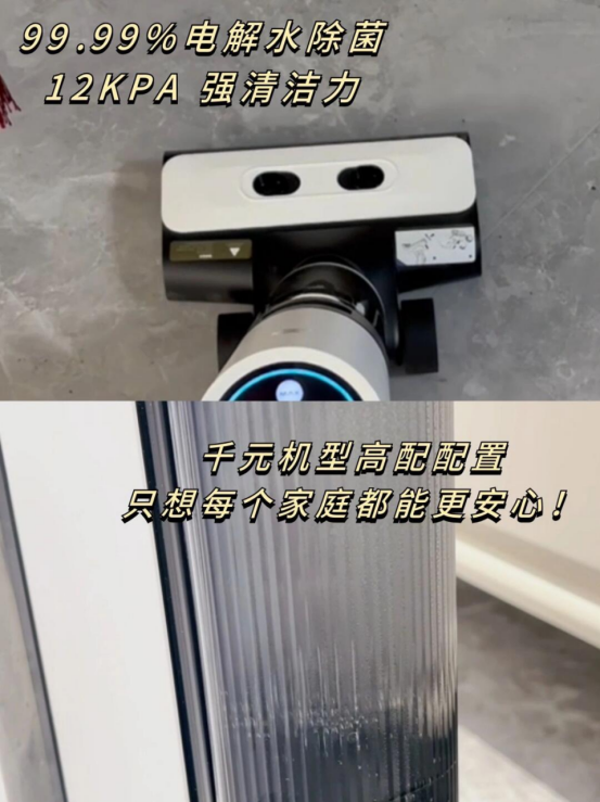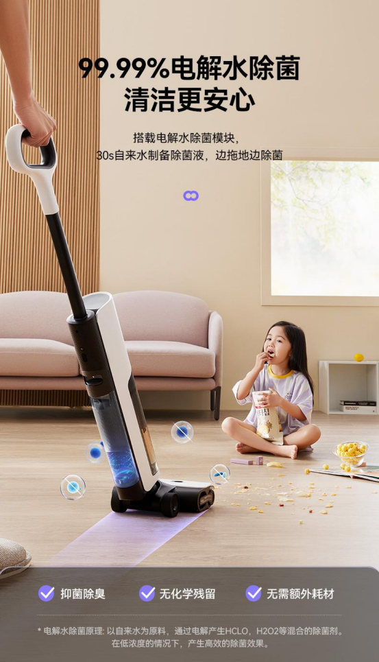 ✅99.99%电解水除菌 消杀地面病菌因子 搭载电解水除菌模块,以自来水为原液,自制备除菌液,边拖地边除菌 全流程除菌自清洁,深度清洗管道、滚刷、水箱! 带给你更放心,更安心的生活体验~