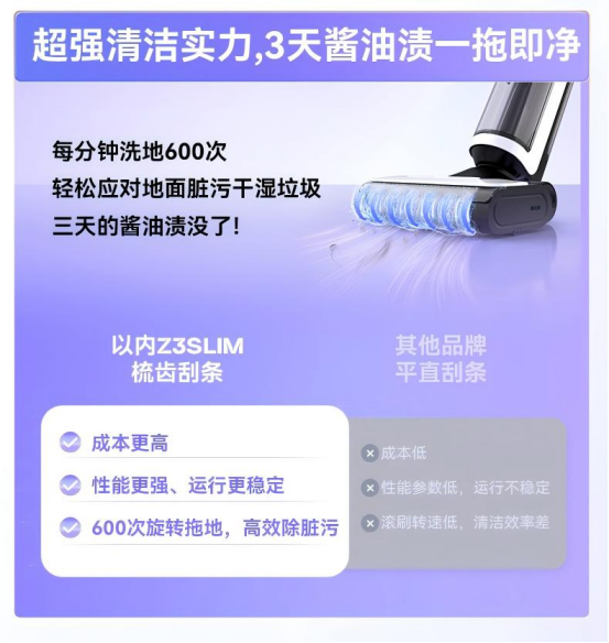 今天给大家带来一款性比价拉满的洗地机霸主 以内旗家的性能王者【INXNI以内三合一无线智能洗地机Z3silm】 ✅700元不到的价格,配置超过2.3千元的品质 高速无刷电机带来的12000pa吸力 远远超过那些对标产品 ✅一分钟洗地600次,去除顽固污渍,不留痕迹 不管是地上的灰尘、毛发,还是厨房的油渍、水渍 只要推着洗地机走一遍,就能吸得干干净净 一点都不残留,清洁起来轻松又高效