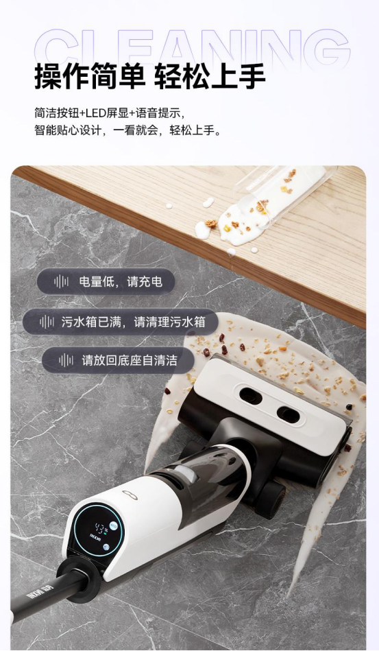 ✅整机还采用了IPX4级防水,清洗更方便,机器更耐用 其中与水渍接触频繁的拖地模块防水可达IPX6级 适用各类干湿清洁场景,清洗更方便 ✅智能LED大屏搭载语音提示,功能清晰易懂 操作简单易上手,家里男女老少皆能轻易上手 四大模式,节能、强力、吸水、除菌,一应俱全
