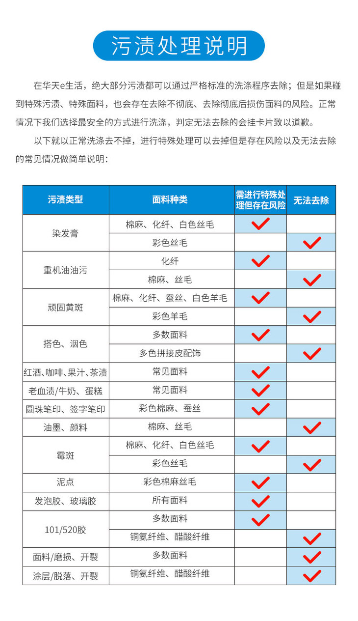 ①衣服类:皮毛类、真丝和蚕丝类、婚纱、晚礼服、皮布相间/涂层材质/涂层装饰的衣服、压胶的衣服、带珠/钻/亮片/刺绣的衣服。衣物上的毛领、配饰(请自行取下)