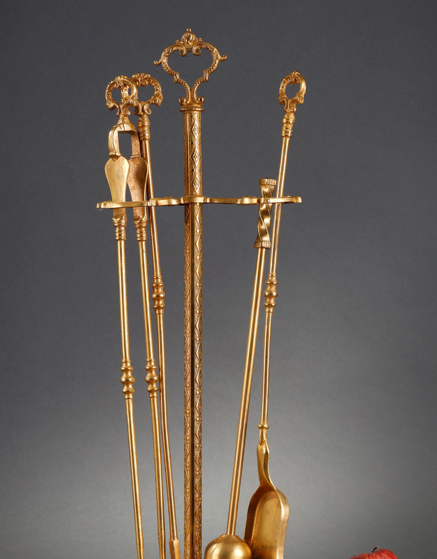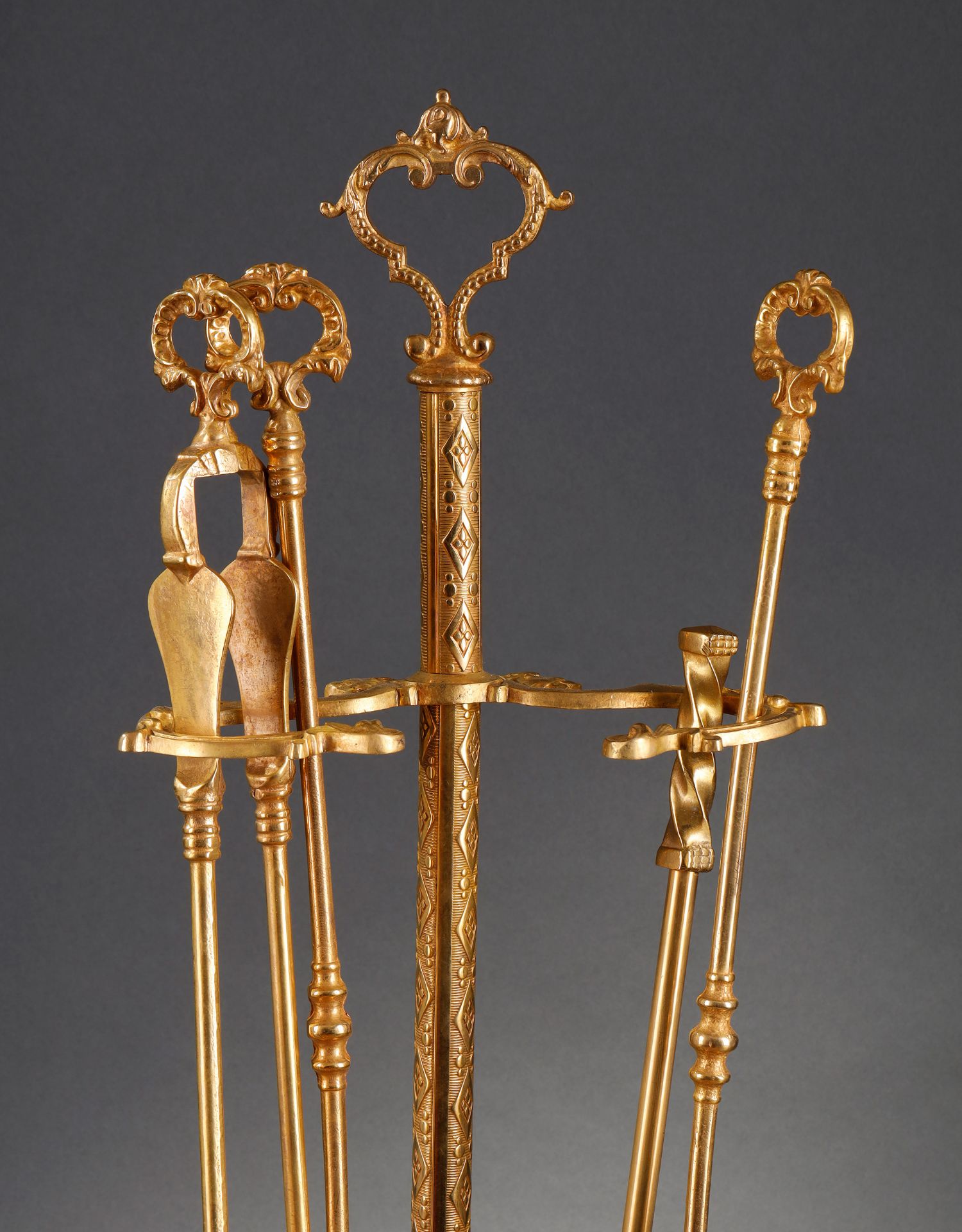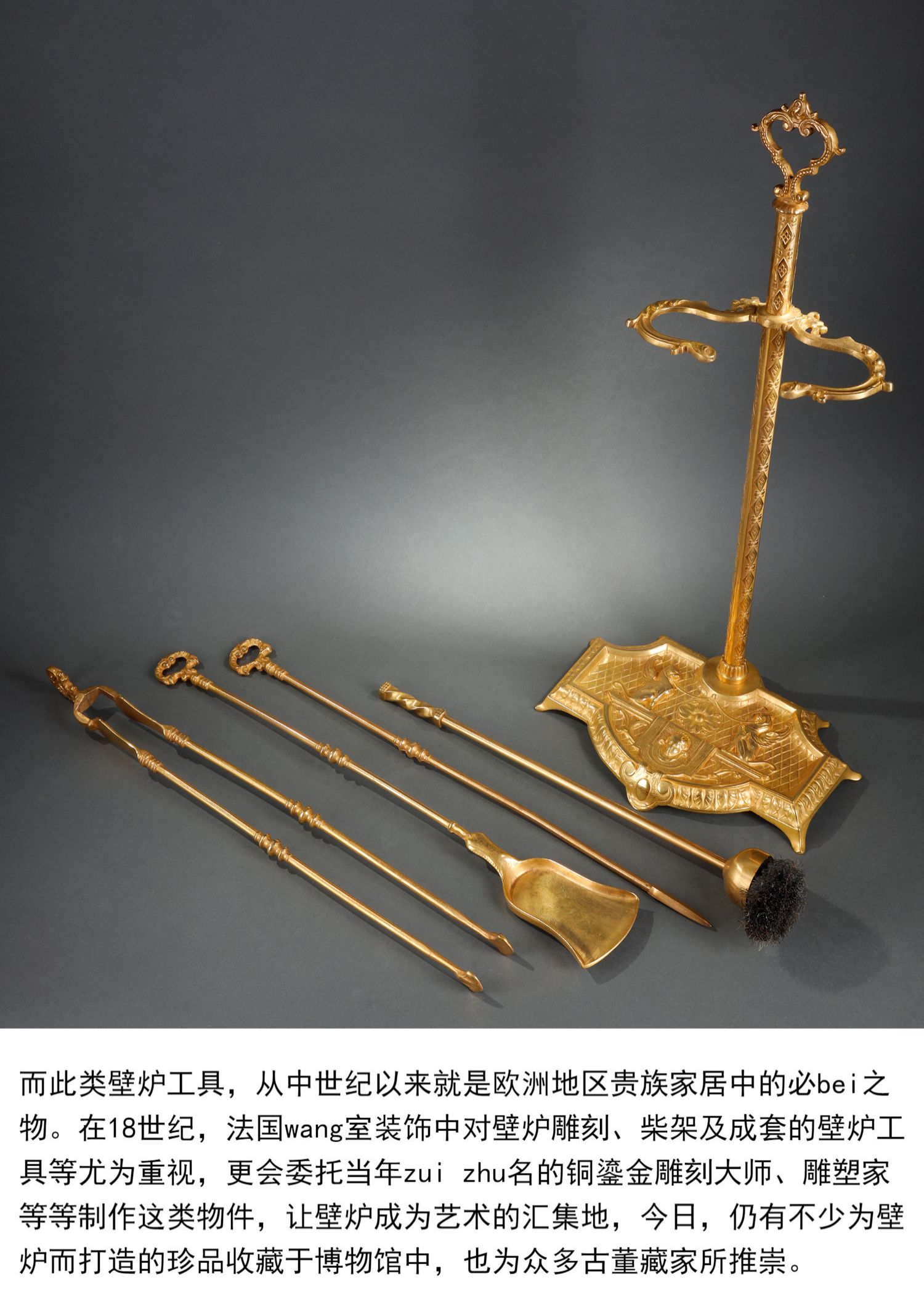 独角鹿西洋古董法国路易十六风格茛苕造型精雕铜鎏金壁炉工具套件