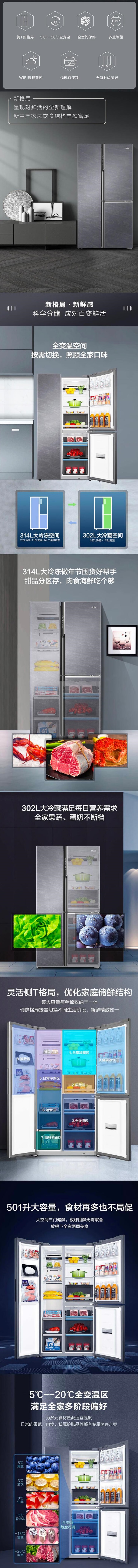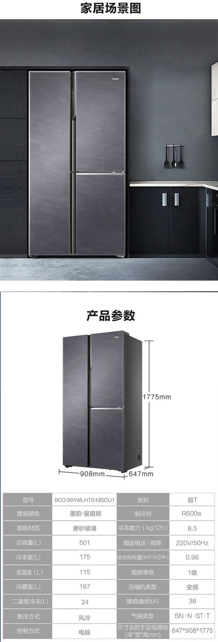 海尔冰箱(202585 )双系统侧T三门全空间保鲜科技超薄家用干湿分储双变频一级能效冰箱BCD-501WLHTS19SCU1[家电]