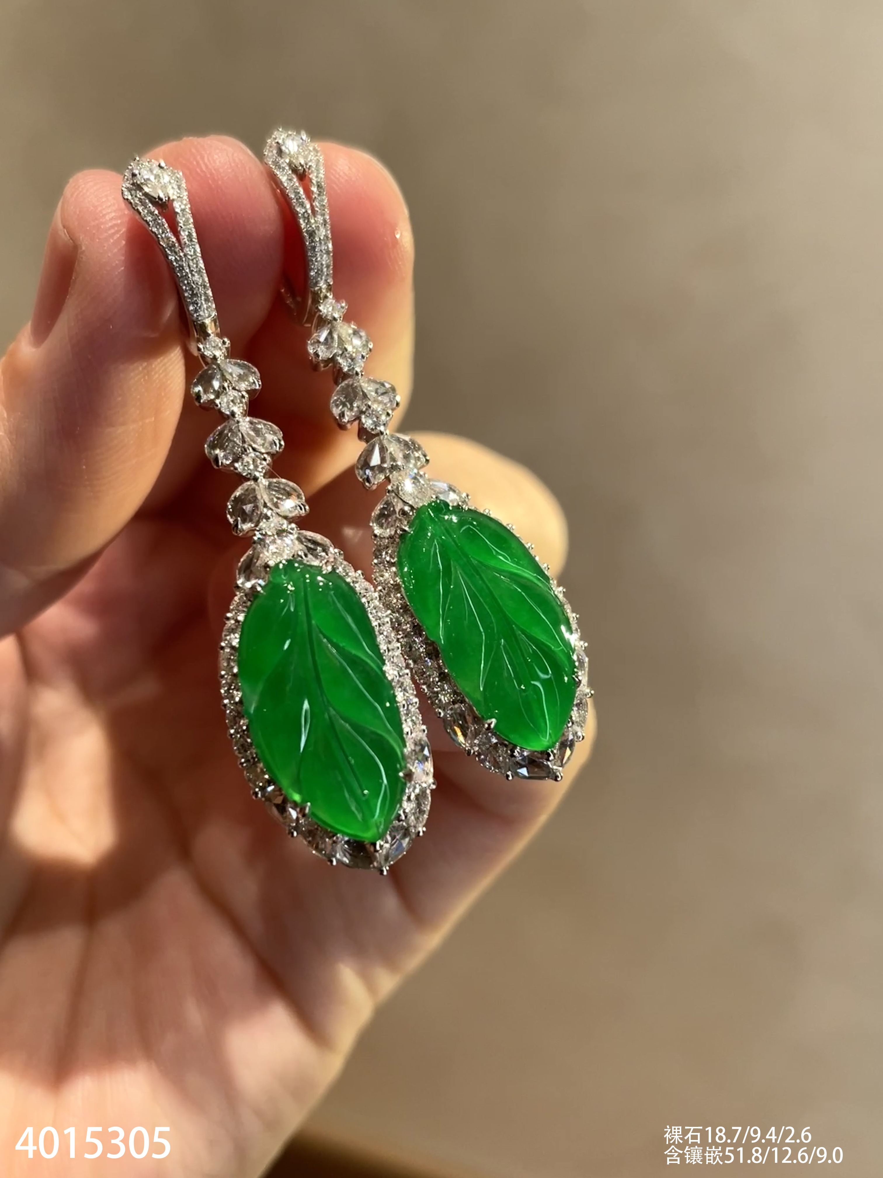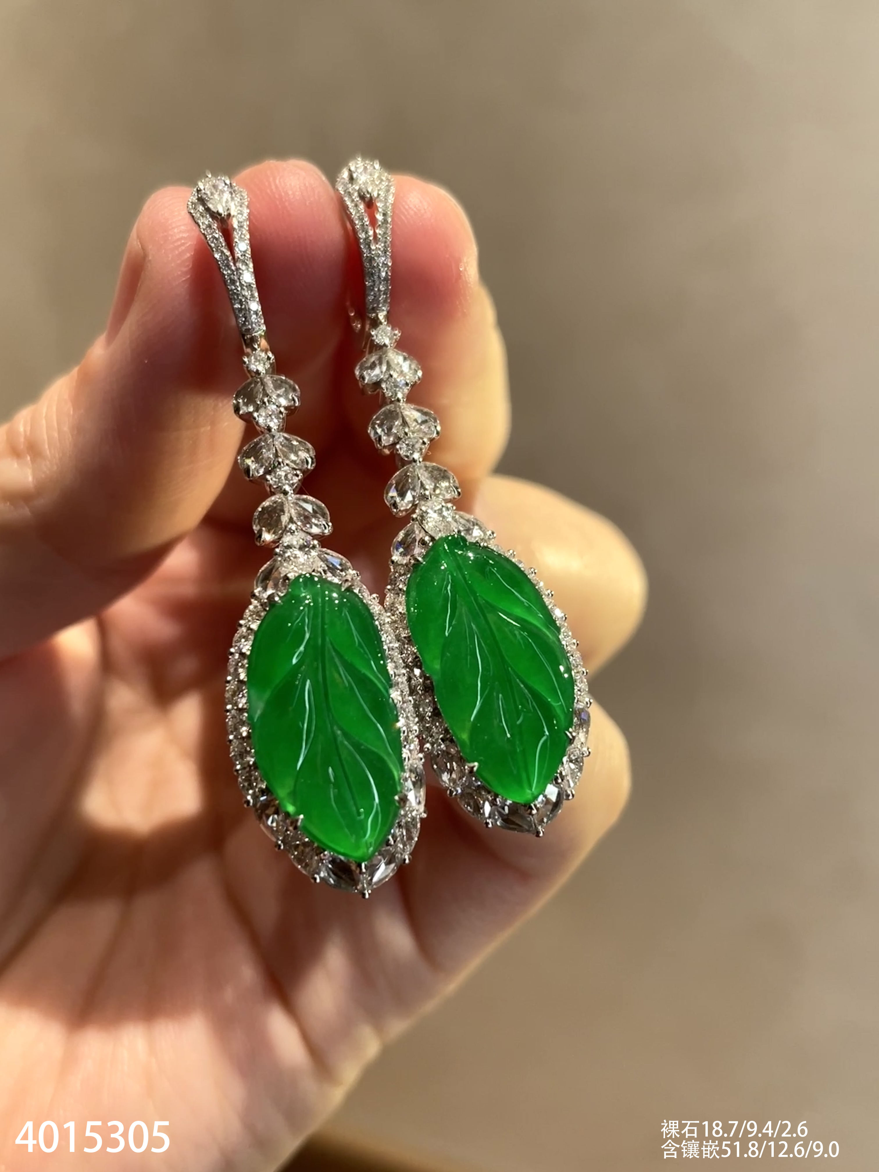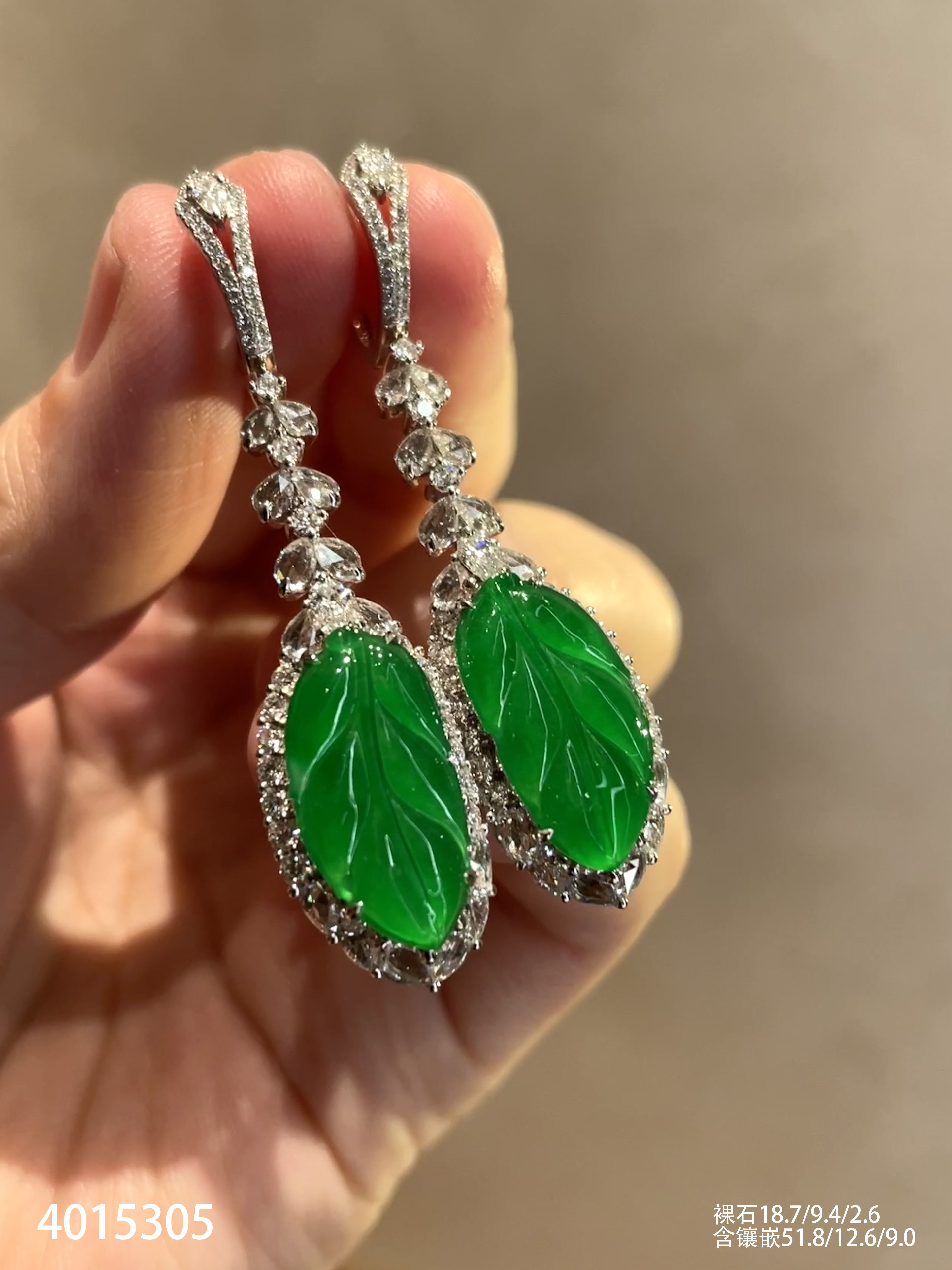 老坑玻璃种艳绿叶子耳坠【4015305】具体价格微信咨询